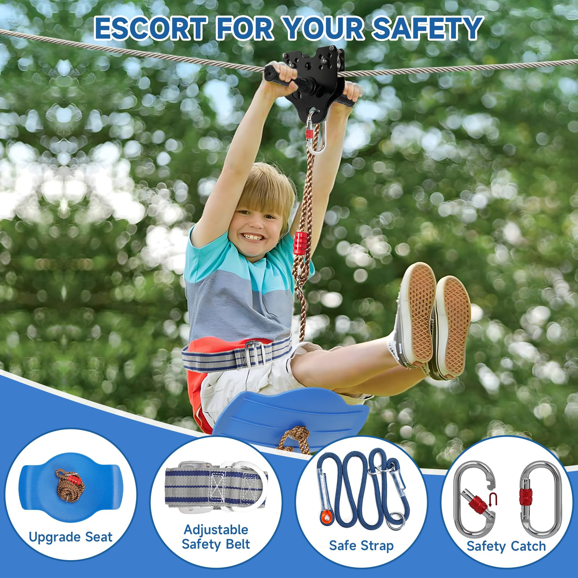 120FT Zip Lines for Kids and Adults with Rust Proof W/Safety Harness,Stainless Steel Zip Wire Toy for Backyard Outdoor Play Equipment up to 350 Lbs