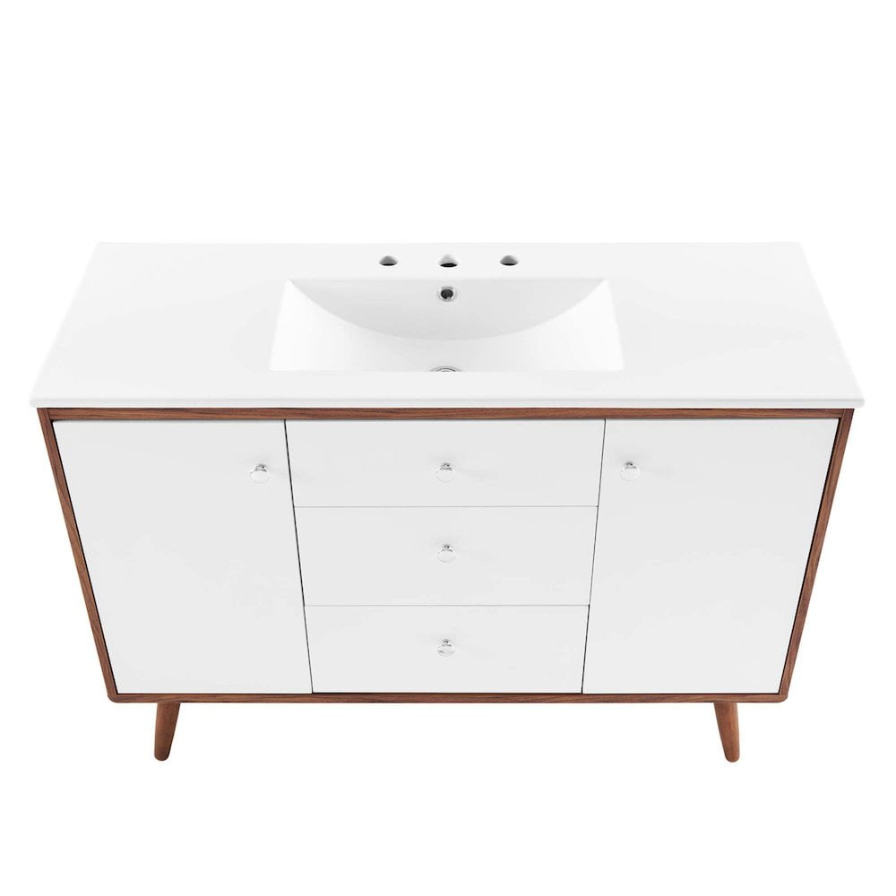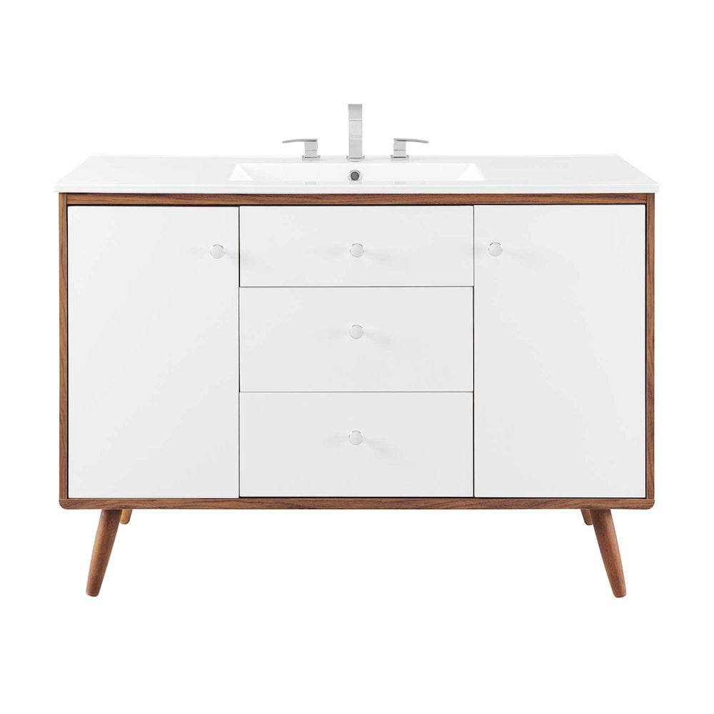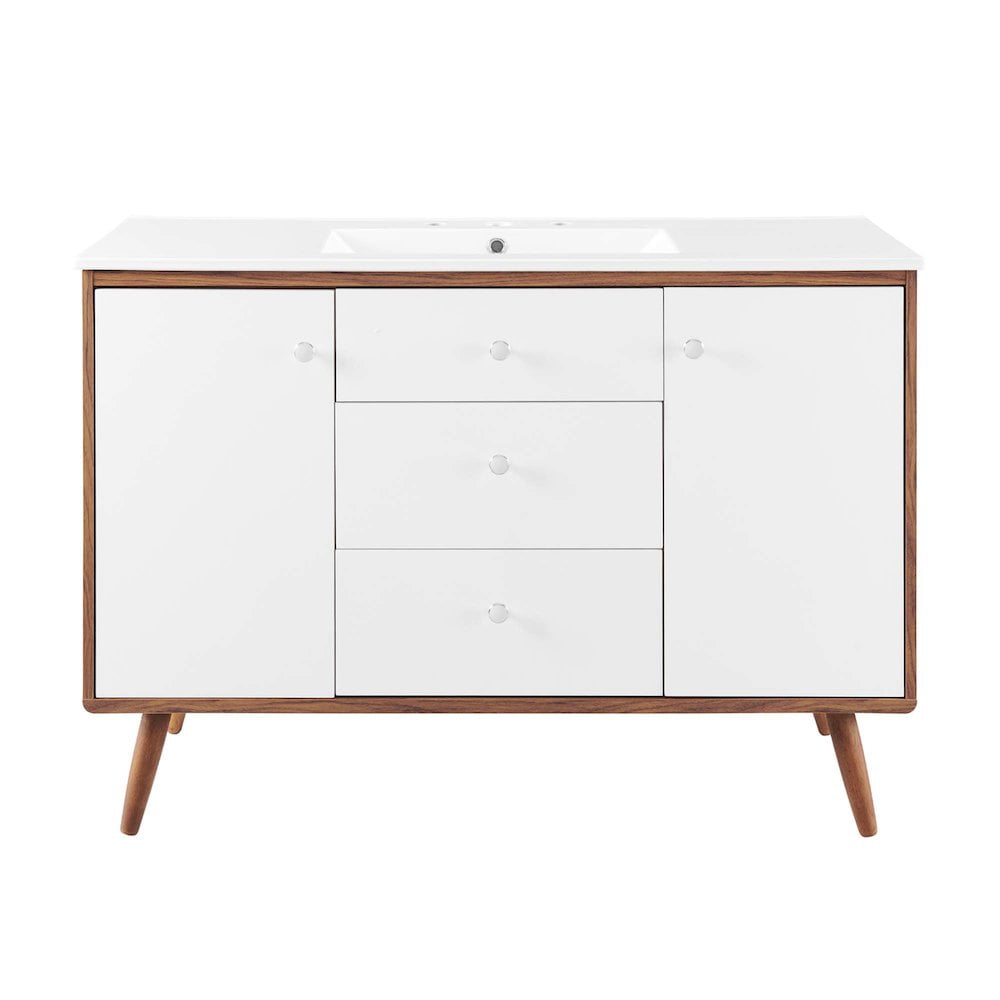 Material: Wood, ceramic Finish: Walnut, white Splayed wood legs Ceramic sink basin Particleboard and walnut grain veneer Dual soft-close doors Full-extension drawers