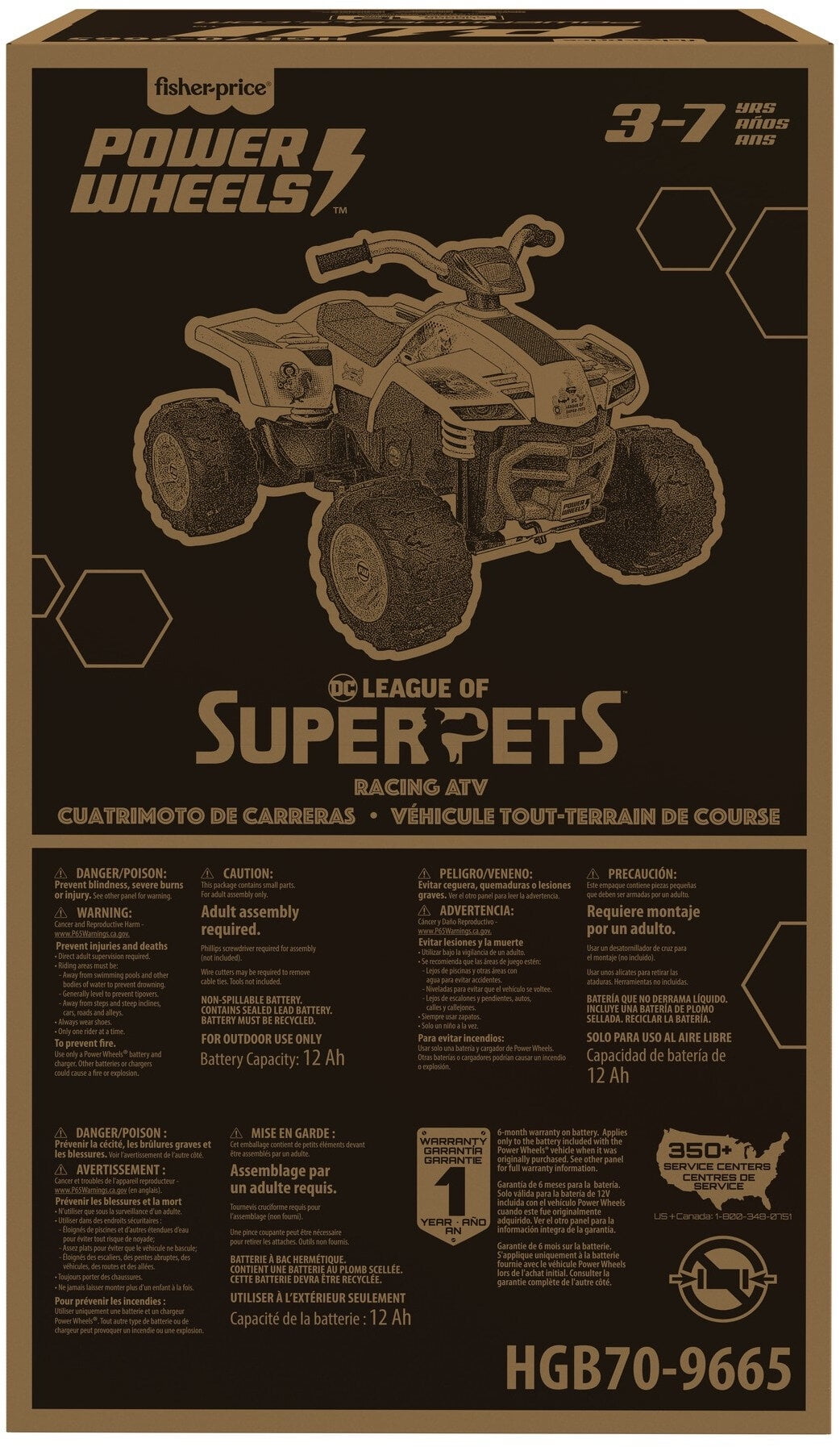 Battery-powered ride-on ATV with cool DC League of Super-Pets graphics Drives 3 and 6 mph (4.8 and 9.6 km/h) max. forward; 3 mph (4.8 km/h) max. reverse Vehicle drives on hard surfaces, grass and other rough terrain Parent-controlled, high-speed lock out and Power-Lock brakes For preschool kids ages 3-7 years. Seats 1, max. weight 65 lb (29.5 kg)