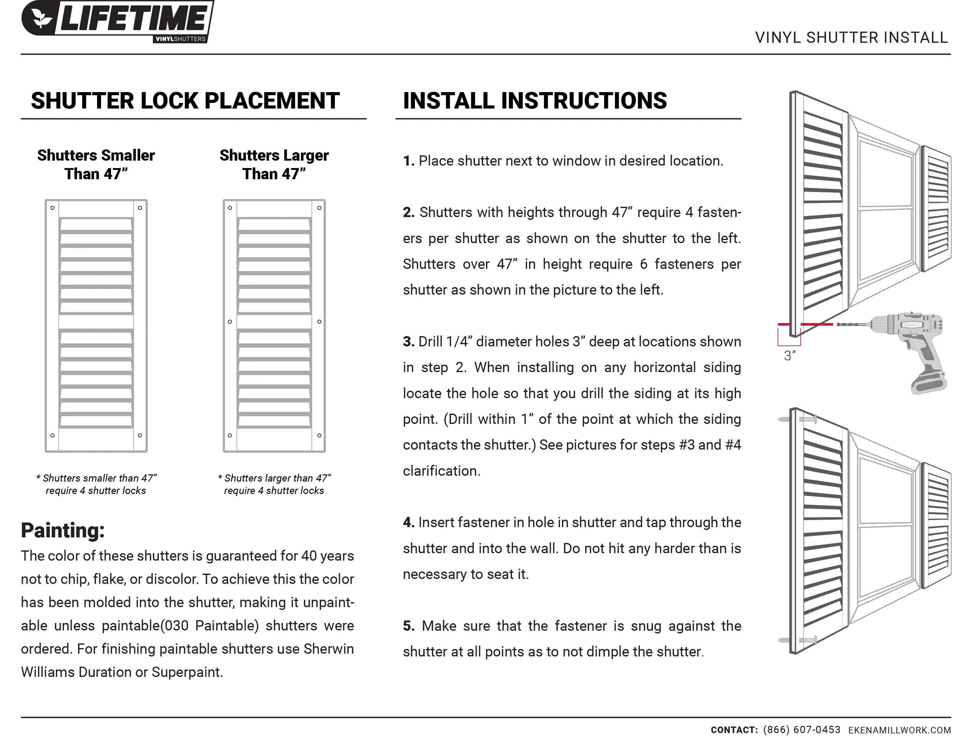 Includes pair of shutters and color-matching hardware Easiest installation – installs in minutes with included hardware Due to materials, widths and lengths are nominal +/- 1/2″ Durable construction features molded-through color and crisp woodgrain texture Vibrant colors for a lifetime of beauty Limited lifetime warranty