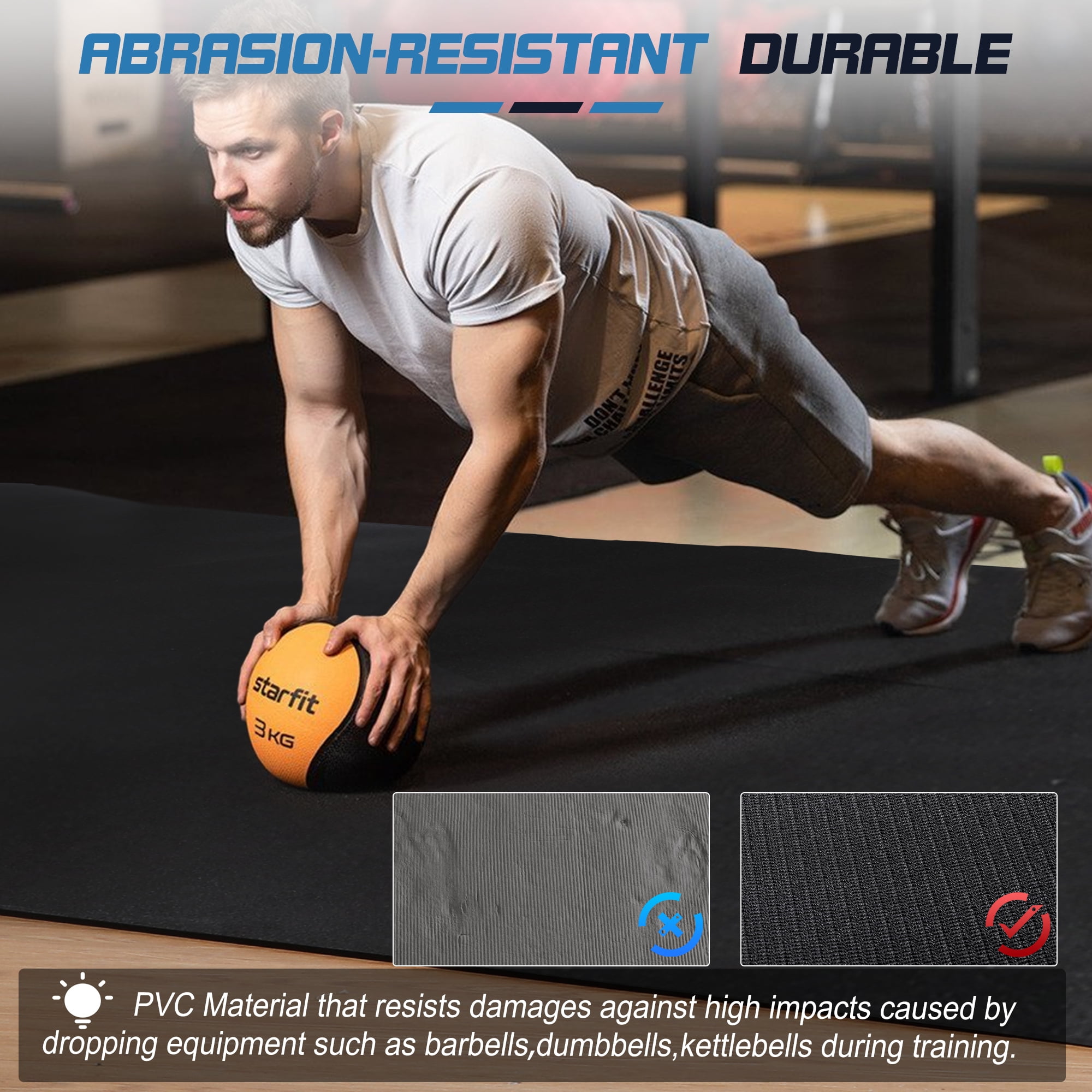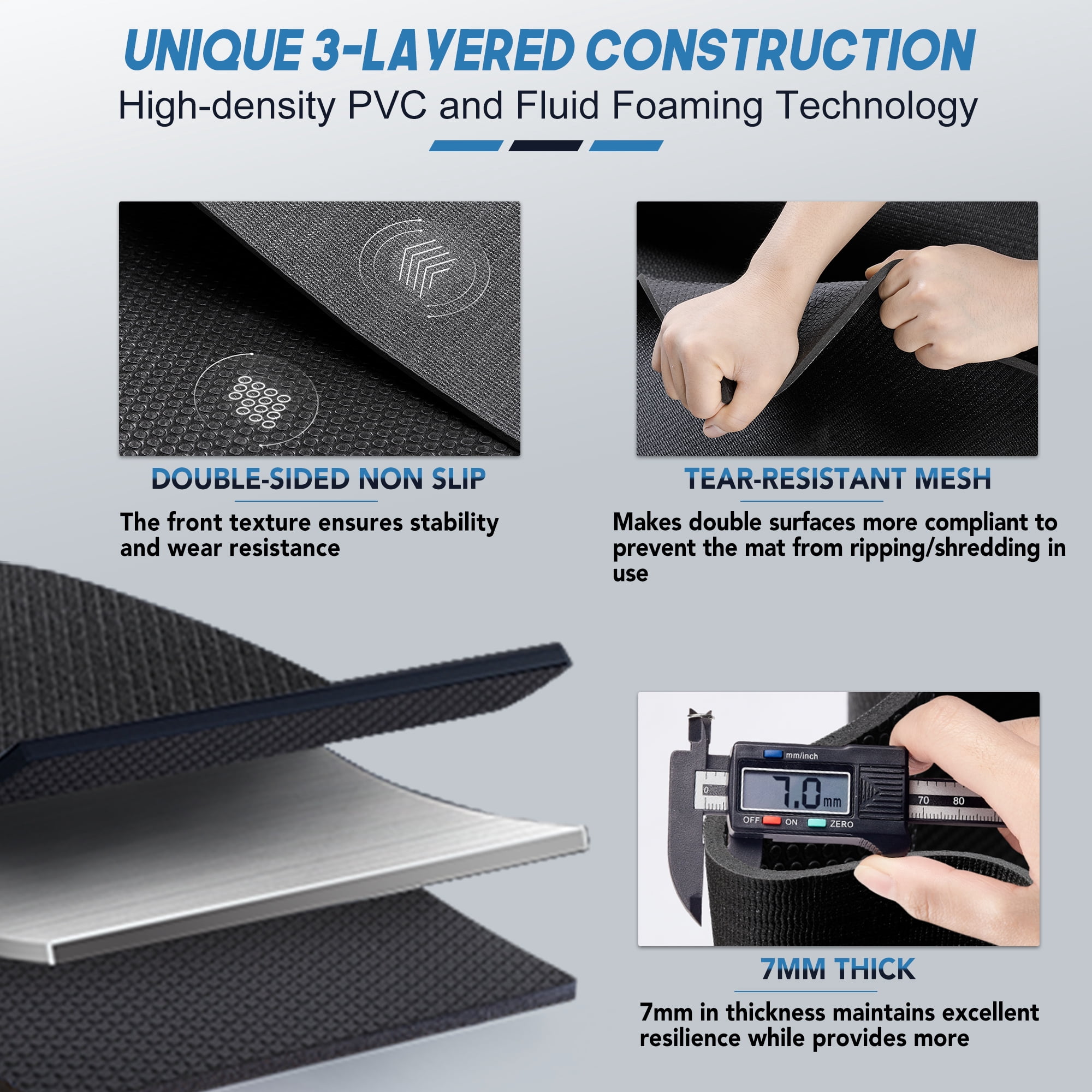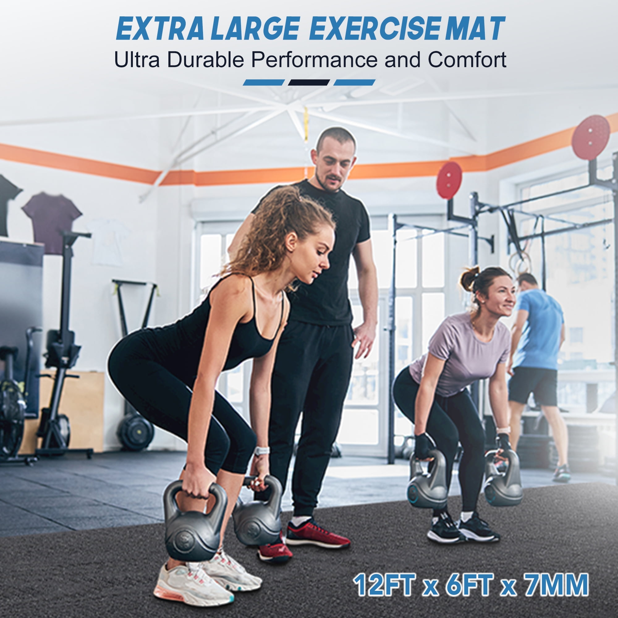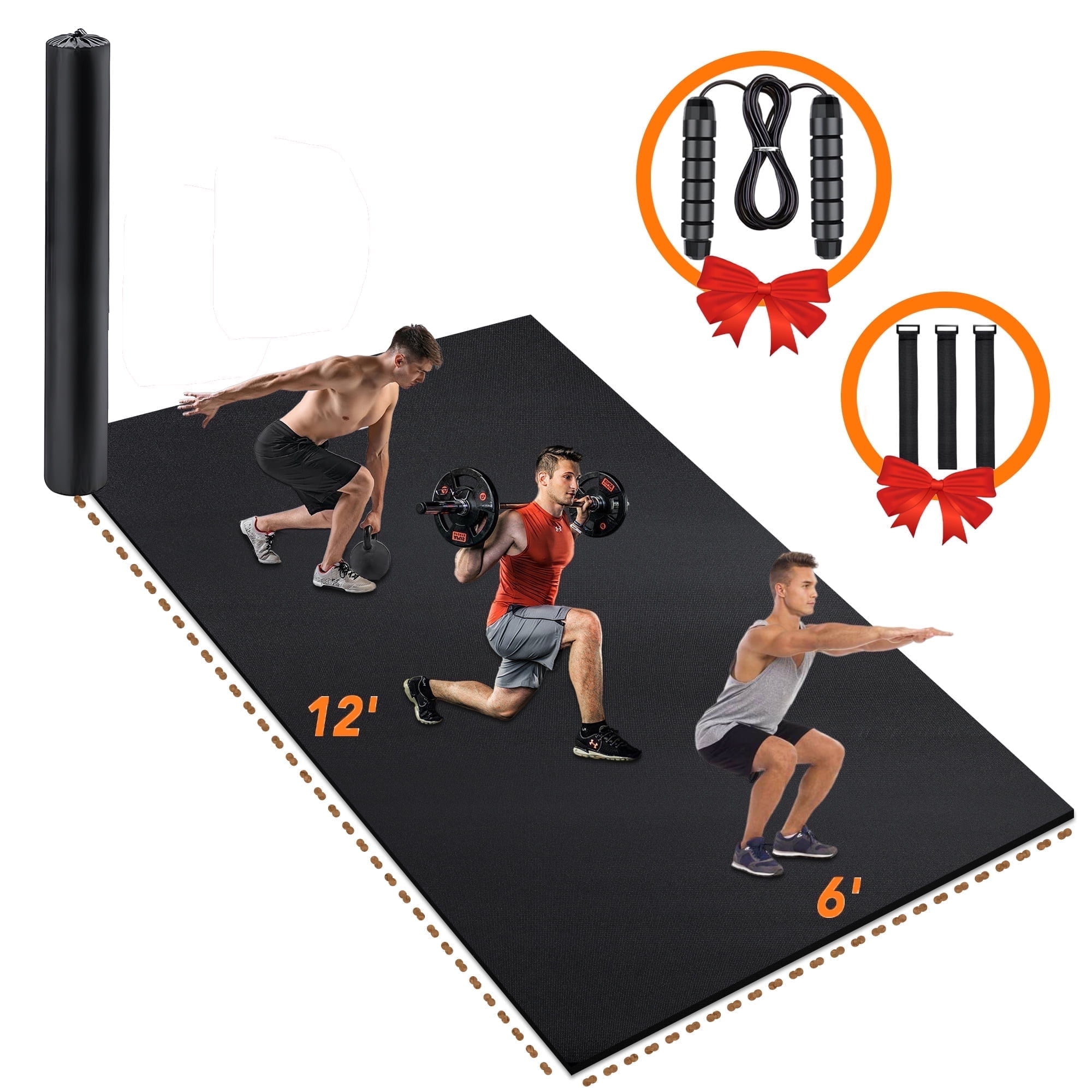 ????EXTRA-LARGE EXERCISE MAT IS COMING! GIVE YOU A WIDE SPACE TO MAKE EVERY EXERCISE ENJOYABLE Tear-resistant, non-slip, shock-absorbing, non-toxic The fitness mat has an area of 48 square feet, giving you more possibilities for high-intensity activities. You will have enough space to move freely and stretch to the maximum. The extra-wide and extra-long fitness mat can meet all your daily exercise needs. You can put it in the garage, basement, living room, bedroom and anywhere in your home. Unfold the fitness mat to turn any room into a home gym. ????【Product Benefits】 ✅Excellent Cushioning: This fitness mat has a thickness of 7mm, which can provide excellent cushioning for your palms, knees, wrists and ankles. It reduces the risk of sports-related injuries and provides a comfortable landing surface. ✅Waterproof: The closed cell surface prevents moisture and sweat from penetrating into the mat and does not produce odor. When water drips onto the mat, just wipe it gently. ✅Anytime, Anywhere: Whether you are exercising on wooden floors, carpets, concrete or tiles, the non-slip design on the bottom provides maximum grip to prevent the mat from sliding. The fitness mat can also protect your joints and reduce noise. ✅Double-sided anti-slip: The front texture is stable and wear-resistant ✅Tear-resistant mesh: Makes both sides more supple to prevent the mat from tearing/shattering during use ✅7MM thickness: 7mm thickness maintains excellent elasticity while providing more ????【Uses and scenarios】 Fitness training (such as push-ups, sit-ups and planks), gymnastics and yoga, children’s games, sports training (agility training, jumping exercises, crawling, etc.), physical therapy, group fitness classes, martial arts training, recreational activities, physical education classes, family exercises, outdoor activities, entertainment centers and public places, exhibitions and demonstrations, mental health activities ✔【Package Contents and Specifications】 Contents: 1 x high-density fitness mat 3 x resistance bands 1 x high-quality storage bag 1 x skipping rope Specifications: Thickness: 7 mm Weight: 41 pounds Material: high-density polyvinyl chloride (PVC) Coverage area: 48 square feet Size: 12 x 6 feet ????Warm Tips: 1. To clean the exercise mat, just wipe it with a damp towel and place it in the shade to dry. 2. When using the mat, please avoid sharp objects from touching the mat. We always insist on putting customers first, if you encounter any problems related to the exercise mat, we will provide you with fast online professional customer service.