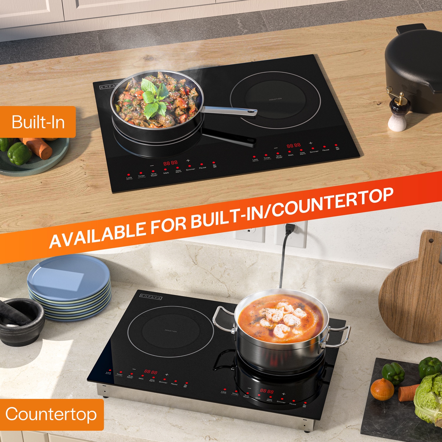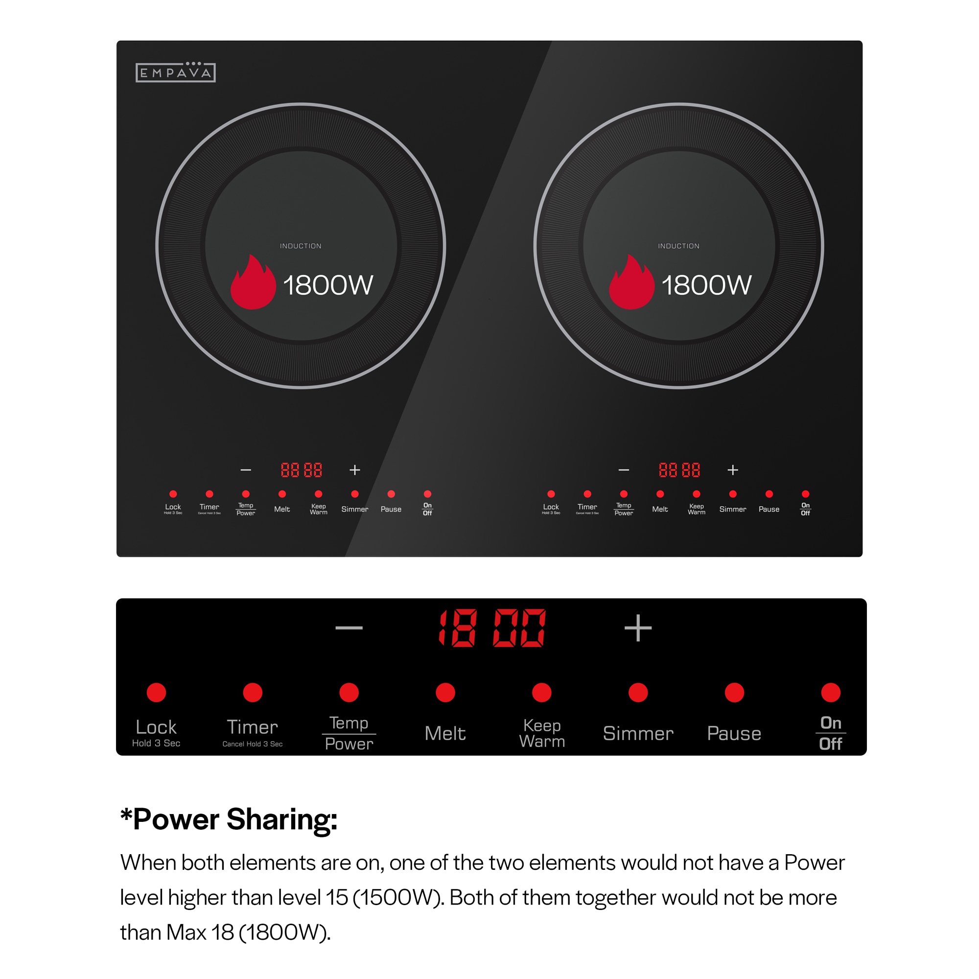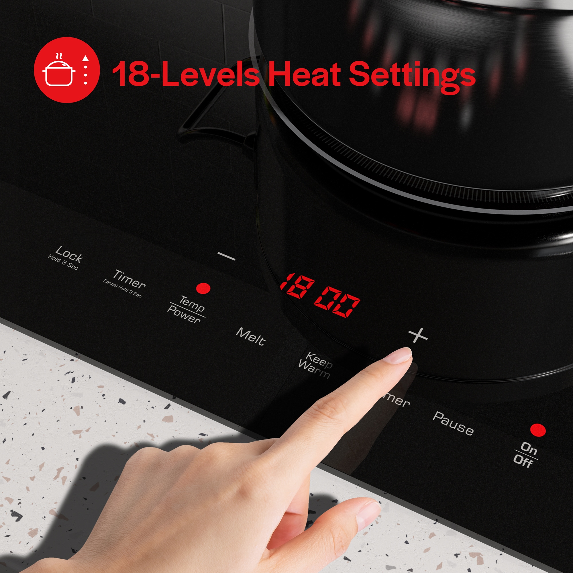 The 13-in Built-in Dual Heating Elements 1800-W Induction Cooktop with certified is a perfect combination of style and practicality. Panel lock safety feature gives you peace of mind, and also makes it easier to clean the surface without pressing unwanted buttons. Low simmer allows for gentle cooking for even the most delicate of sauces and chocolate. Warming function maintains low temperature for extended period. Simmer is ideal for maintaining a Simmering Temperature(bring the pan to the boil), allowing you to cook food for long periods. Ideal for long-cooking recipes (sauces, soups, stews, etc.,) at an optimal Simmer. Pause is a safety feature with the help of which the program settings can be paused, meaning cooking can be paused, and then when pressed again, it will resume the cooking process. This small, lightweight, easy-to-store double burners induction cooktop is perfect for outfitting your home, RV, camper or dorm.
