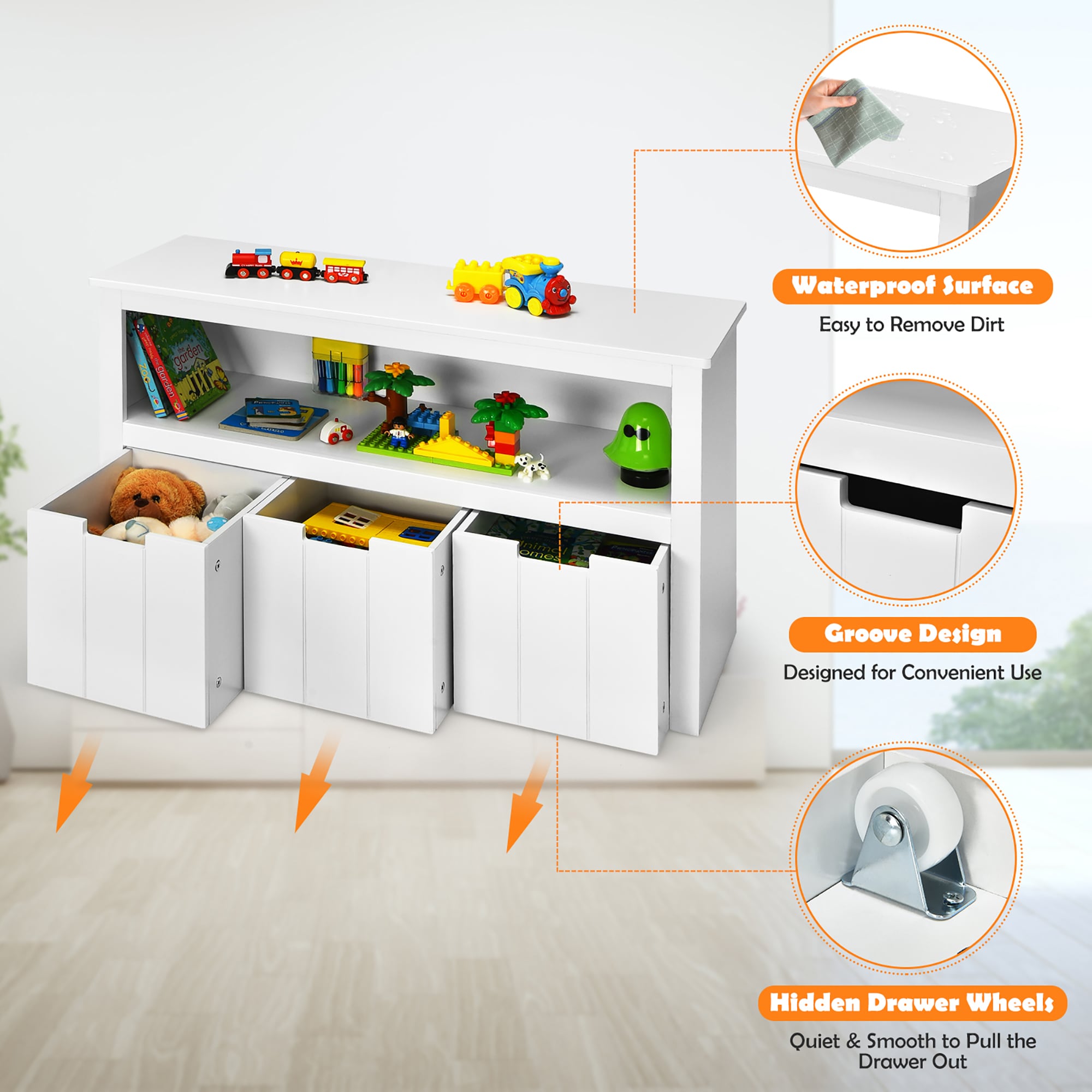 3 drawers with wheels for easy slide out Large storage space for various items to keep the room tidy Thickened wood board with large bearing capacity for more stability Safe material without odor makes it safe for the whole family to use Table function can be achieved after removing the 3 drawers Chic and simple appearance nicely matches your rooms Smooth and waterproof surface makes it effortless to clean with a wet cloth Color: White Material: MDF + PB Product Dimensions: 40” x 13” x 24.5” Drawer Dimensions:12” x 12” x 11.5” Net Weight: 51 lbs Weight Capacity of Top: 110 lbs Weight Capacity of Shelf: 45 lbs Weight Capacity of Drawer: 22 lbs Package Includes 1 x Storage Cabinet 1 x User’s Guide