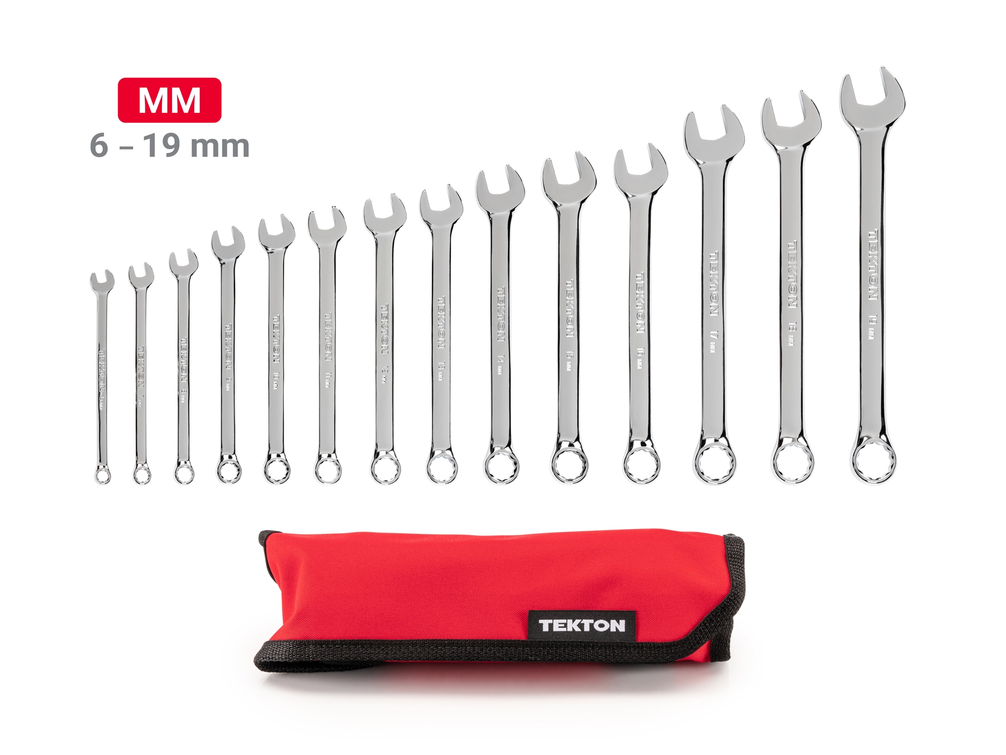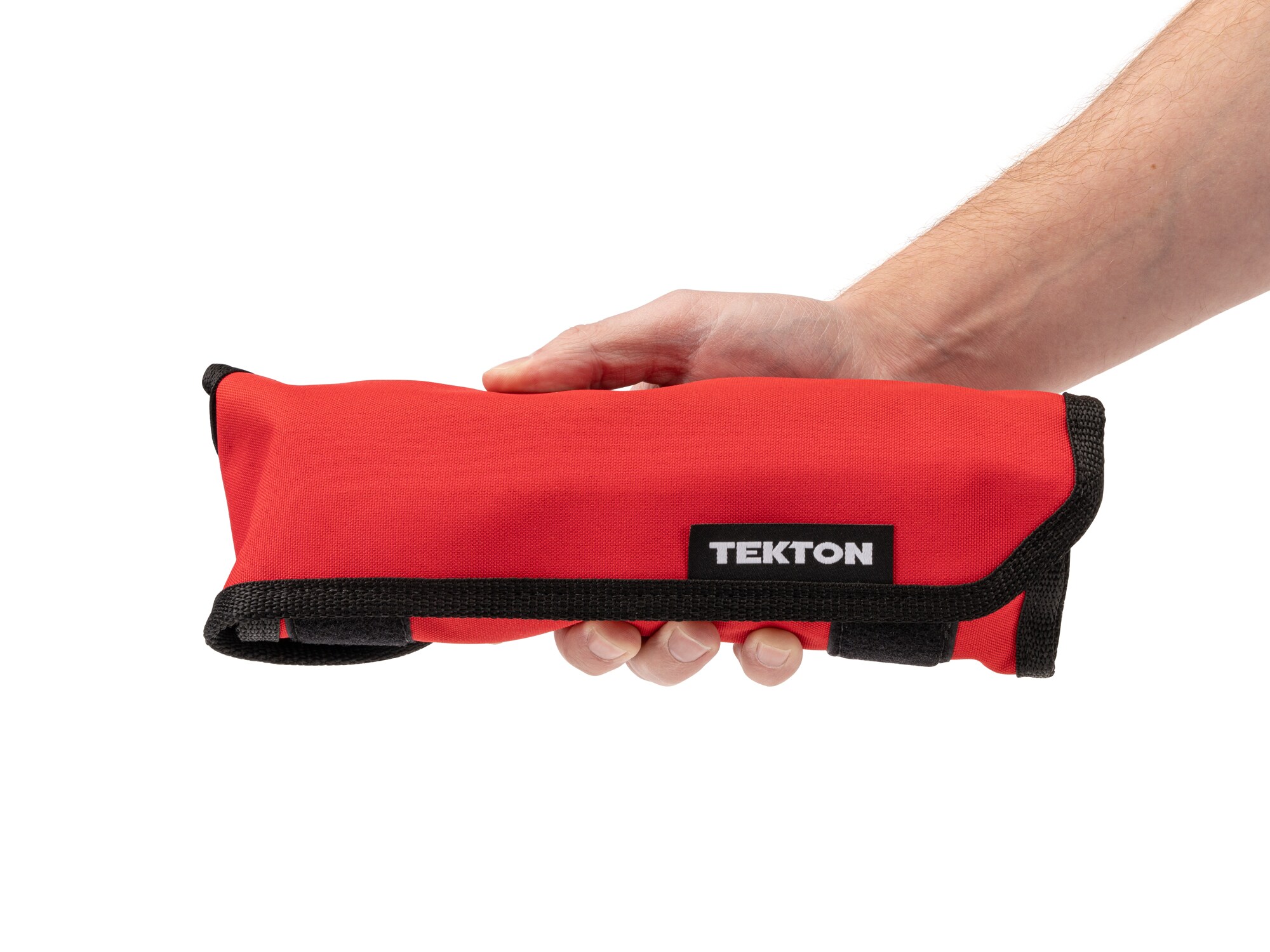 Each Tekton combination wrench is permanently marked with a stamped size marking on both sides for easy identification. The 12-point box end doubles the available access angles compared to a 6-point end. It is designed to contact and apply force to the sides of the fastener head rather than the corners, helping to prevent round-off. The 15-degree offset box end creates clearance for your fingers and makes it easier to reach around obstructions. To reduce the working swing arc in tight spaces, the open end is angled 15 degrees so the wrench can be flipped over with each rotation to engage the fastener twice as often. Carry the wrenches anywhere with the included compact roll-up pouch that keeps wrenches well-packed and unable to slide out. The polyurethane-backed 600 x 600 denier polyester is both abrasion and tear resistant, and has a Durable Water Repellent (DWR) coating. The pouch design minimizes bulk from extra material so the wrenches can be quickly accessed without any fabric flaps getting in the way.