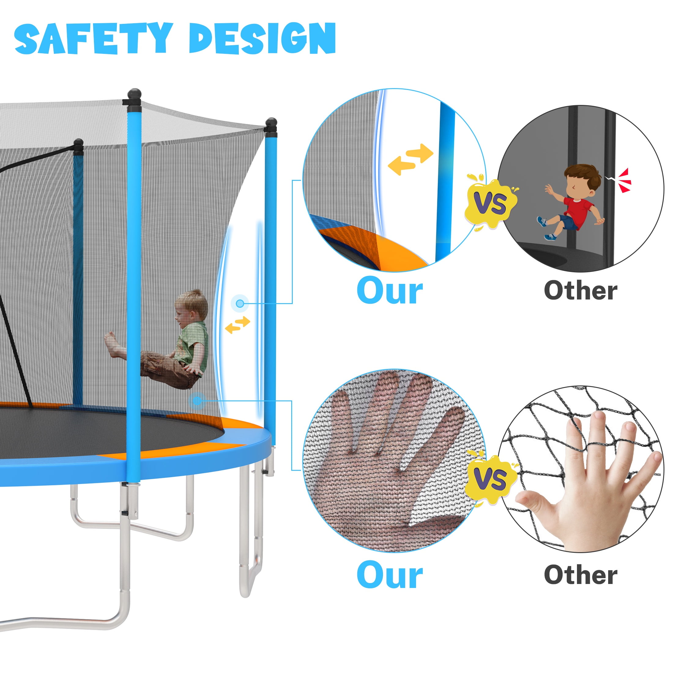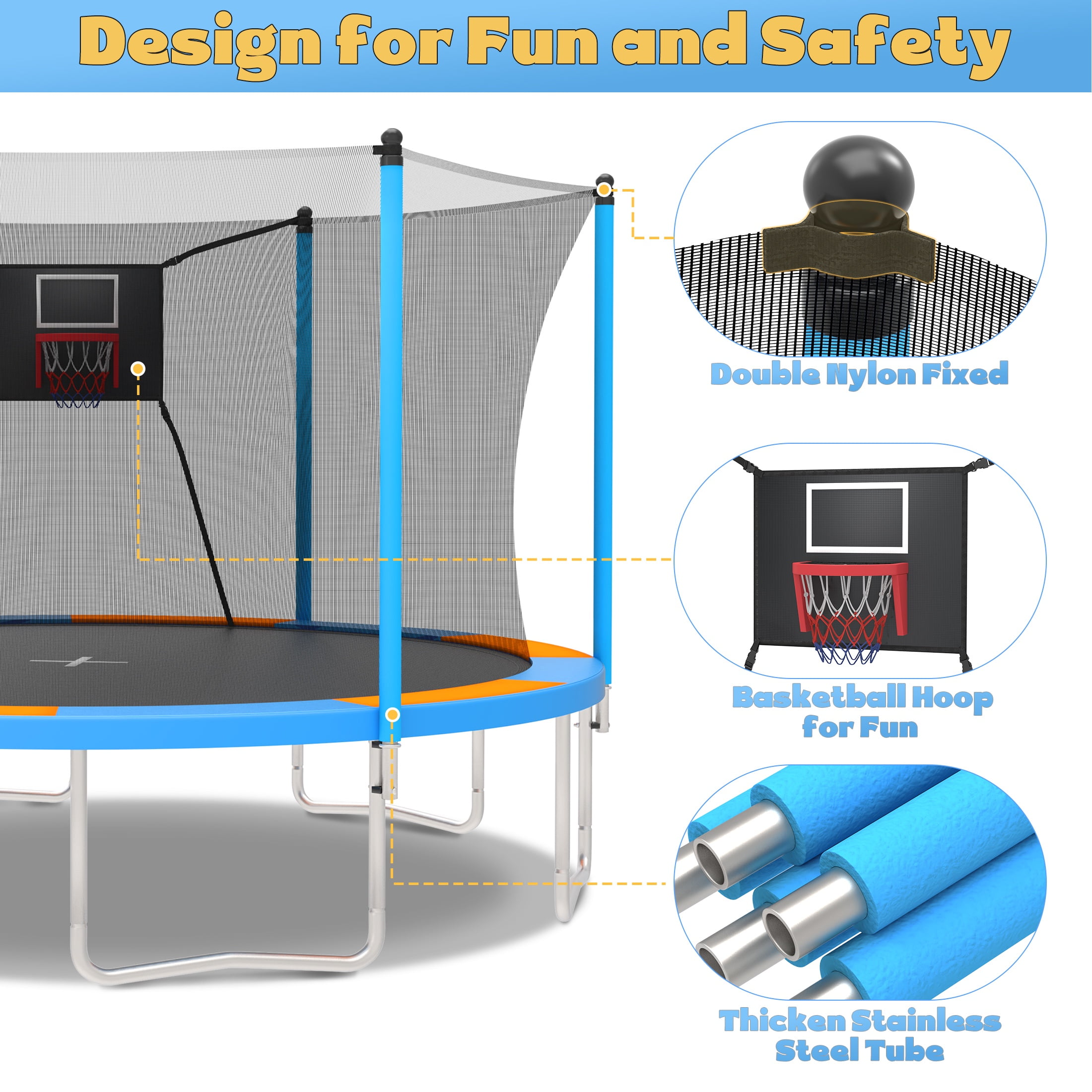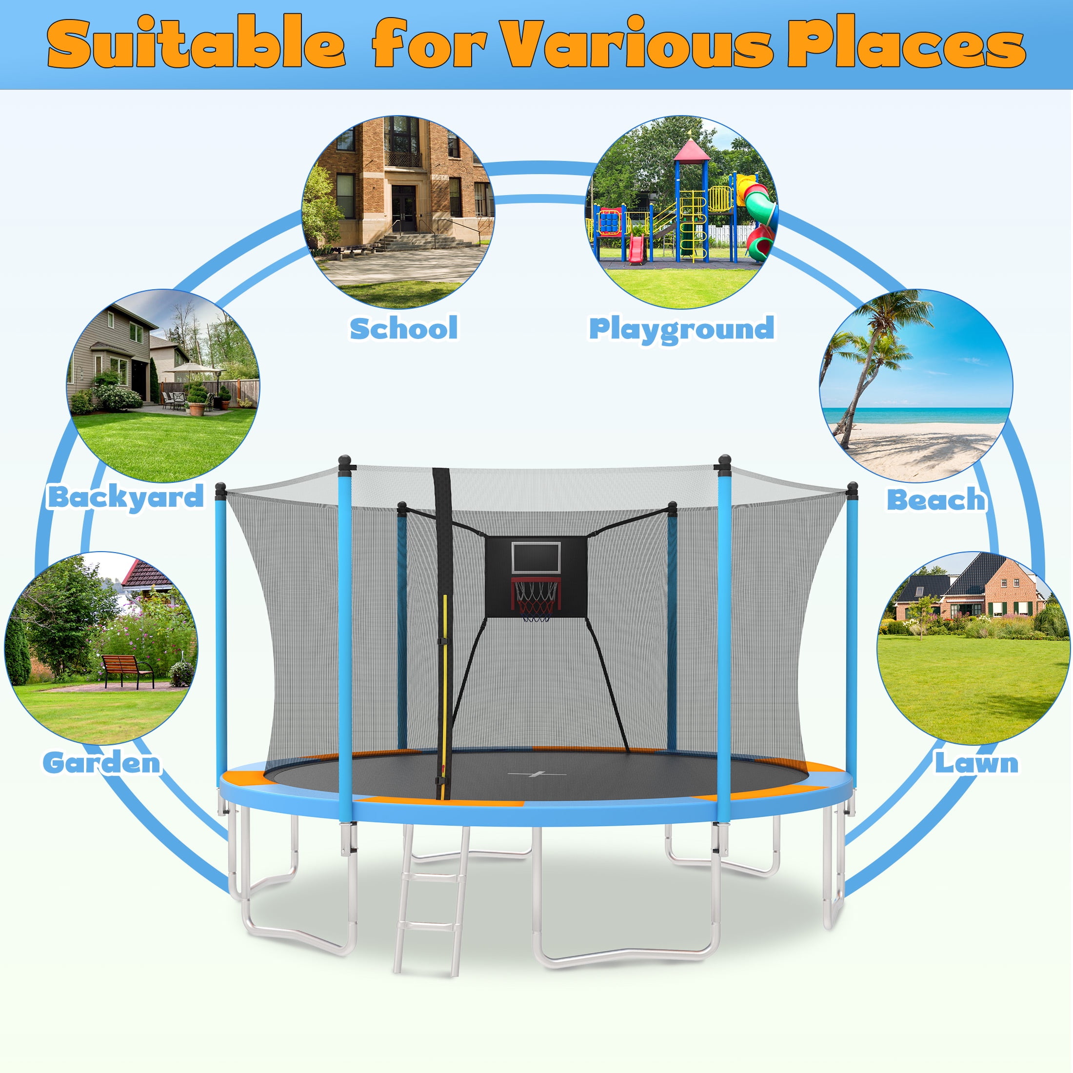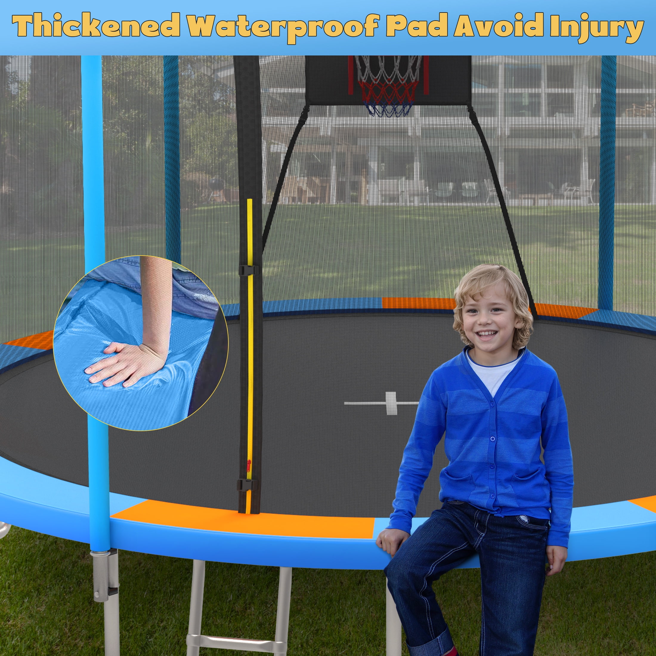 Try our trampoline and make every jump full of power and energy! The SEGMART 14 FT round trampoline with enclosure is the perfect addition to any backyard! The framework is made of weather and rust-resistant steel, providing extra protection for years to come. The 14′ round trampoline with basketball hoop will provide hours of fun for the whole family, and create lasting memories you will not forget! 6 thick foam safety padding poles also help to avoid injuries. 72-inch height complete trampoline safety enclosure is designed to protect the user of your trampoline when bouncing. The foam sleeve prevents kids from hurt when hit the trampoline frame. The round trampoline design gives more space between the jumping space and the net pole, and the inner net design greatly reduces the possibility of serious collisions. SEGMART trampolines are certified to meet international standards such as CPC and ASTM. The basketball hoop is a great addition to the trampoline. It not only allows kids to play basketball while bouncing but also attracts kids to get closer to nature and enjoy a happy time with friends together. This mini trampoline comes in two colors: Dark blue and light Blue, which would make a perfect gift choice for both girls and boys. Jumping is not only fun but also helps develop confidence, a sense of balance, and physical health. 14 ft trampoline used an anti-UV, PE material dense enclosure net. The trampoline for adults/kids features a heavy-duty metal frame combined with a fully galvanized steel frame and sleek silver powder-coated finish process to resist corrosion and rust. The top rails are reinforced with thickened T-connectors, ensuring the long-lasting performance of this outdoor kids’ trampoline. The double lock enclosure zipper design increased the safety of the trampoline. SEGMART 14ft trampoline with basketball hoop, designed with 6 enhanced W-shaped legs provides 12 balanced contact points to increase the stability of the trampoline. Upgraded T-shaped joint tube ensures the tight connection of the trampoline structure. NOTE: To avoid the jumping mat reaching the ground and causing injuries, the weight limit is 1000LBS. This outdoor trampoline is wrapped with 72 pcs high-temperature-resistant galvanized springs. High-elastic PP jumping mat enhances safety and allows you to experience exciting and safe bouncing sports. SEGMART 14FT trampoline offers kids after-school fun so that kids can exercise in a way that develops their strength, balance, stamina, and coordination while burning off pent-up energy. SEGMART trampoline is easy to assemble. The specific assembly steps are shown in picture form which is easy for you to understand. Any problems or concerns, please contact us without hesitation, and we will reply to you within 12 hours. Specification: -Trampoline size: 14FT -Color: Blue/Light Blue -W-type Feet: 6PCS -Number of Safety Poles: 6PCS -Spring: 72PCS -Frame Material: Steel -Assembled Product Dimensions:168.11’Lx168.11’Wx101.52’H -Max Weight Capacity: 1000LBS -UV Resistant: Yes -Rust/Weather Resistant: Yes -Package Included: 1 X 14 FT Trampoline -Warm Tips: 1. There may be a chromatic aberration caused by light/monitor difference. 2. The size is manually measured, there may be reasonable errors. 3. Unless quality problems, we don’t provide return service!