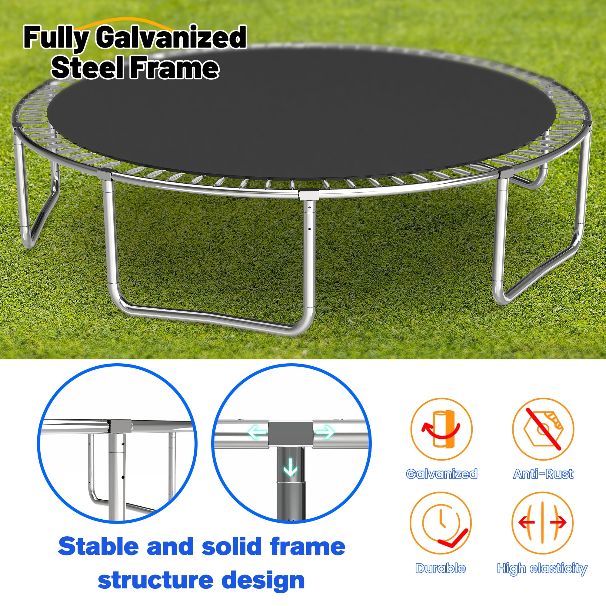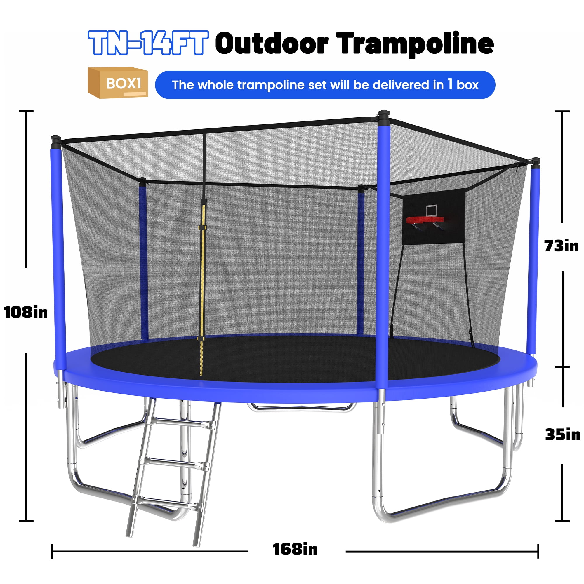 Safety First-14 FT Trampoline is equipt with 5 high safety enclosure poles and heavy gauge galvanized rust resistance steel construction. 5 W-shaped legs secure stability. Solid Structure-5 foam padded poles to support UV-proof safety trampoline enclosure net for maximum safety while jumping. Heavy duty 3-step galvanized steel ladder offers convenient maneuverability in and out of the trampoline. 1320 LBS Weight Capacity- Our trampoline’s total weight capacity is up to 1320 LBS. NOTE: to avoid the jumping mat reaching the ground cause injuries, SINGLE person’s weight limit is 330LBS. Children please use the trampoline under the supervision of an adult to ensure safety. High standard, high specification- Our trampolines comply with ASTM F381-16 and ASTM F2225-15 Standard Safety Specification for Components, Assembly, Use, and Labeling of Trampolines. You can rest assured that our safety materials are among the best on the market for your family. 100% Satisfaction Service-One order gets all accessories. The specific assembly steps are shown in picture form which is easy for you to understand. This trampoline comes in 1 large box, if the box arrives damaged or parts missing, contact us and we will reply in time.