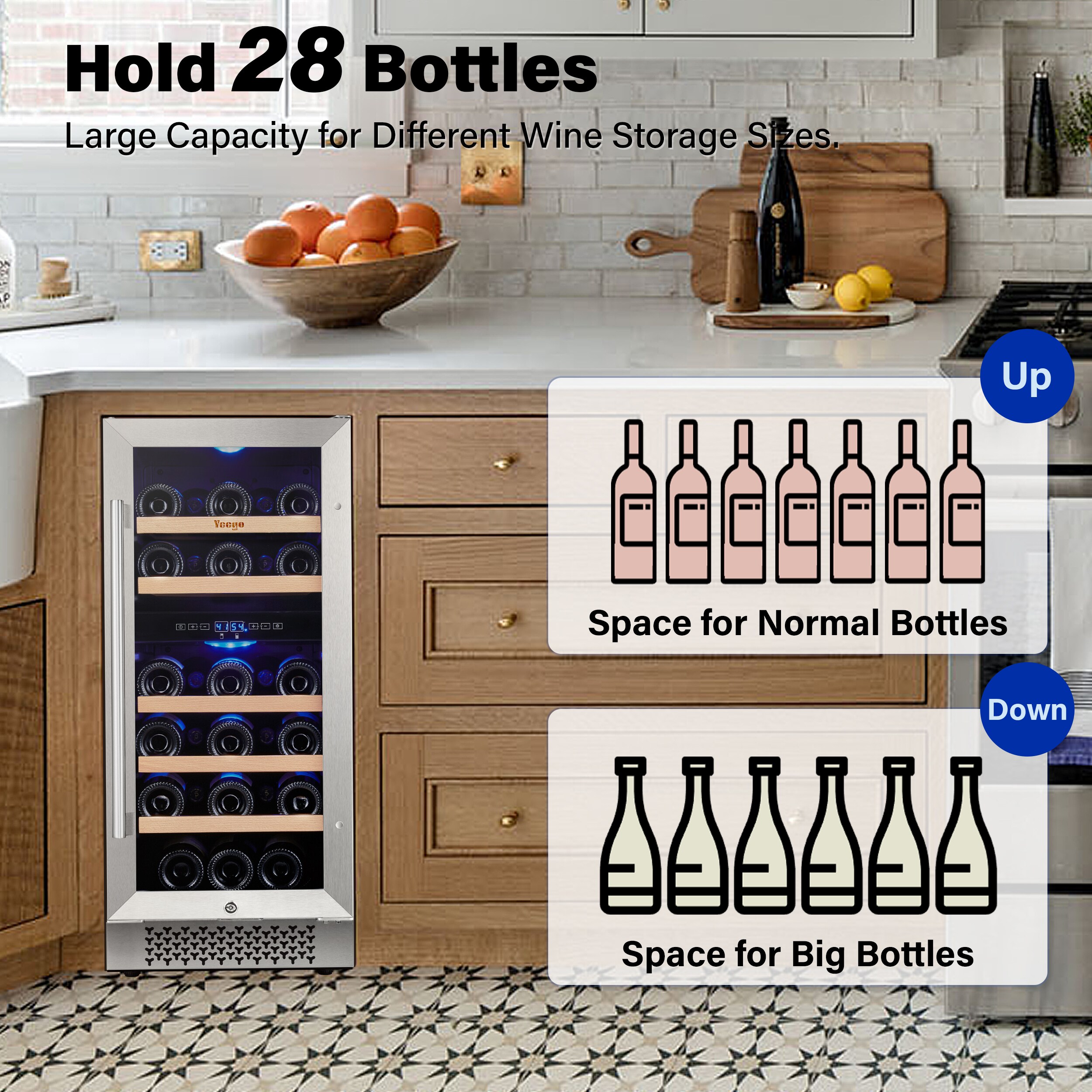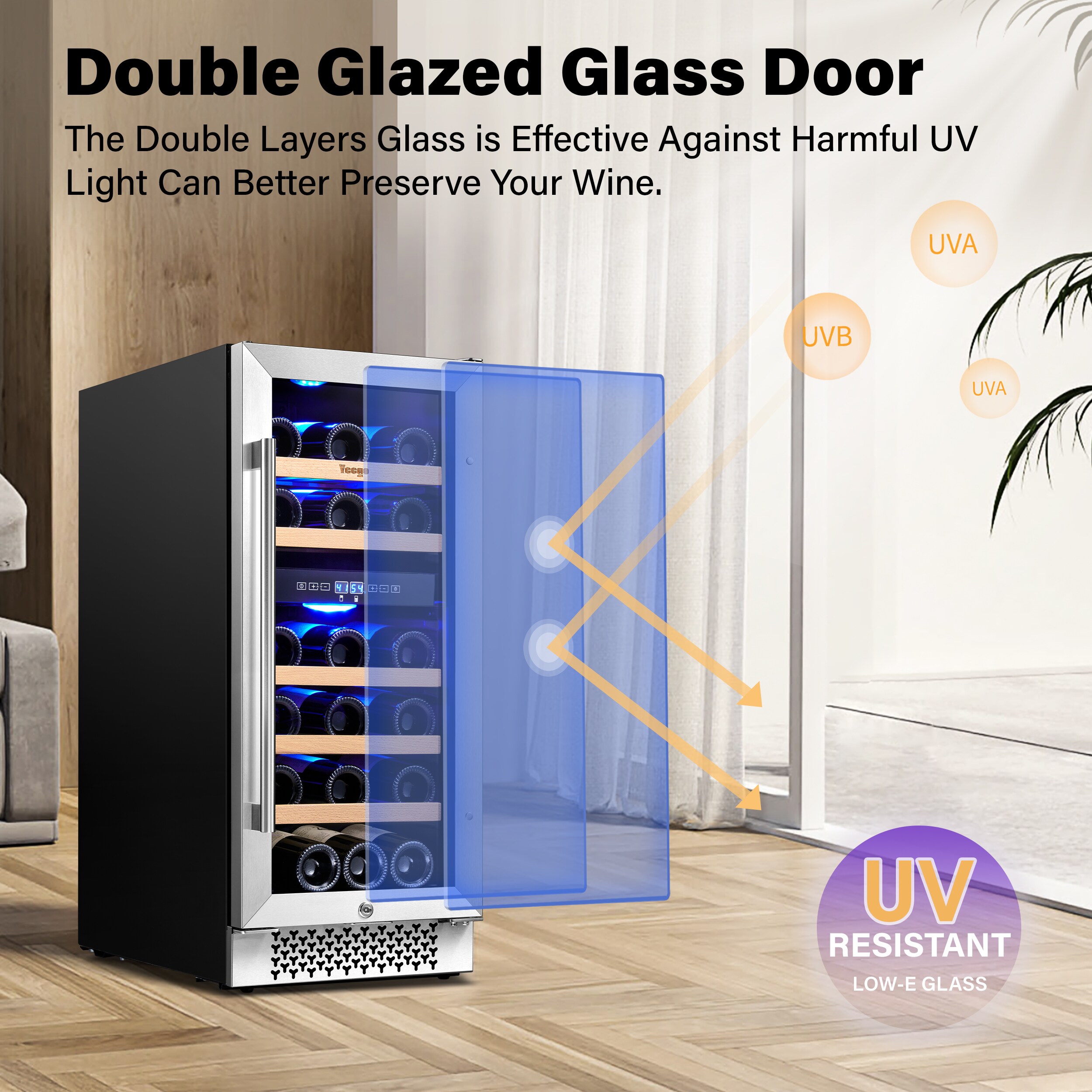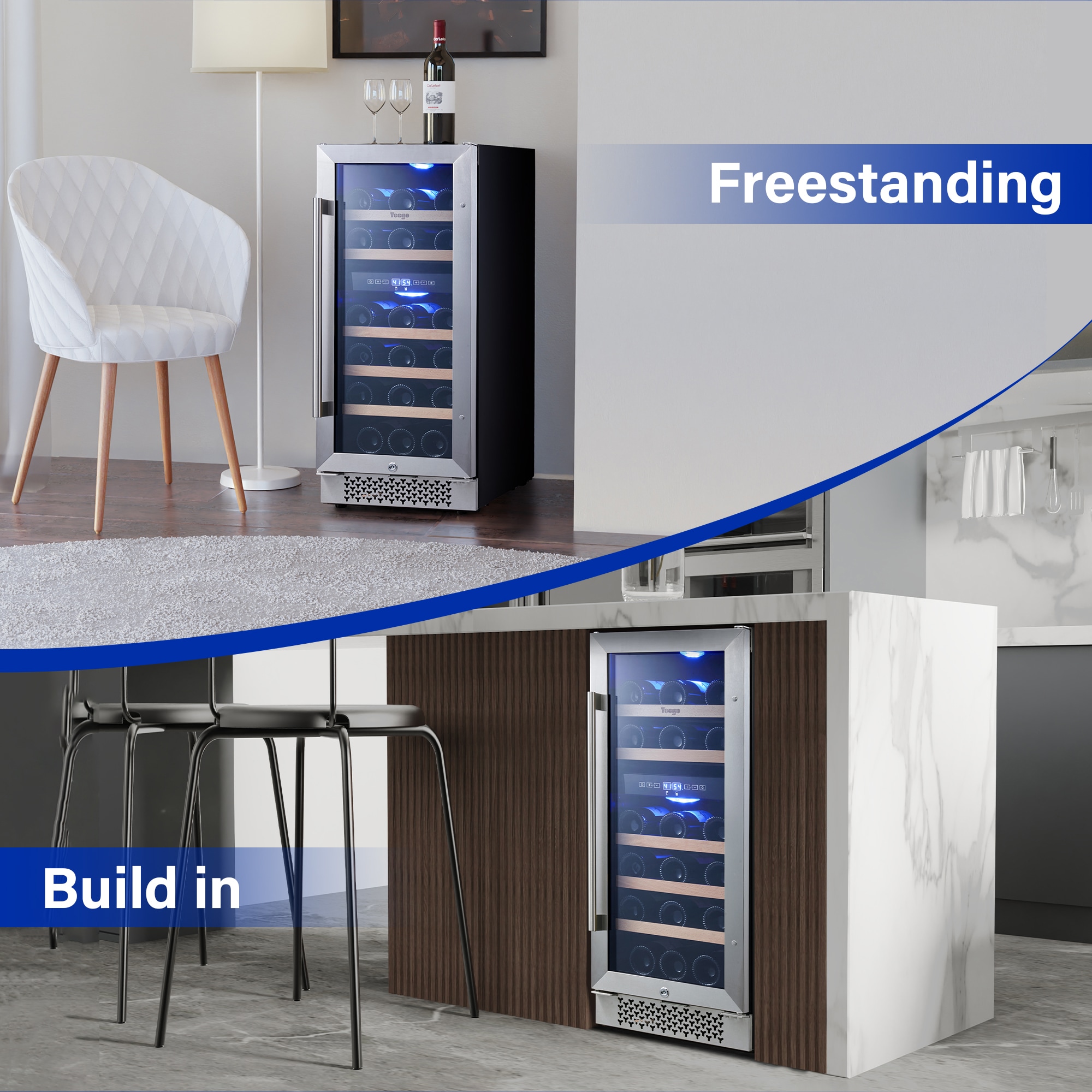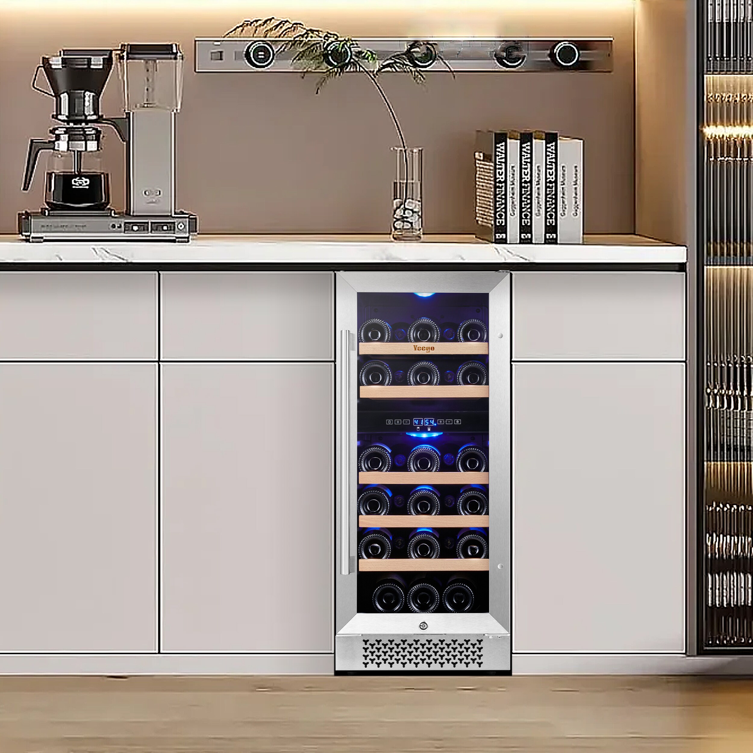 Yeego dual zone 15 in. wine fridge, under counter/built-in 28-bottle wine cooler refrigerator with upgraded compressor fits large bottles low noise reversible tempered glass door with safety lock. The dual-zone control makes it suitable for virtually any type of wine. With 5 removable premium wire-wood shelves that slide smoothly and are strong enough to hold your bottles. This wine refrigerator features automatic defrosting and an active charcoal filtration system to ensure air purity and maintain an odor-free cabinet for your wine storage. with intelligent and sensitive digital control that can be adjusted from 40-65 Fahrenheit to provide you with the best taste. Yeego wine cooler is the best Christmas gift for the family.