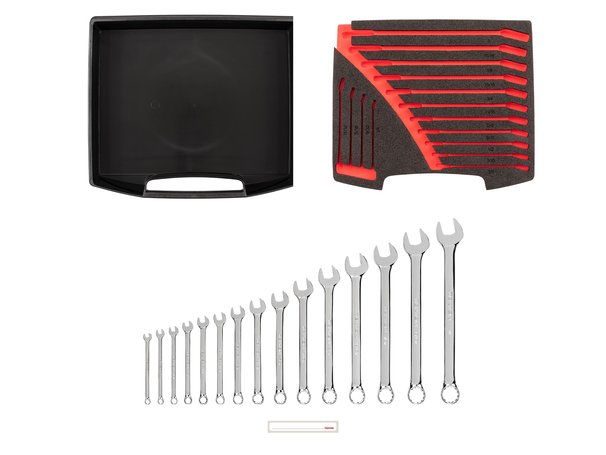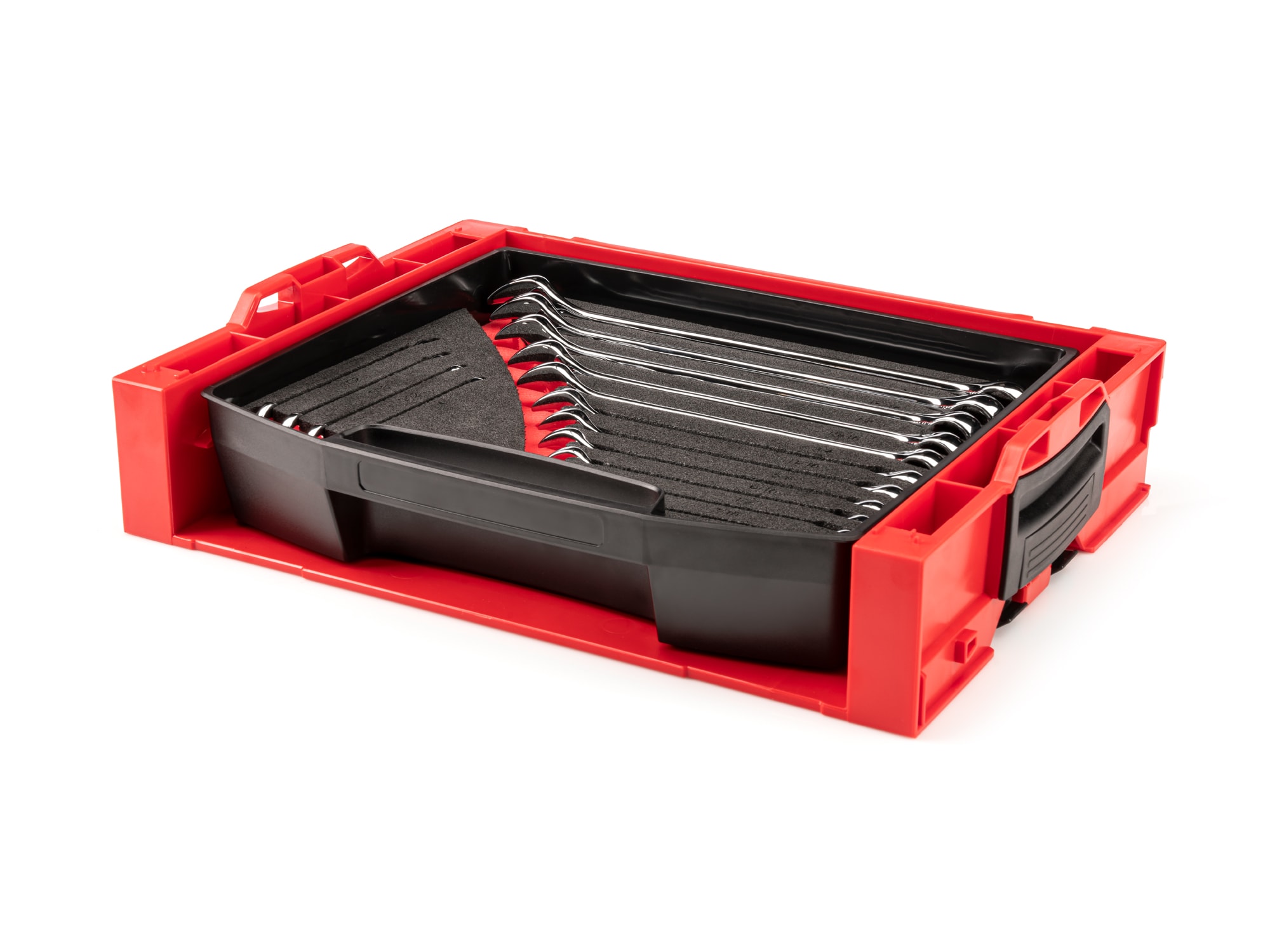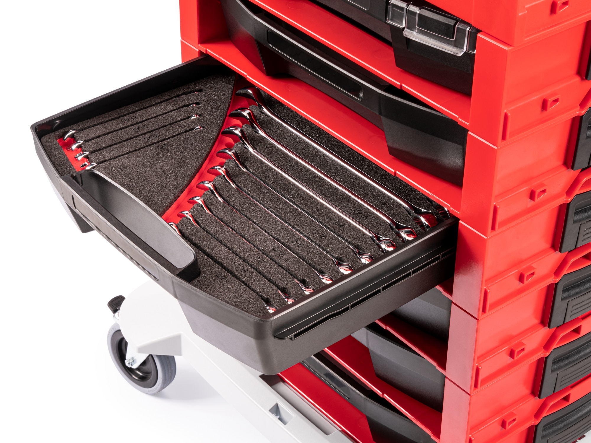 This Tekton combination wrench set is part of the L-BOXX® Stacking Organization System and connects with all other components in the L-BOXX family of products, providing virtually infinite options for configuring your own custom organization system. The set includes a range of inch combination wrenches in an open top drawer and stacking drawer rack. The handles on the side of the stacking drawer rack provide stability when latching components together. Press both side handles in and lift up to remove the drawer from the stack. The open top drawer offers quick access to drawer contents without taking apart your organization stack. Included write-on labels allow for easy identification of drawer contents. The laser-marked foam layouts are designed and cut in our Grand Rapids, Michigan manufacturing facility to optimize for high density, easy access, and secure fit. The foam is made of two color-contrasting layers that are permanently bonded together with a heat lamination process, making any missing tools immediately visible.