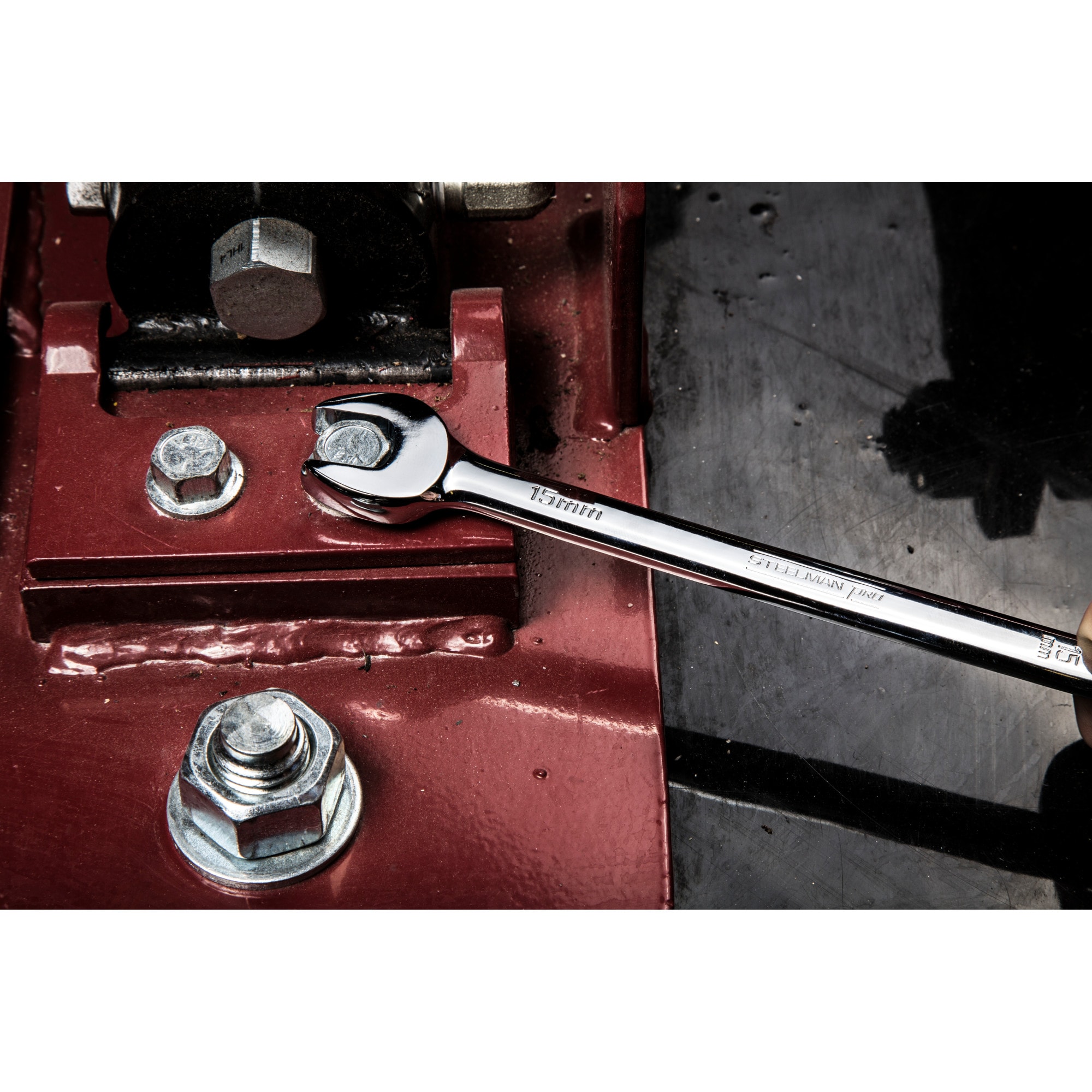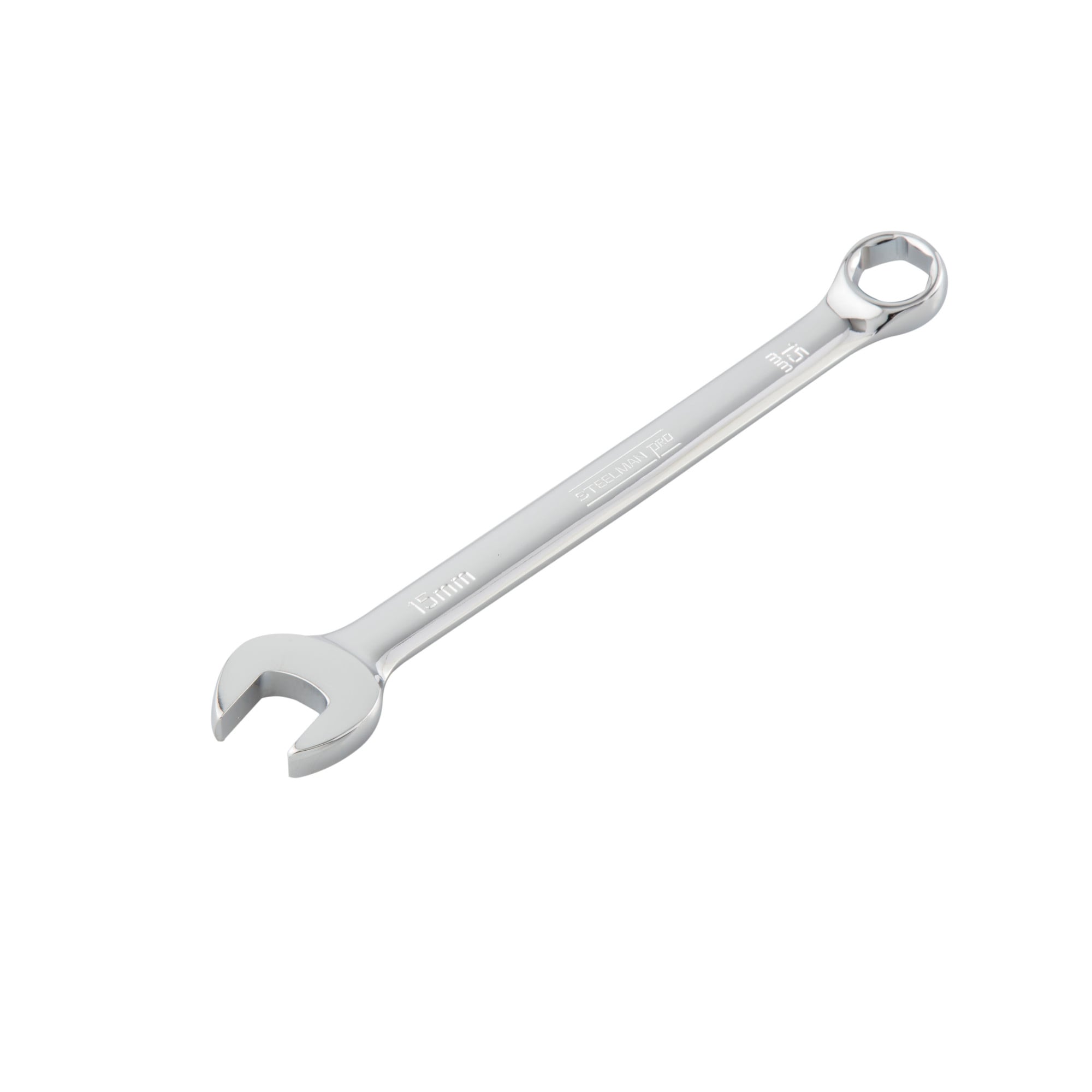 Work with the same quality tools as service technicians with the STEELMAN PRO 78533 15-Piece Metric 6-Point Combination Wrench Set. Constructed of heat-treated chrome vanadium steel alloy these tools are sure to meet or exceed ASME and ANSI torque standards to give you the long lasting durability you require from your tools. Size callouts are stamped into the steel both vertically and horizontally on both sides of each wrench to make identification easy. A mirror-polish chrome plating covers each wrench providing rust and corrosion resistance that is easily wiped clean when soiled. Open ends on these combo wrenches are angled 15-degrees to provide increased leverage and easier access to fasteners in tight places. Similarly, the box end has a 15-degree offset to provide your fingers with that little bit of extra clearance that they need as you work. Set includes the following metric sizes: 7mm, 8mm, 9mm, 10mm, 11mm, 12mm, 13mm, 14mm, 15mm, 16mm, 17mm, 18mm, 19mm, 21mm, and 22mm. When the job is done the wrenches can be stored in the included ABS plastic storage rack that can either lay flat inside a toolbox drawer or be hung on a wall using the folding carrying handle.
