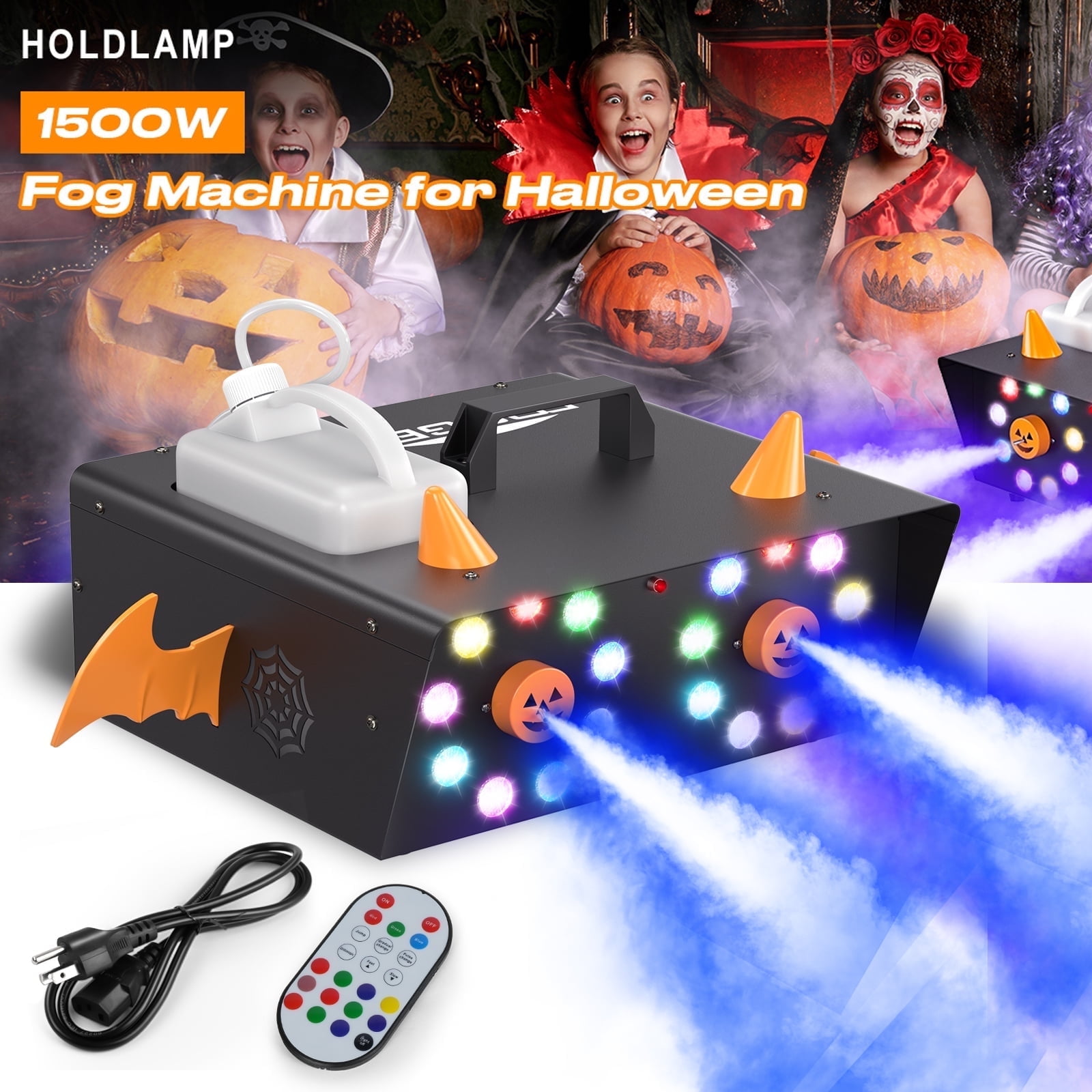 Our fog machine has a total of 17 lighting effects for you to choose from, 5 light effects at light transformation mode (Jump, Gradual, Pulse, Strobe, Marquee). This smoke machine is configured with a total of 18 LED lights with 12 multiple-color light effects to heighten the atmosphere. 1500W fog machine with dual spray port and dual 9LED light, spray out more fog than others; fog tank reservoir (1.5 liters) and detachable, superior ability to generate fog (15 seconds of continuous fog output, 5 m spray distance); No-leak Design for Vertical Spray when you need, just put the tank out and set the fog machine as Vertical. Our Halloween fog machine is equipped with a wireless remote controller for distant use. Fog and Lights are controlled in one controller, “ON” and “OFF” to control the fog spray or stop. Press any color key to turn on the light and the “Light off” key to turn off the light. Just fill full the fog tank, put in the power cord, and turn on the switch, when 3-5 minutes of warm-up is done and the indicator light is on, you just press the remote control “ON” button so that it works to supply continuous fog within 5 meters radius.