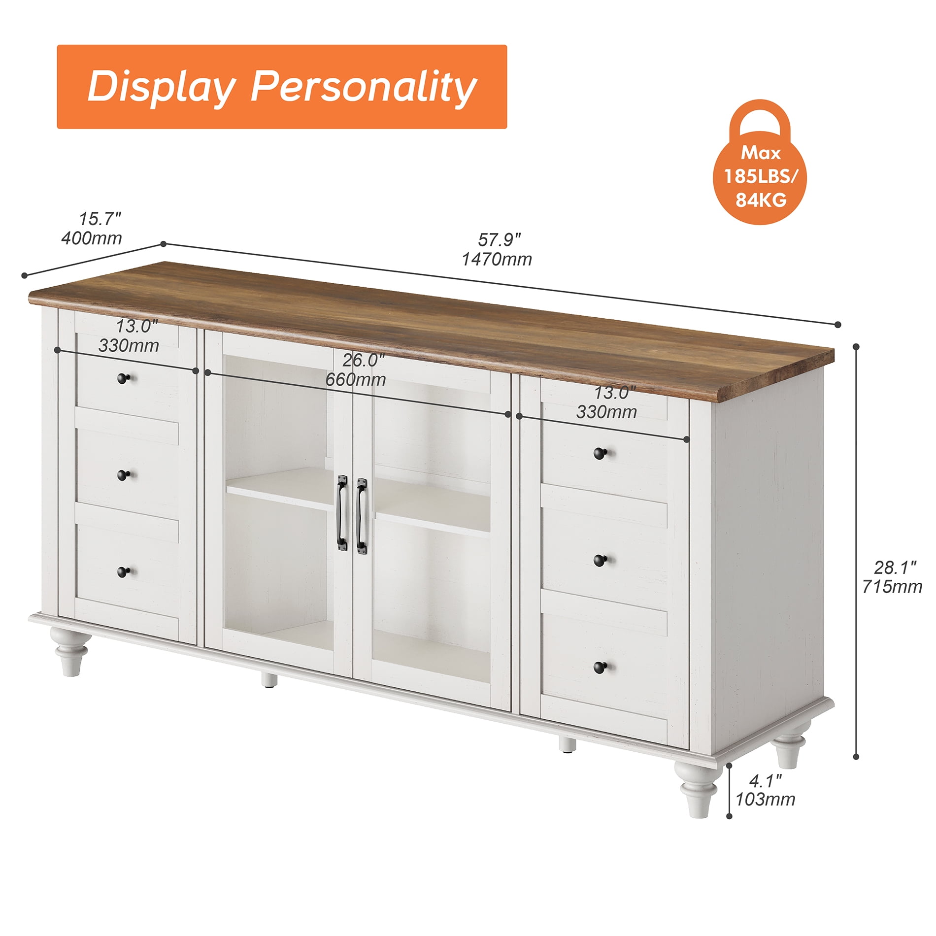 Farmhouse White Glass & Wood Television Stand for 75 inch TV, Entertainment Center with 4 Storage Cabinets