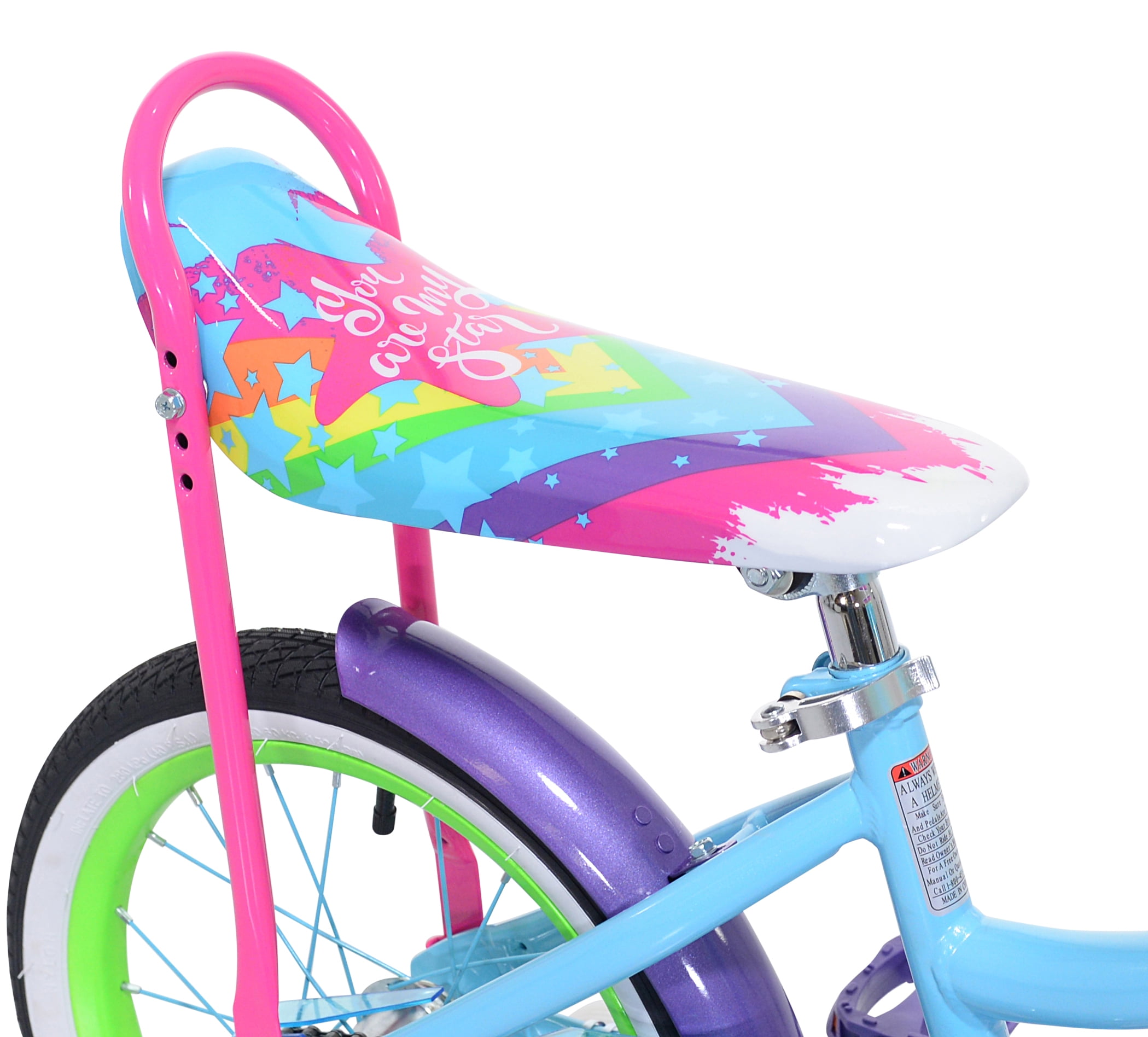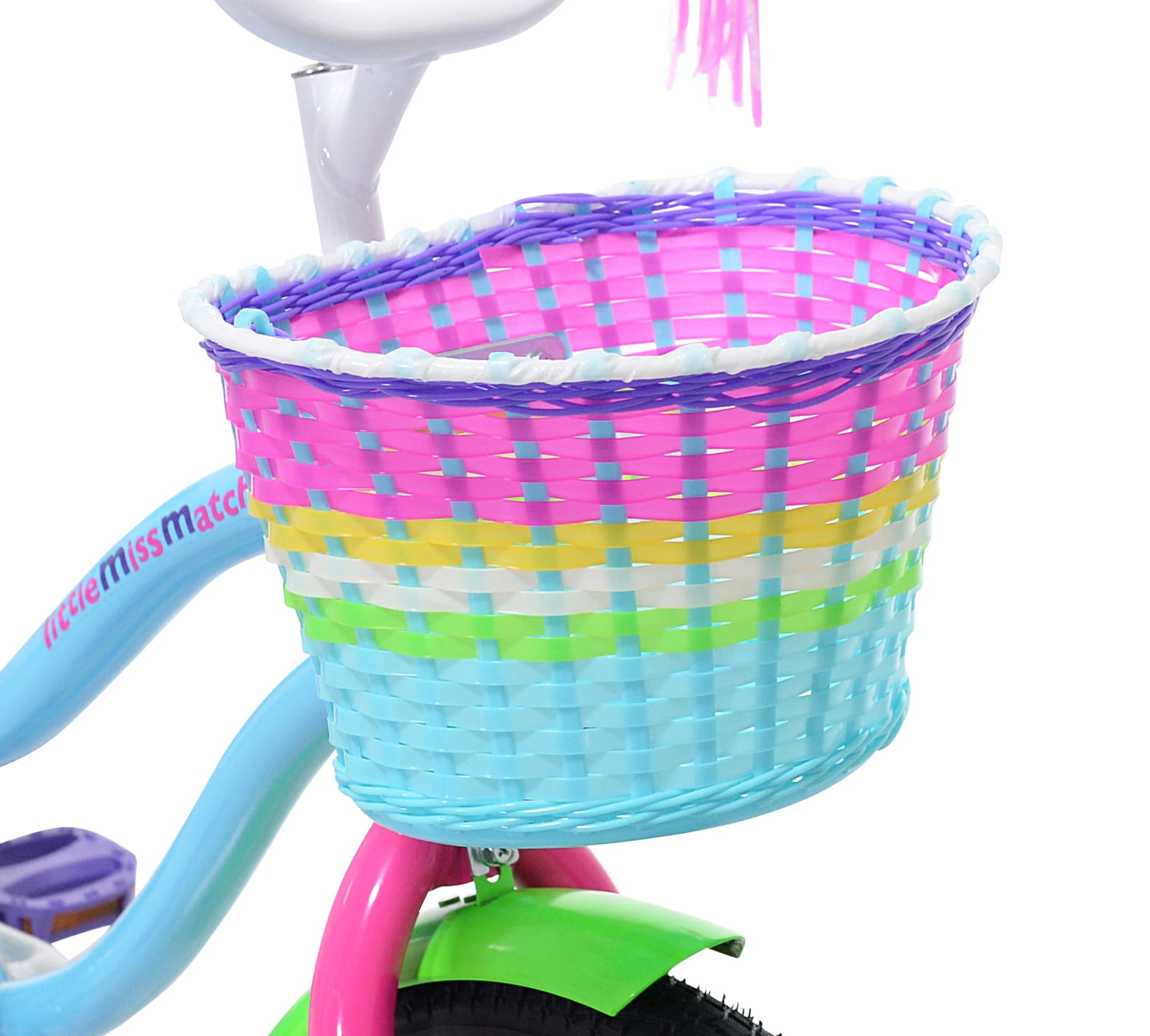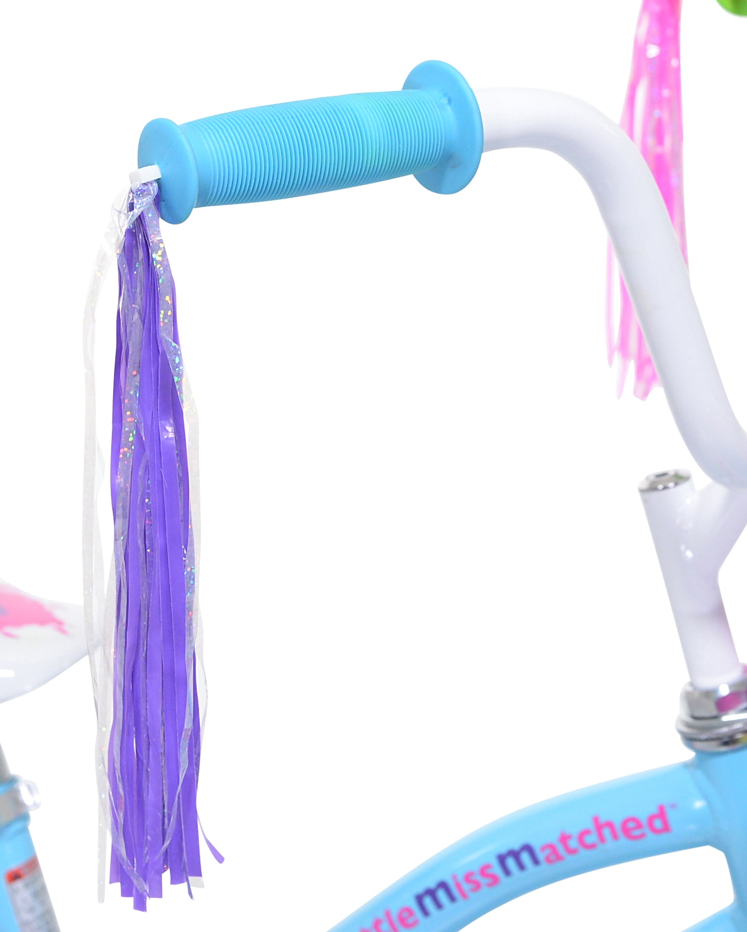 Missmatched Fun! The 16″ Little Missmatched Hise Rise Bicycle by Kent Bicycles is equipped with a blue & green steel cruiser frame and hi-tensile steel fork. This bike is cute and comfortable due to its retro-style banana seat. Perfect for neighborhood rides, the easy-to-use coaster brake system lets children stop simply by pedaling backwards. The seat and the handlebars are fully adjustable, so you can get the perfect fit for your growing child. The included training wheels are removable, letting mom or dad choose when it’s time to take the next step. The rainbow hologram handlebar streamers are fun and pretty, and the front storage basket is sure to be a hit! The fun missmatched colors make this bike truly unique looking. Your little girl is sure to love it!