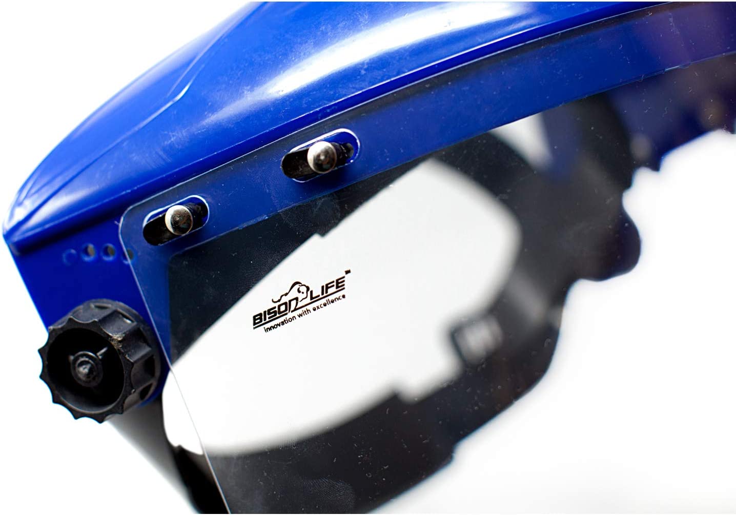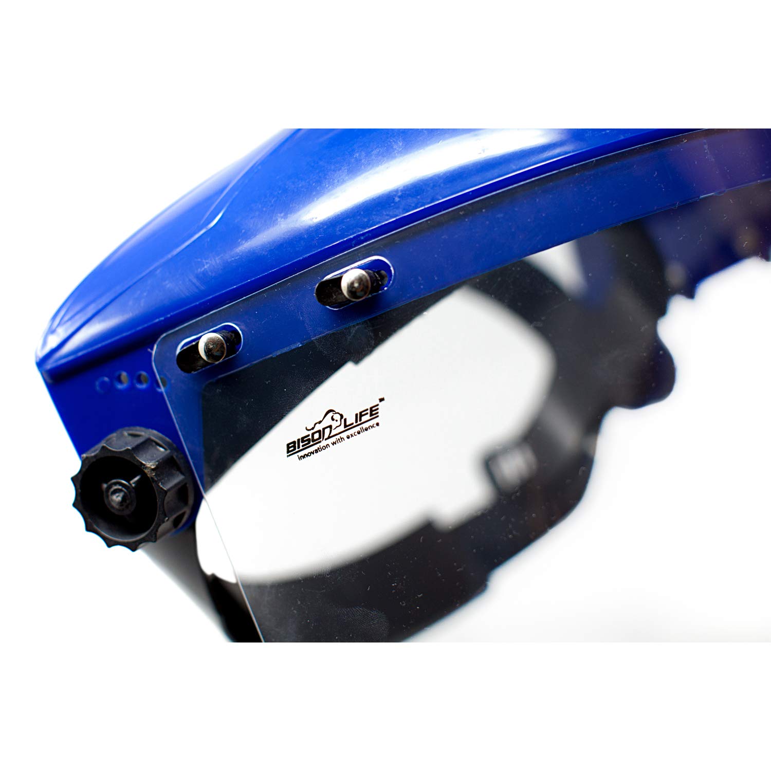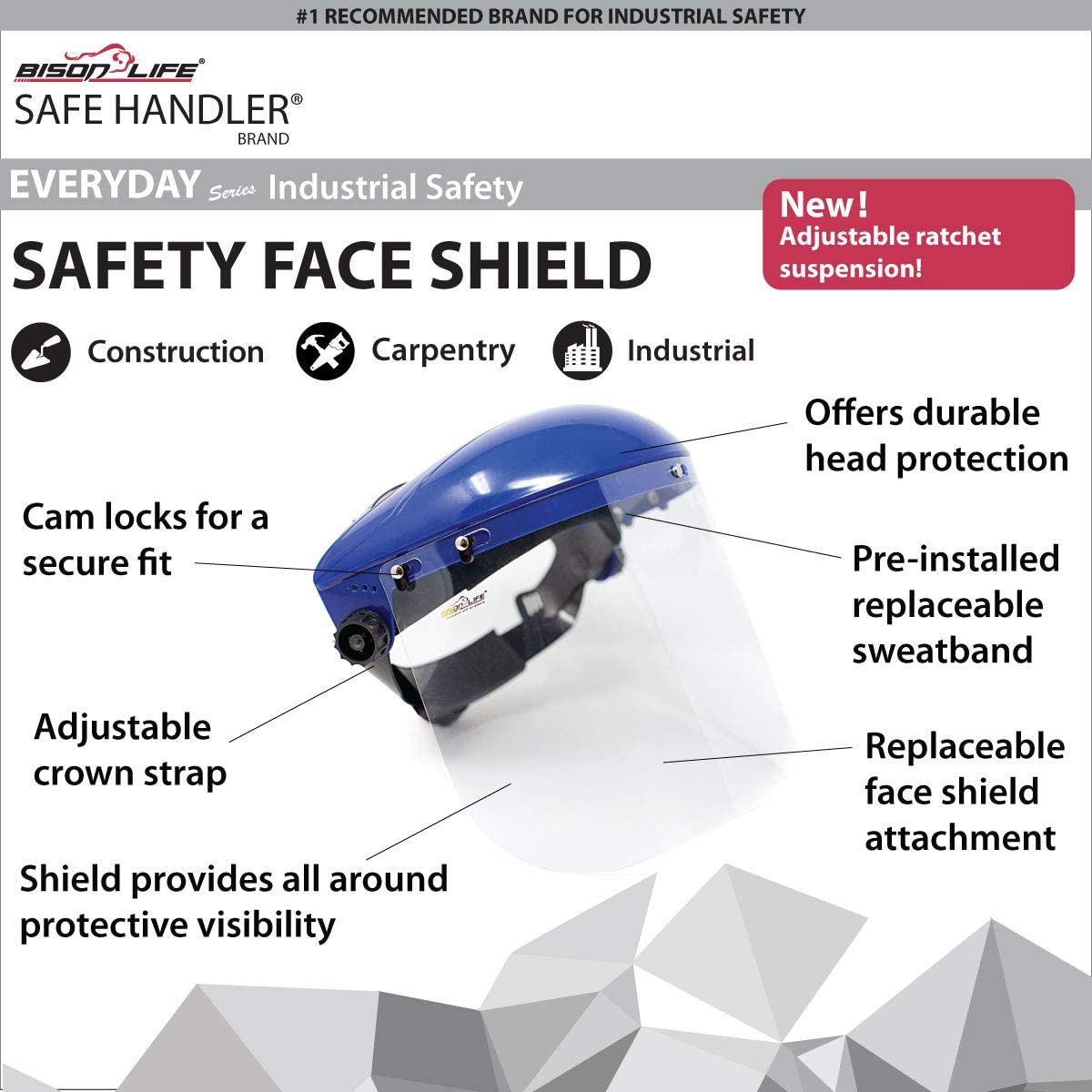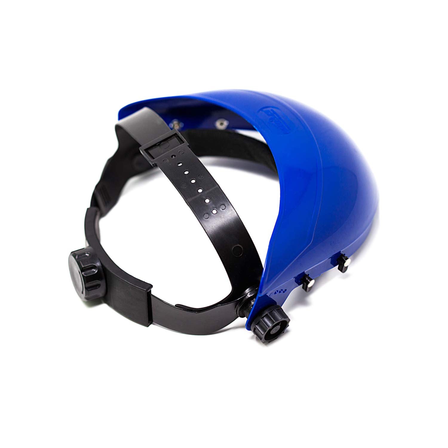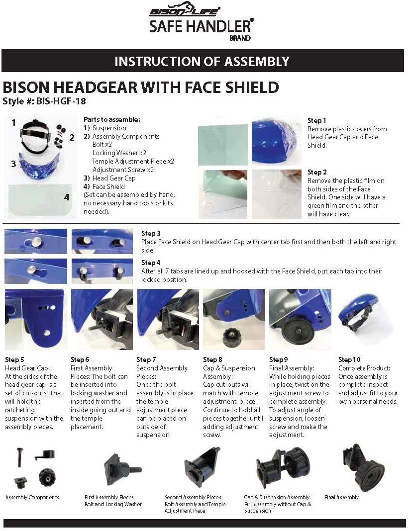 The SAFE HANDLER Safety Headgear Face Shield with Adjustable Ratchet Suspension comes with a clear polycarbonate face shield that meets ANSI Z87.1 standard without obstructing your field of vision. The headgear is fully adjustable for the perfect fit with a 5-position crown strap and ratchet adjustment knob on the back. Pre-installed with a replaceable sweatband for ultimate comfort and moisture absorption. The flexible polycarbonate shield comes with a removable protective film over the polycarbonate to protect it from scratching during shipping and needs to be removed before use for the optimal clear vision. The flexible polycarbonate shield offers a removable protective sheet to protect from scratching during shipping. The high-strength thermoplastic crown is built to last and allows for replacement or exchange of the face shield within seconds. Available in Blue Color, One Size Fits Most.