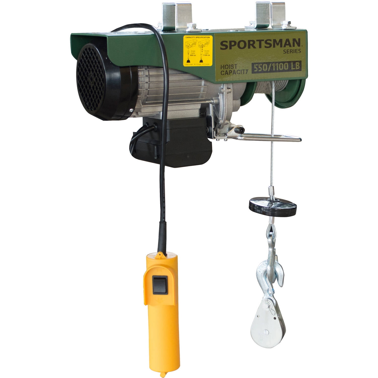 Easily clean large game and big livestock with the Sportsman 1100 lbs capacity Electric Game Hoist. Lift game small engines transmissions large shop tools or building supplies more easily in the garage or on the farm. The Electric Hoist is a safe and easy way to move and lift equipment tools and supplies weighing up to 1100 pounds. Securely mount the fully automatic hoist to the ceiling or overhead beam to lift anything in the garage or shop. The 5-foot long wired control switch means you can stand on the ground and adjust the workload into a manageable position without working up a sweat. This fully automatic hoist requires no hand cranking making it easy for anyone to move and lift bulky loads. Great for use while hunting butchering tractor and engine repair or use on job sites lifting heavy building materials. Features: Single cable: 550 lbs. lift capacity 33 ft./min. 38 ft lifting height Double cable: 1100 lbs. lift capacity 16.5 ft./min 19 ft. lifting height 1.3 HP 120V single phase 60 Hz 8.5A 1000 watt motor 3400 RPM Wired control switch with 5 ft. cable braided high carbon steel cable 0.16 in. thick 4.2 mm Includes mounting bracket for attaching overhead – SKU: BFFT2072