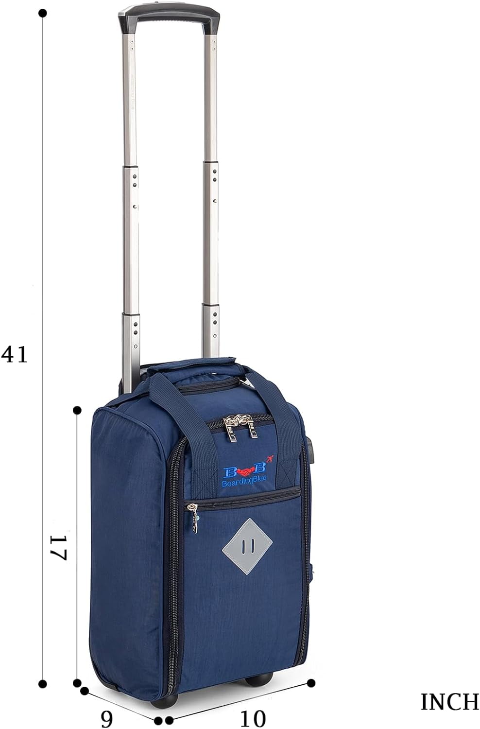 Introducing a highly functional and convenient travel bag, meticulously crafted to adhere to airline restrictions. With its compact size of 17″x10″x8″, this duffel bag is the perfect personal item for air travel. The design ensures it fits snugly in the space under the seat in front, maximizing your travel comfort. Key features include a lightweight build, weighing just 3.08 pounds, inclusive of wheels and handle, making it an effortless carry-on. The bag offers a specialized laptop sleeve pocket with approximate dimensions of 7″x8.5″, ideal for securing small laptops or tablets. Additionally, it comes equipped with a handy USB charging port, enhancing its functionality for tech-savvy travelers. The bag’s design also focuses on organization and convenience. It boasts a variety of pockets, including a front pocket ideal for quick access to essentials like passports and tickets, and a top pocket designed for small accessories like phone cables and chargers. Inside, you’ll find two more pockets for organizing your belongings, alongside a dual-sided flat pocket for personal items. A unique feature of this travel bag is the back strap, allowing it to be securely attached on top of another carry-on, optimizing its utility for those with additional luggage. The total linear size of the bag, including wheels and handle, is a precise 36 inches, ensuring compliance with most airline size limitations for personal items. This travel bag is not just a storage solution; it’s a travel companion designed to meet the needs of modern, efficient, and hassle-free air travel.