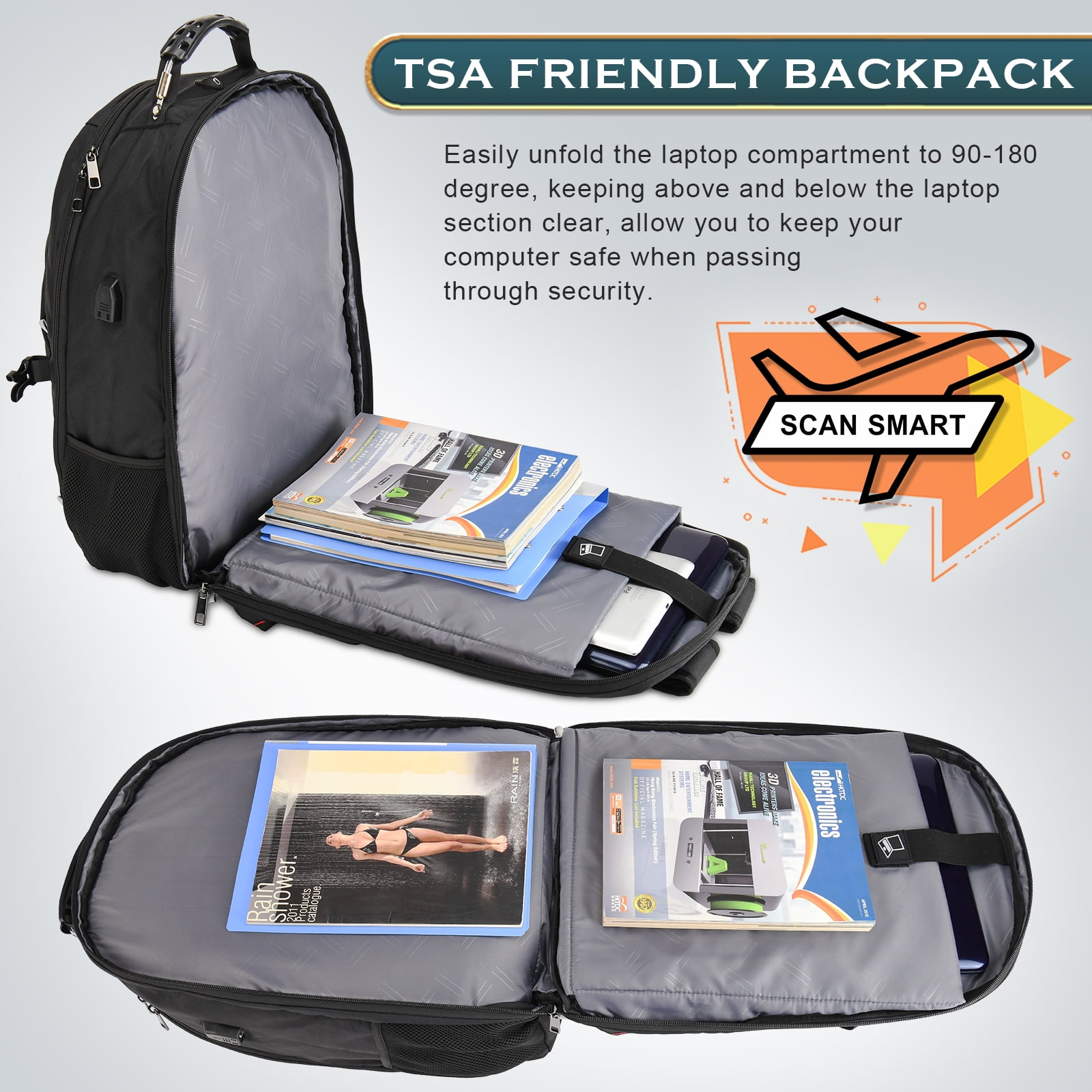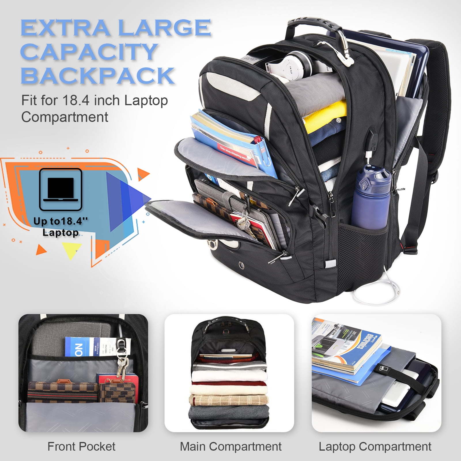 Aokur oversized backpack can be a International travel backpack, unfolds the backpack freely 180 degrees, making you quickly through the airport security. 65L extral large capacity to hold clothes, shoes and other travel essentials. Can be a work backpack fits most 19, 18.4, 18, 17.3, 17, 15.6, 15 inch laptops. With USB charging port, convenient to charge your electronic devices anytime, anywhere. (one charging cable built in, power bank not included). Can be a perfect back-to-college gift as the college backpack has plenty of compartments could make your college supplies tidy and organized ( like a laptop, Book, folder, Pencil case, pocketbook, keyboard, mouse and phone charger cable, etc). Can be a hiking backpack as the silve bond strap on outside pocket can hanging the travel gears or sports backpack for carrying the balls, shoes or other sports gears. The laptop travel backpack made of water-resistant sturdy polyester fabric(long time soaking is not recommended), which can withstand harsh conditions and heavy use. Adjustable shoulder straps with padding help relieve the stress from your shoulder. Construction of the Backpack:1x 180° Flipped Open Laptop Compartment; 1x Large Capacity Main Compartment with 1x Inside Mesh Open Pocket; 1x Large Front Zipper Pocket; 1x Large Outter Zipper Pocket with 1x Inside Open Pocket; 2x Elatical Mesh Pockets; 1x Back Hidden Zipper Pocket. Extra Large 65L Travel Laptop Backpack Features: ✔High Quality Water Resistance Polyester and Nylon Lining, Double Metal Zippers. ✔A sturdy rugged handle with steel cable on the top for carrying. ✔Sunglass and headphone straps are designed on the shoulder straps. ✔External USB charging port and headphone port ✔Adjustable chest strap and should strap helps you lock your backpack in place securely. ✔TSA friendly backpack can be opened freely 90-180 degrees and fastly through airport security. ✔A large hidden pocket on the back of the laptop backpack keeps your phone or wallet safe from theft, making your travels more secure. ✔Fits 19,18.4,18,17.3,17,15.6,15 inch laptops. Also can be used as work backpack, college backpack, gaming laptop backpack, it is an ideal gift choice. ✔Heavy duty backpack has a luggage strap on the back that can be easily inserted and fixed to the handle of a trolley or suitcase, making your travel easier. ✔Package: 1x Extral Large 65L Travel Backpack