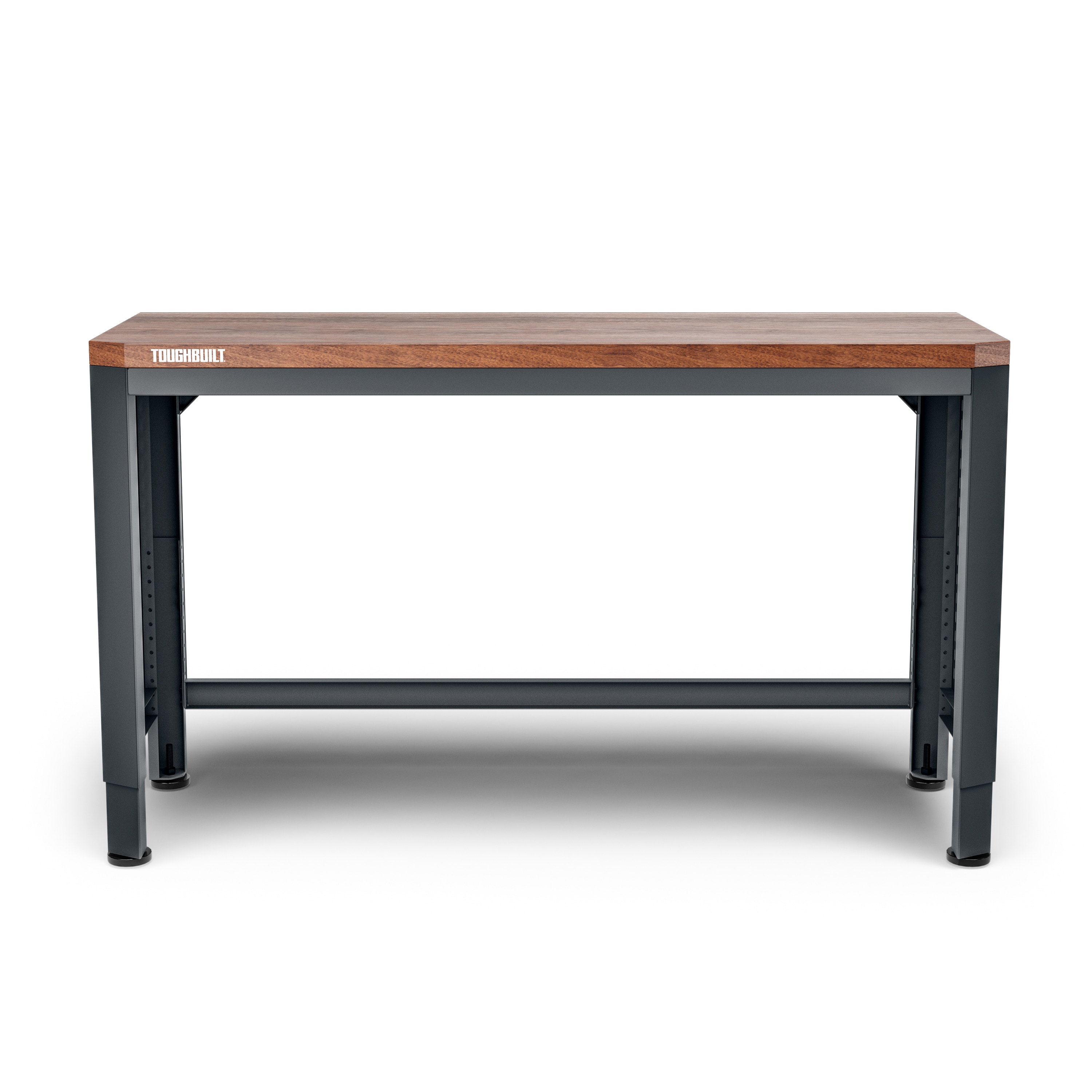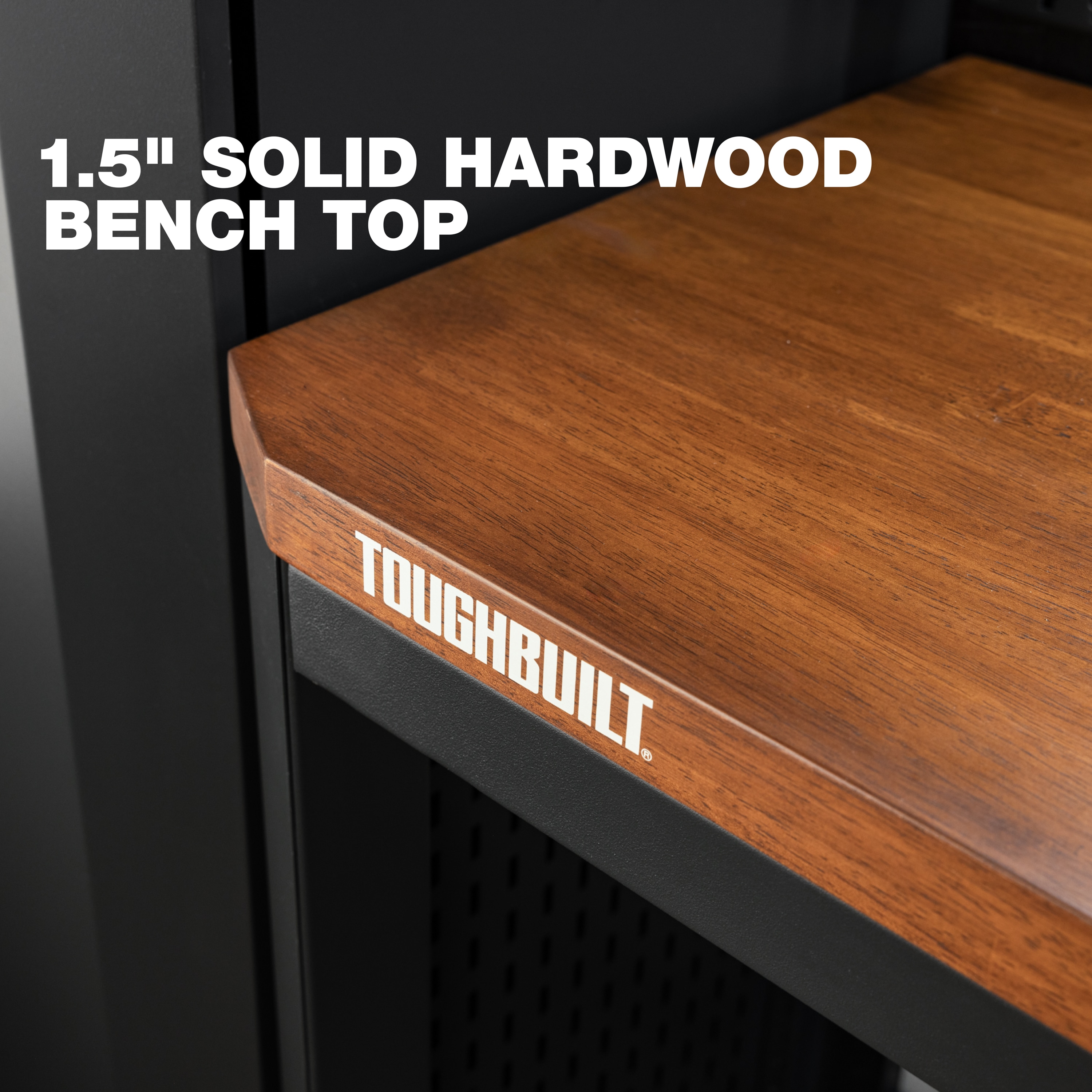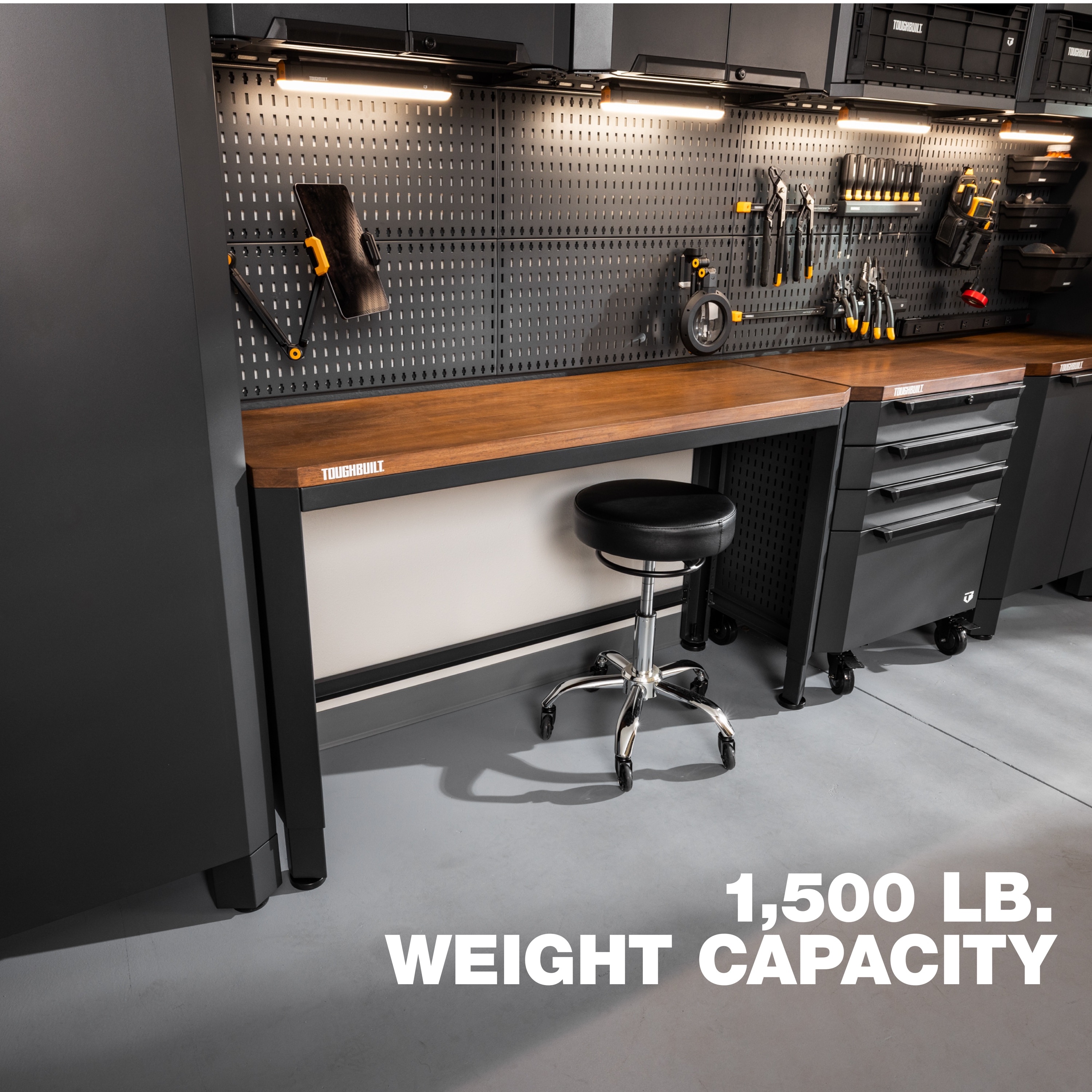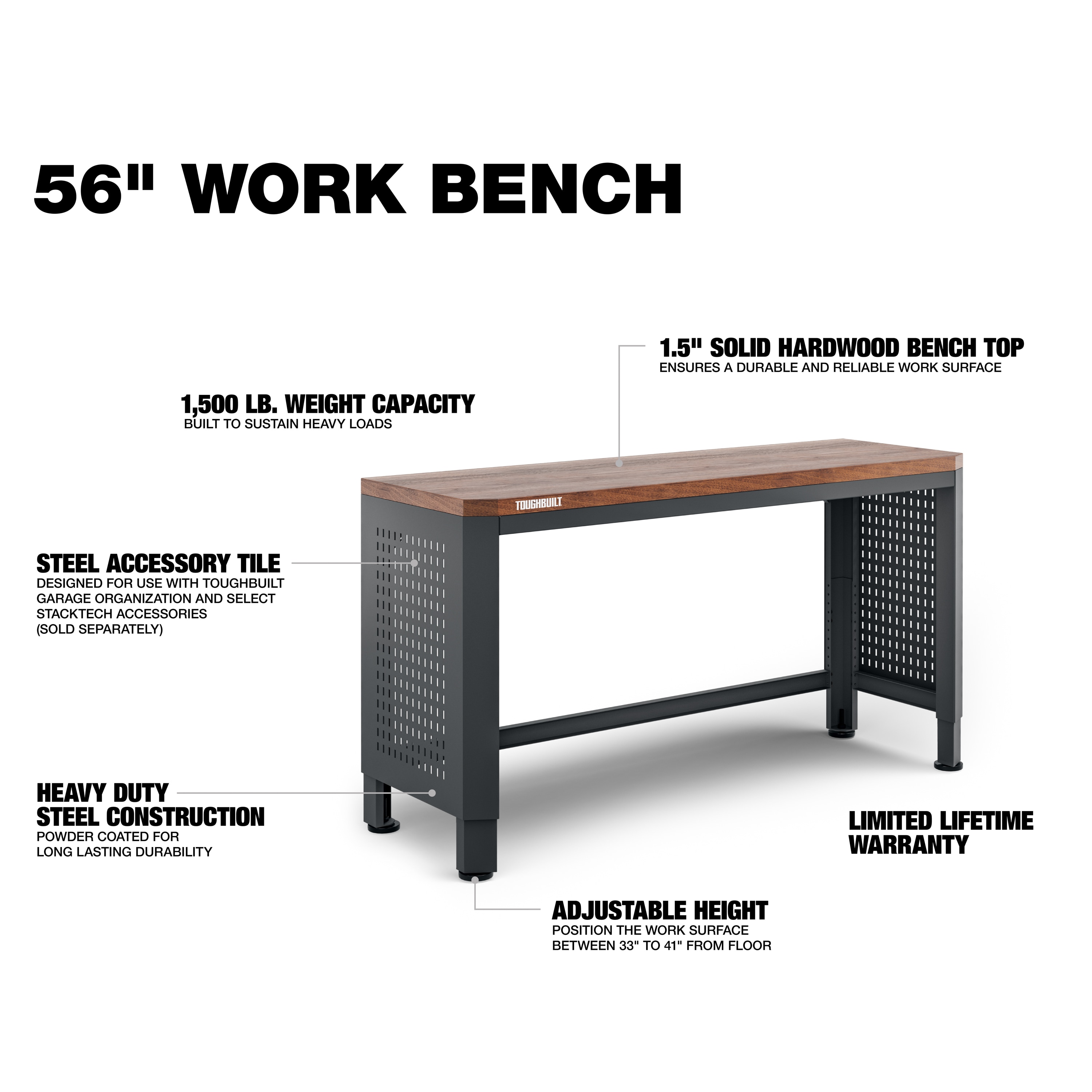 The ToughBuilt® 56-in Workbench with its solid 1.5-in thick hardwood top offers a sturdy work surface for various projects. The slot-tile sides are compatible with a wide range of ToughBuilt accessories such as bins, hooks, and more, allowing you to customize the workbench to suit your specific job. The height adjusts from 33-in to 41-in in 1-inch increments, so you can easily find the perfect ergonomic setup for maximum comfort and efficiency. Upgrade your workspace with the ToughBuilt 56-in Workbench, combining durability, adaptability, and customization to transform your productivity and organization. With thousands of potential storage configurations, you can tailor your ToughBuilt garage storage system to satisfy your needs.