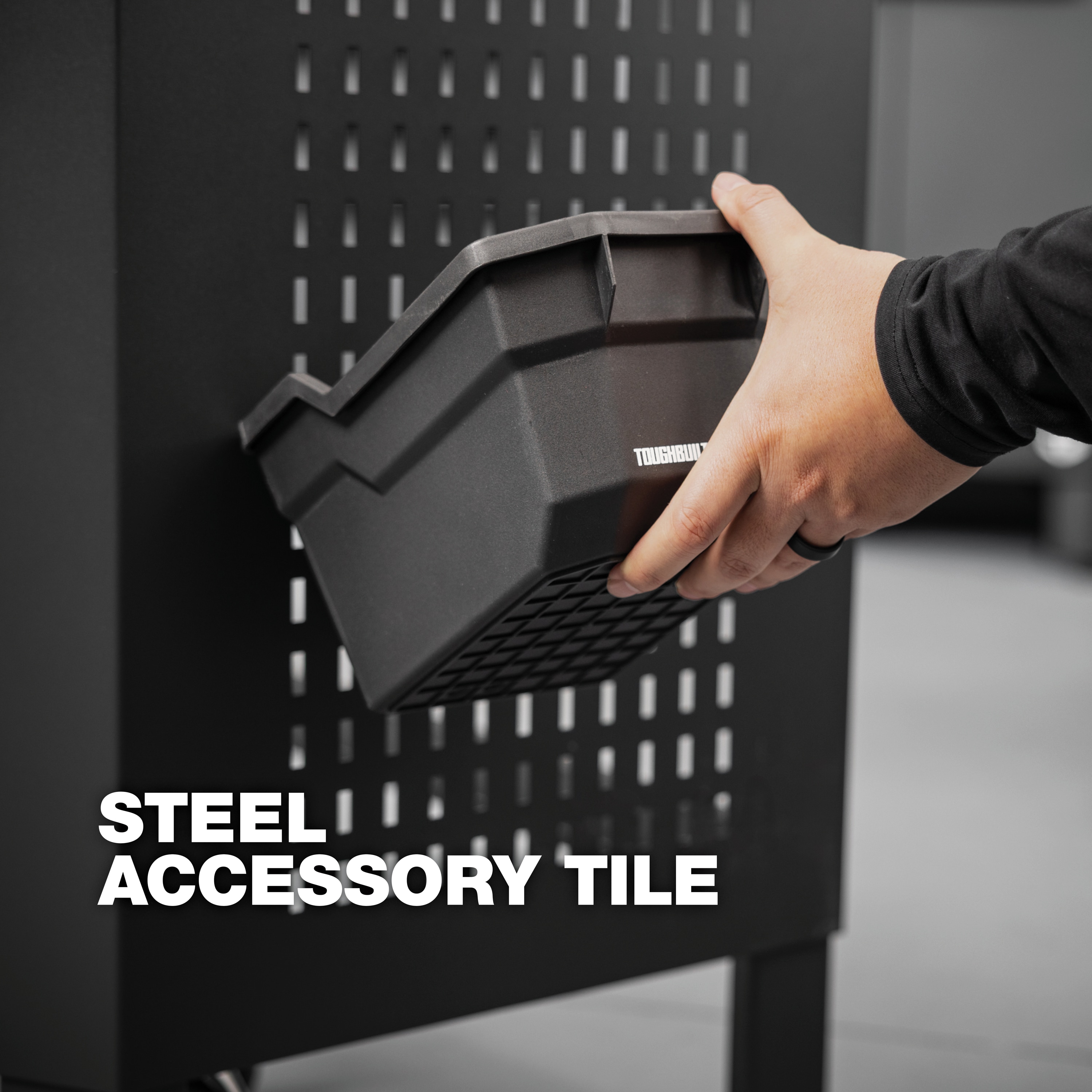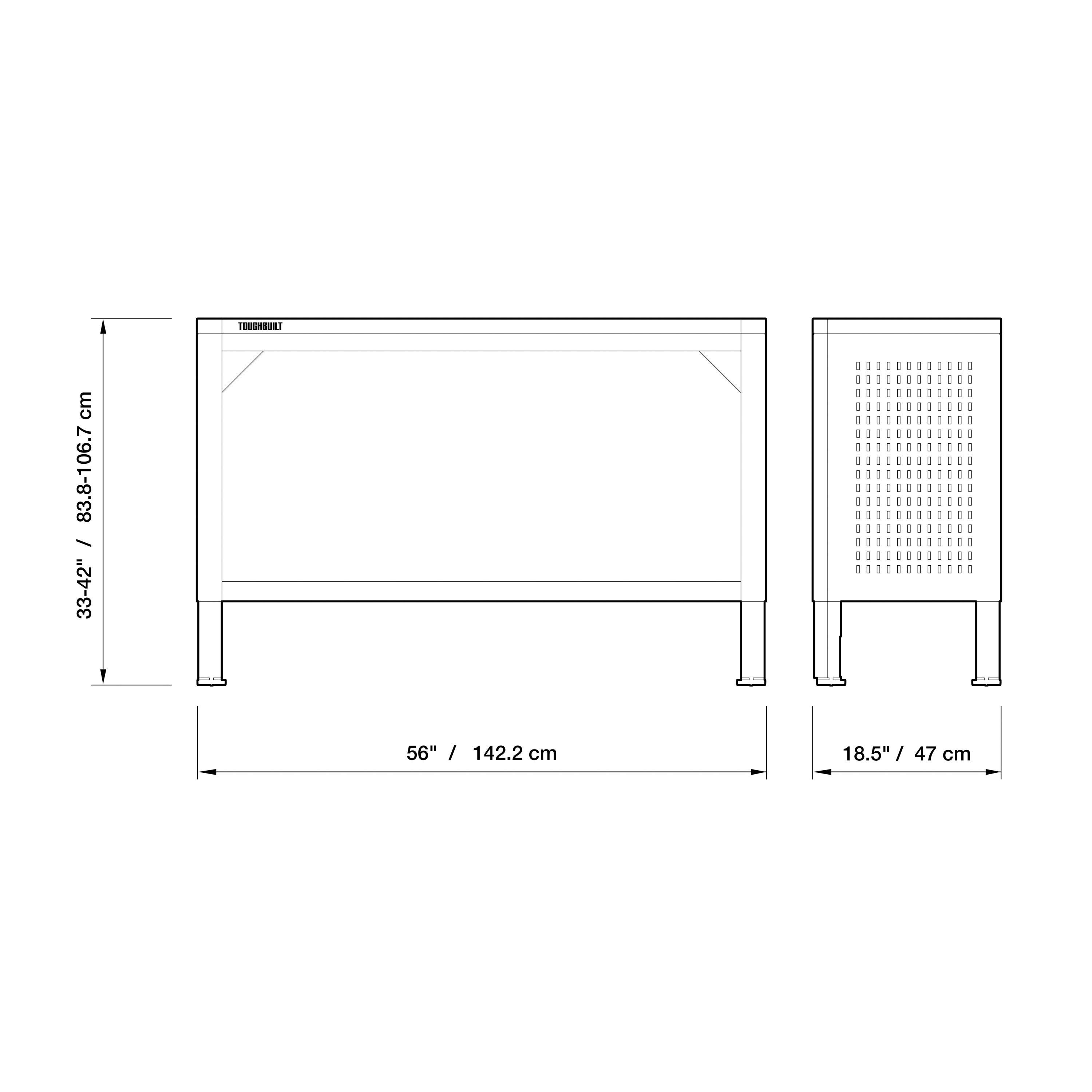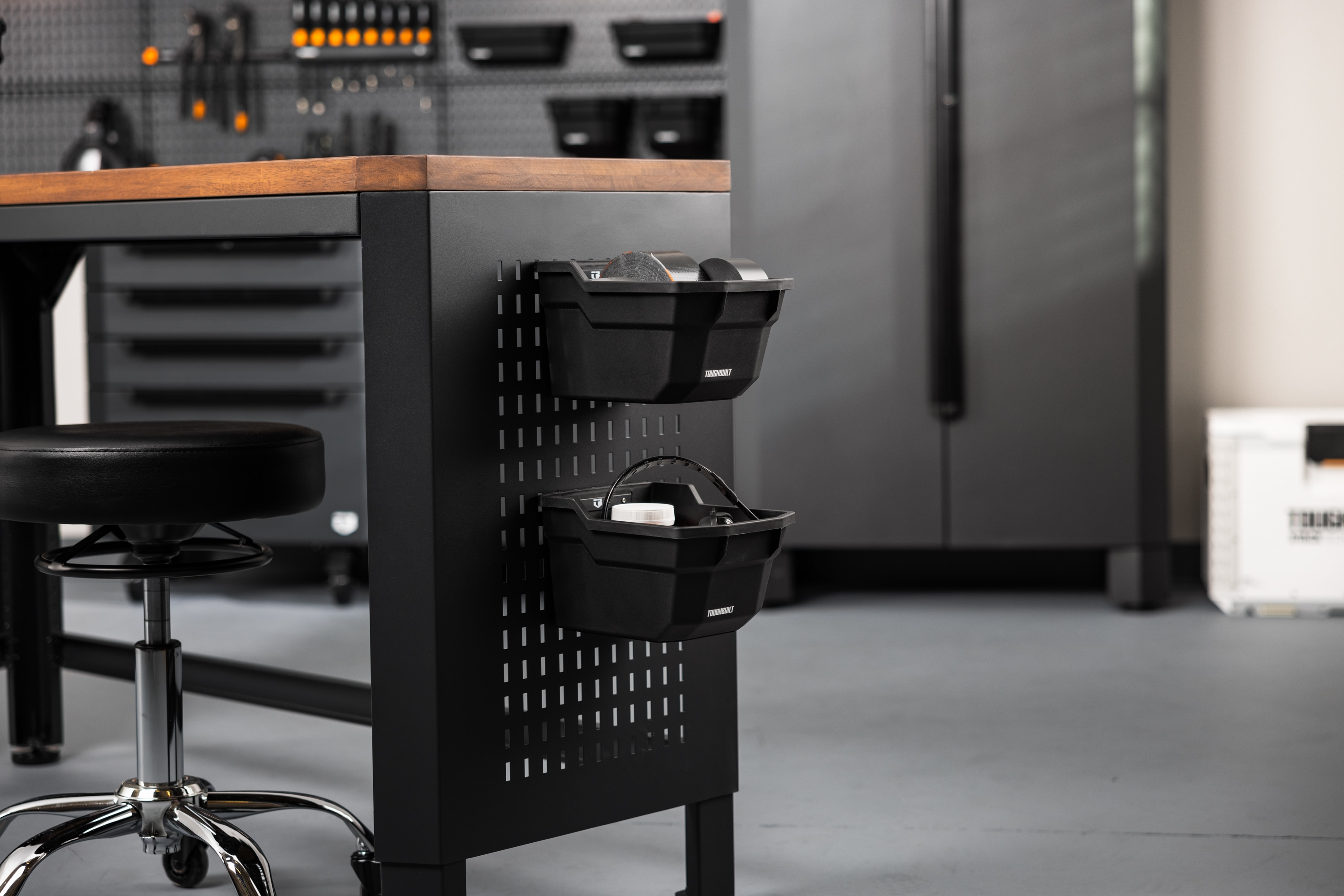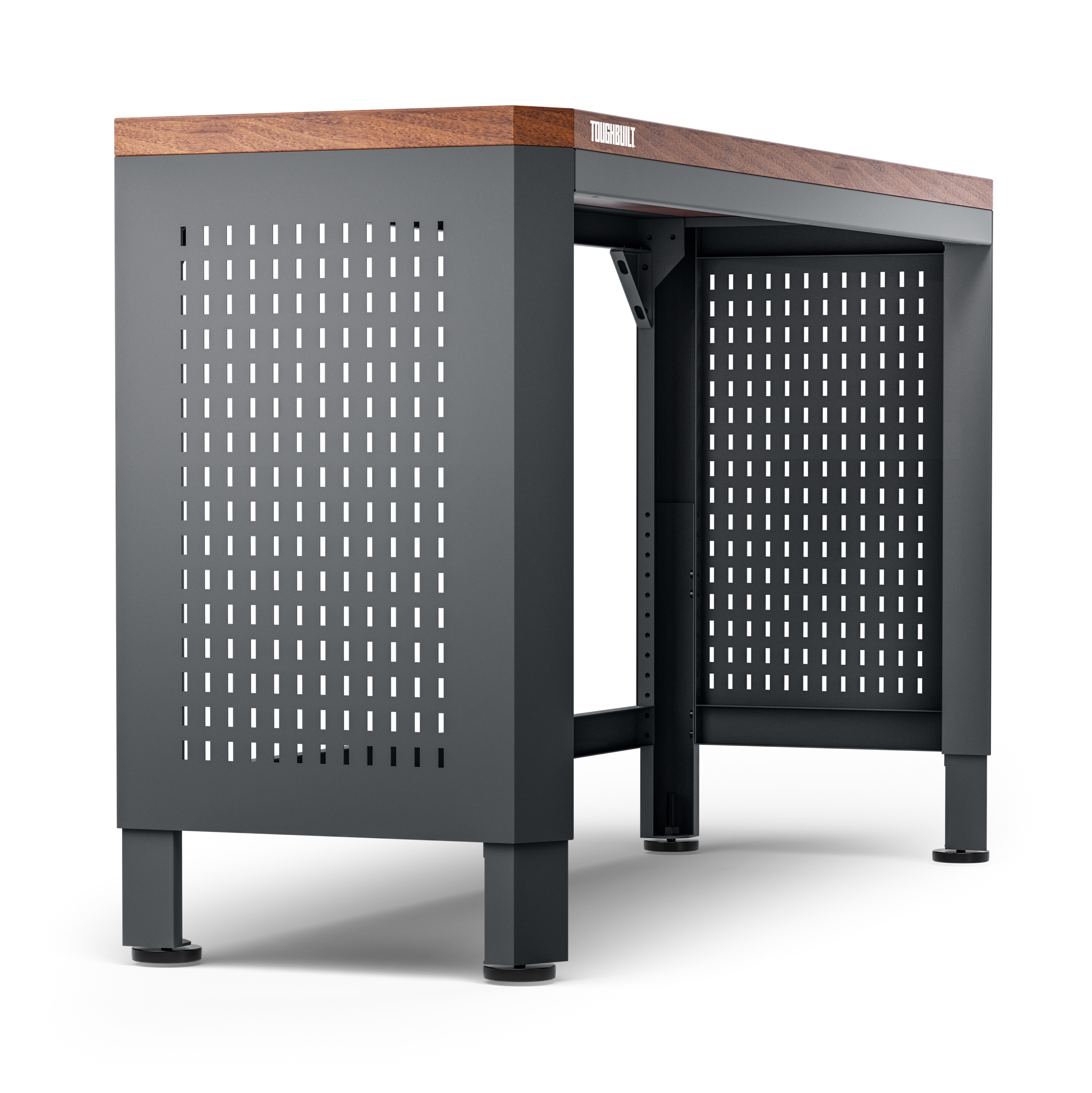 The ToughBuilt® 56-in Workbench with its solid 1.5-in thick hardwood top offers a sturdy work surface for various projects. The slot-tile sides are compatible with a wide range of ToughBuilt accessories such as bins, hooks, and more, allowing you to customize the workbench to suit your specific job. The height adjusts from 33-in to 41-in in 1-inch increments, so you can easily find the perfect ergonomic setup for maximum comfort and efficiency. Upgrade your workspace with the ToughBuilt 56-in Workbench, combining durability, adaptability, and customization to transform your productivity and organization. With thousands of potential storage configurations, you can tailor your ToughBuilt garage storage system to satisfy your needs.