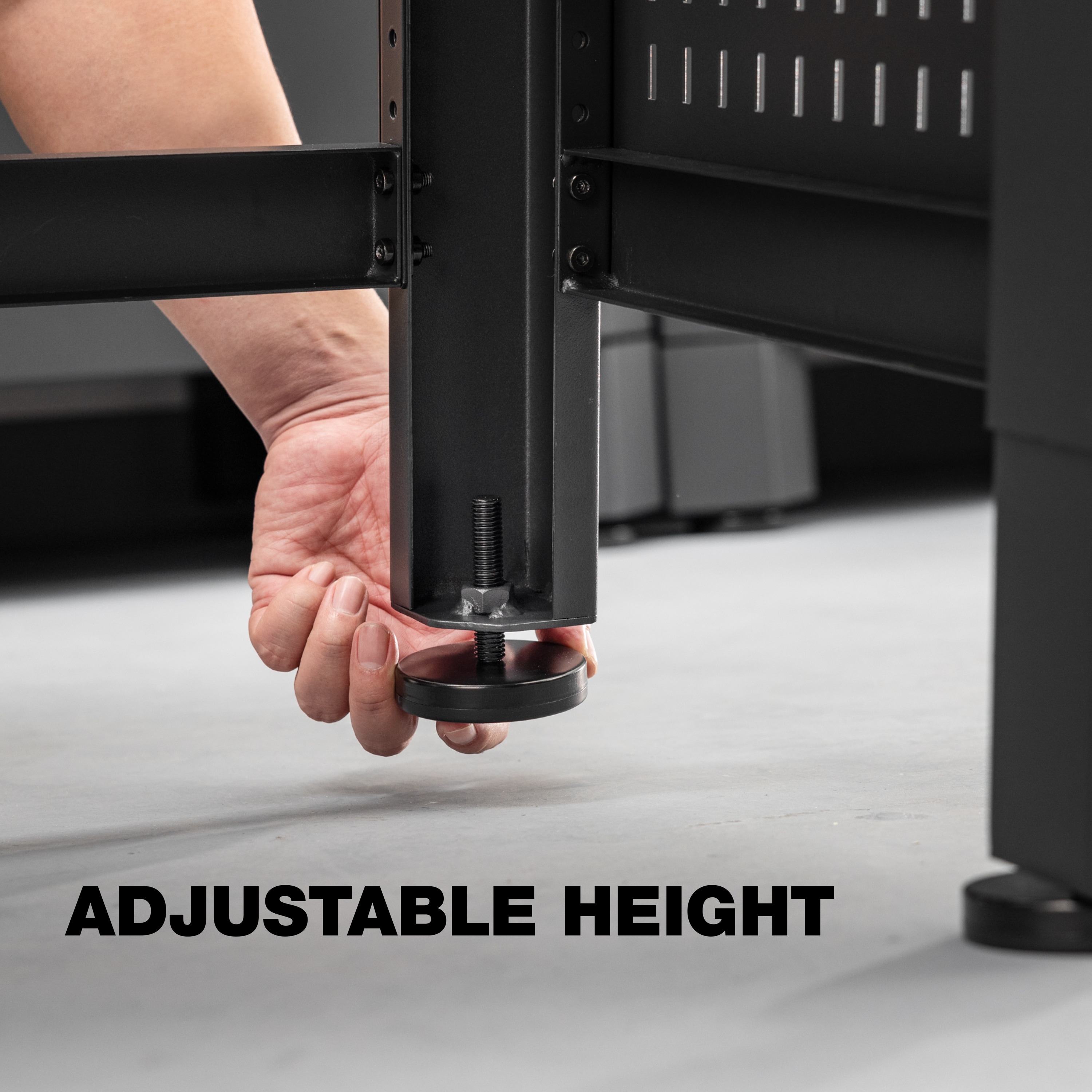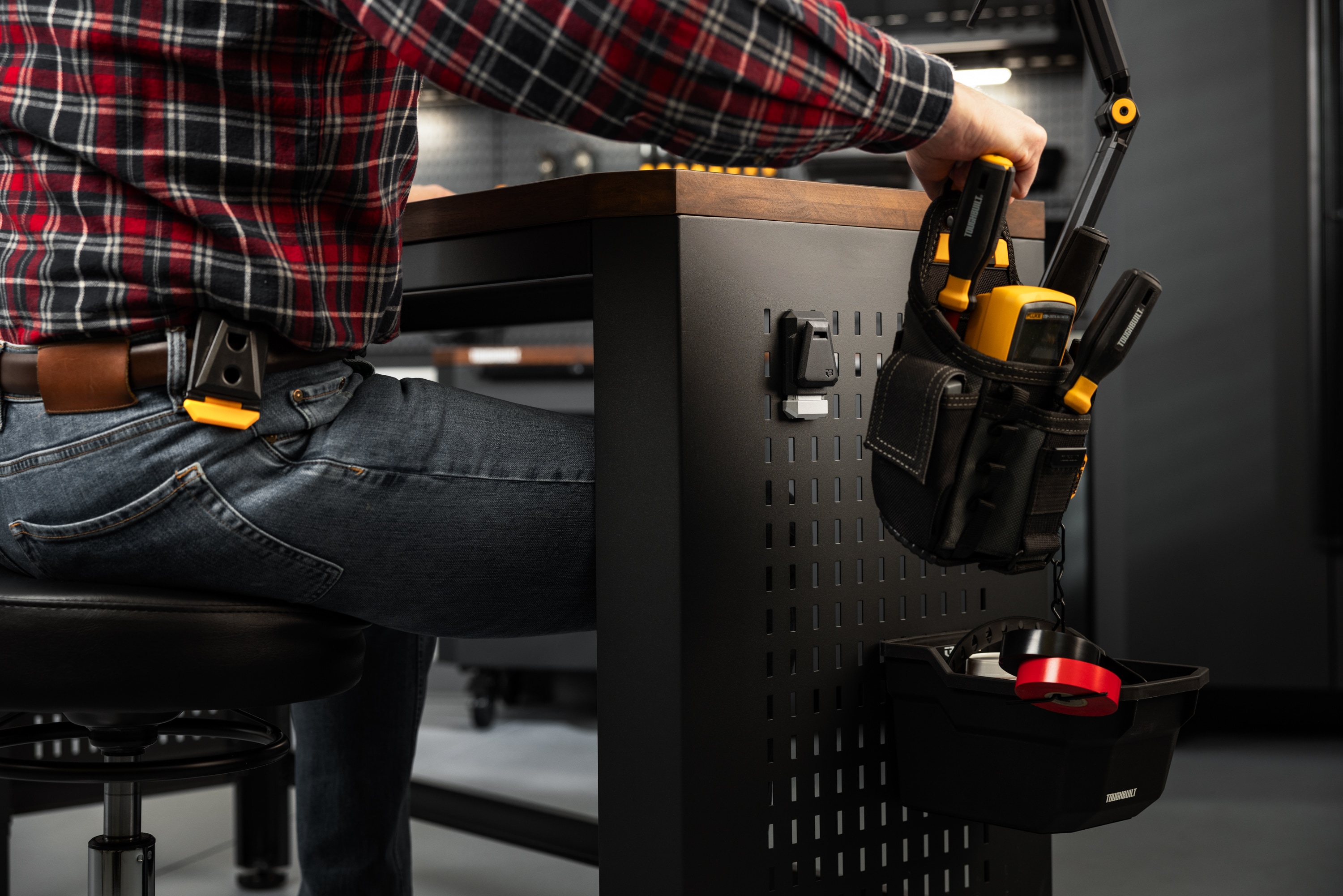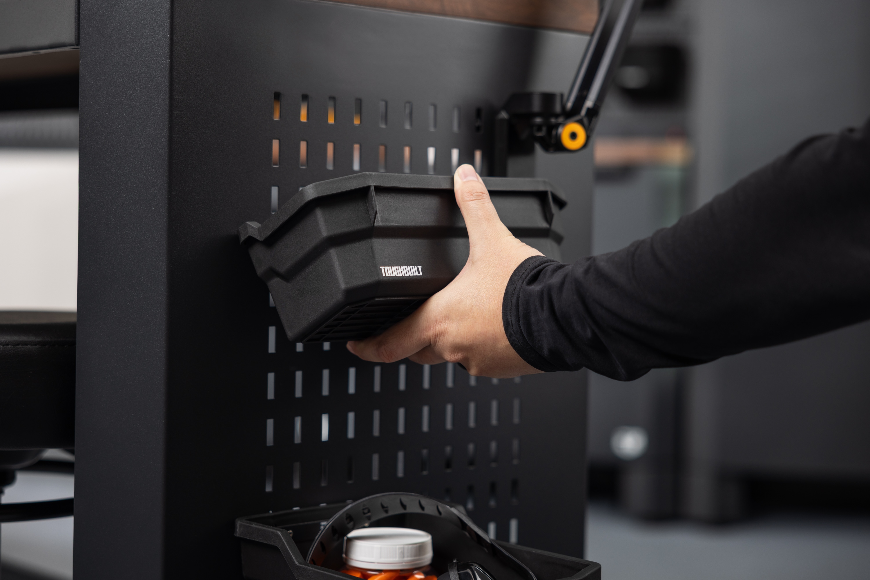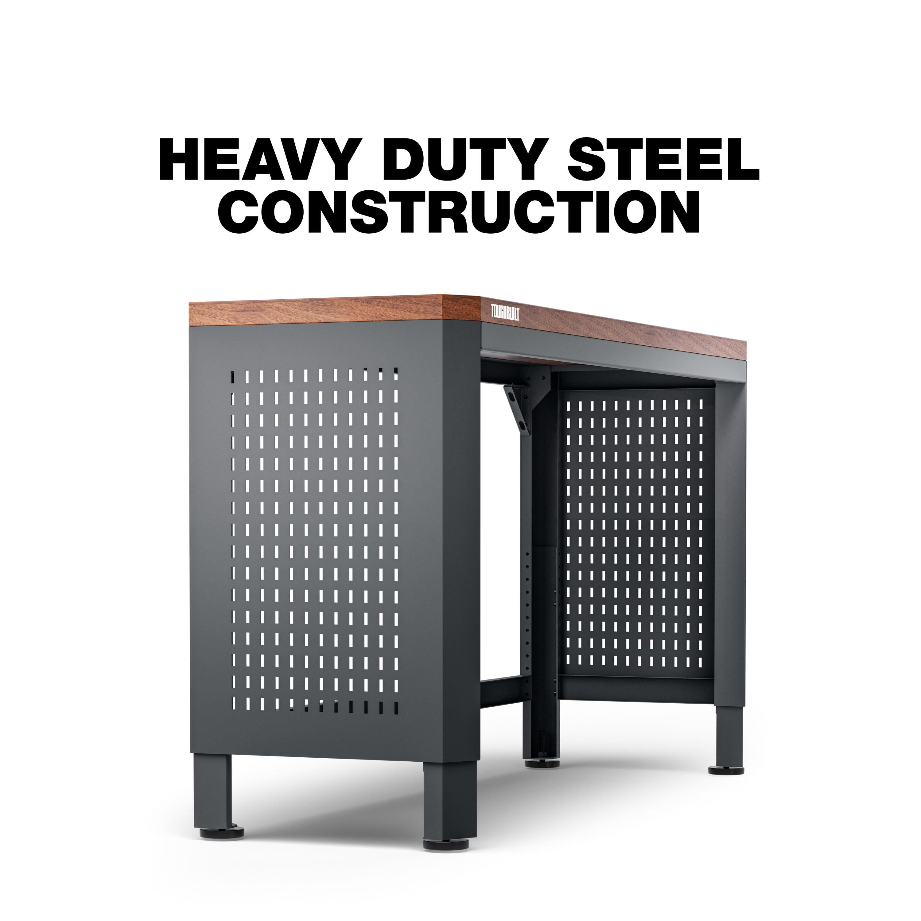 The ToughBuilt® 56-in Workbench with its solid 1.5-in thick hardwood top offers a sturdy work surface for various projects. The slot-tile sides are compatible with a wide range of ToughBuilt accessories such as bins, hooks, and more, allowing you to customize the workbench to suit your specific job. The height adjusts from 33-in to 41-in in 1-inch increments, so you can easily find the perfect ergonomic setup for maximum comfort and efficiency. Upgrade your workspace with the ToughBuilt 56-in Workbench, combining durability, adaptability, and customization to transform your productivity and organization. With thousands of potential storage configurations, you can tailor your ToughBuilt garage storage system to satisfy your needs.