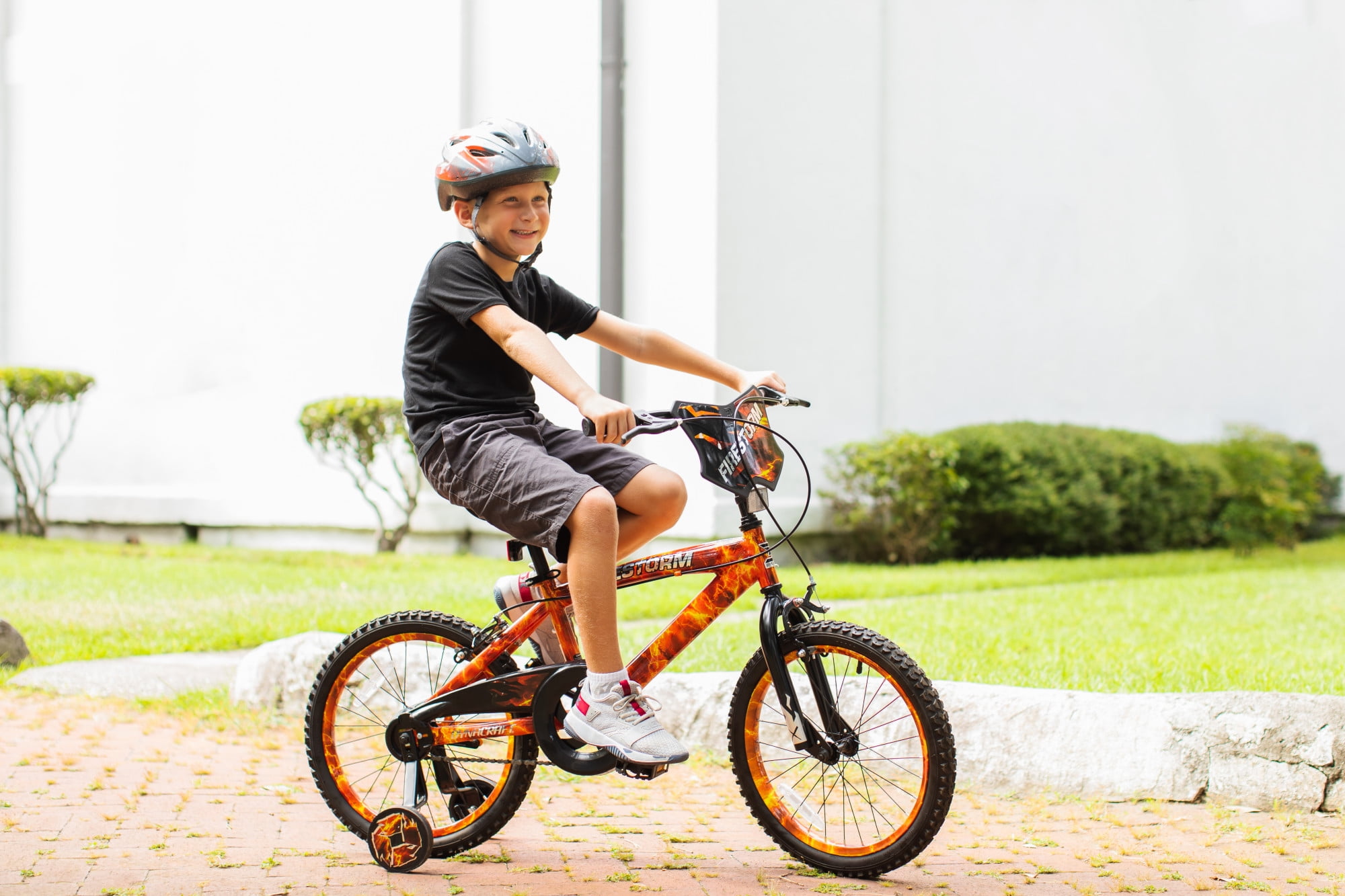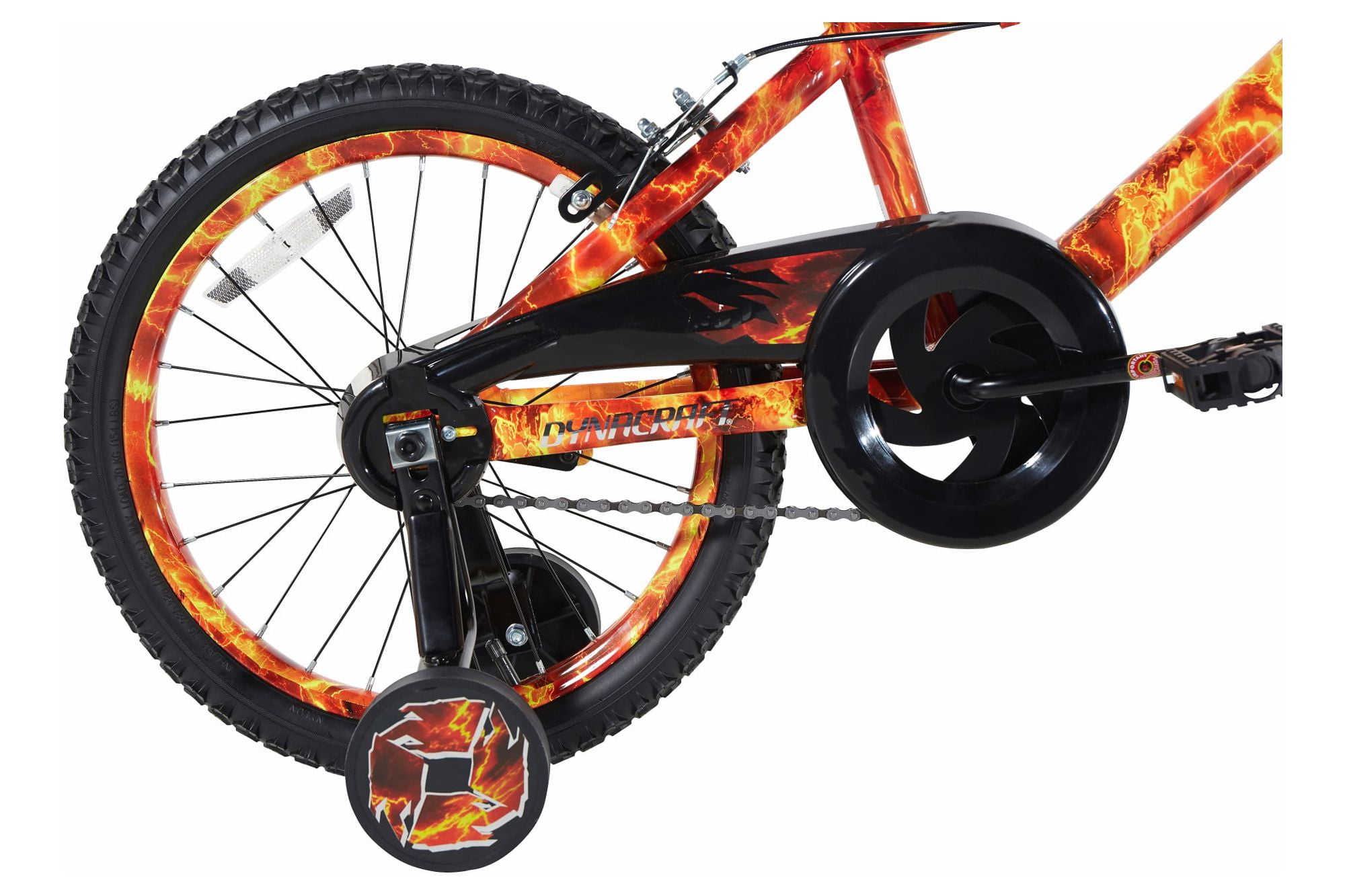 Exciting Design: The 18-inch Dynacraft Firestorm Bike is a thrilling ride designed specifically for boys, featuring a dynamic dipped paint technique with eye-catching red, orange, and yellow accents. Cool Accessories: Your young rider will appreciate the cool handlebar shield and comfortable padded seat, adding style and comfort to his biking adventures. Customized Training Wheels: Equipped with adjustable and removable training wheels, this bike allows your child to progress at their own pace, building confidence as they go. Safety and Durability: With front and rear caliper brakes and a sturdy steel frame, safety is paramount, ensuring a secure and reliable ride for your active little one. Plus, it carries the trusted Dynacraft brand name, known for quality and reliability. Limited Lifetime Warranty on Frame and Fork