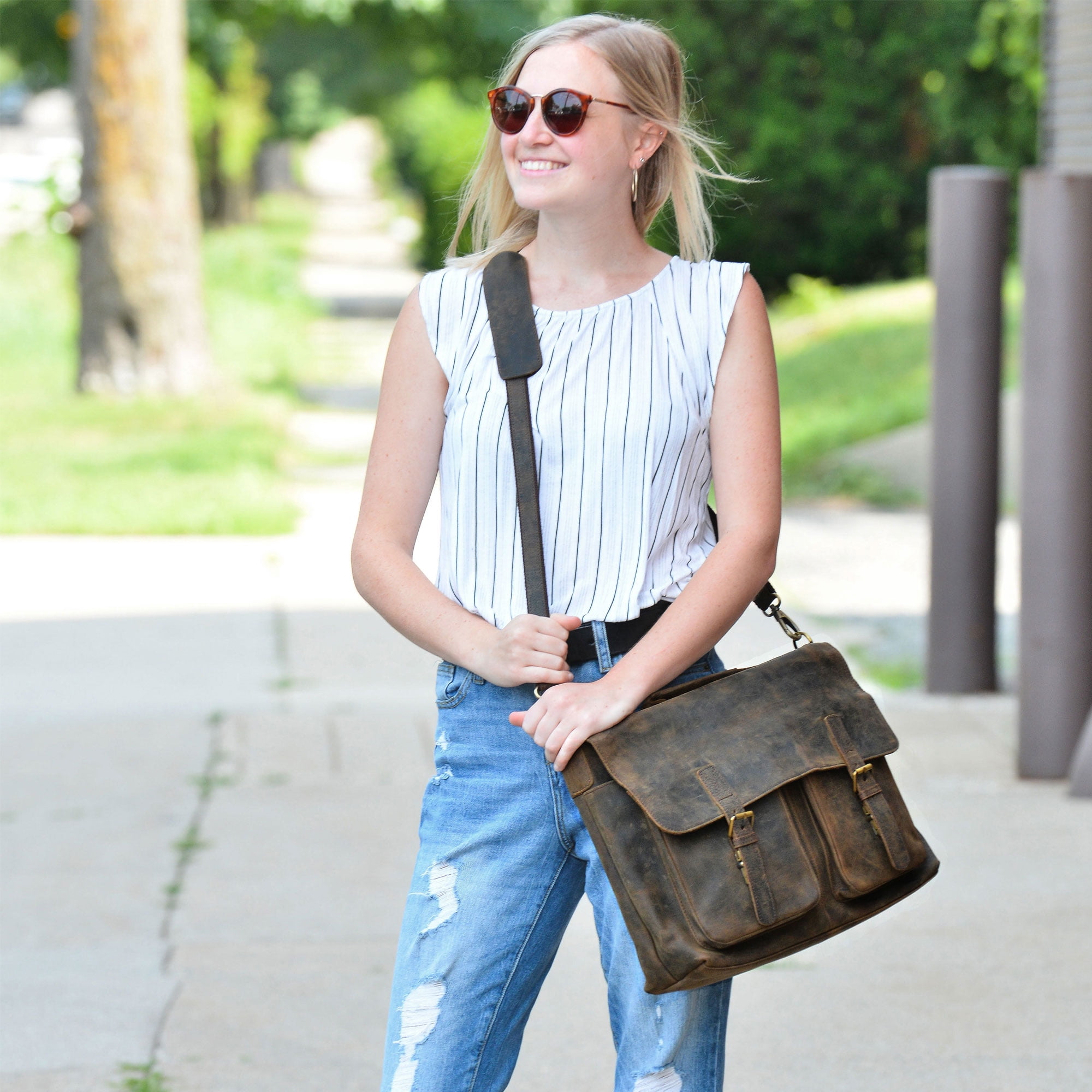This 18-inch leather messenger bag is made from full-grain leather and lined with durable fabric. It features a padded compartment for laptops up to 18 inches, along with multiple interior and exterior pockets for storing tablets, documents, phones, cards, and pens. The bag includes an adjustable shoulder strap, concealed snap closures, and a rustic brown finish for a professional look. Ideal for work, school, or travel. Product Dimensions: 18″ L x 13″ H x 5″ D Material: Full-grain leather Laptop Compatibility: Up to 18 inches Compartments: Main padded laptop compartment, two front pockets, interior pen/card slots, external zippered pocket Closure Type: Concealed snap buttons Carry Style: Adjustable shoulder strap