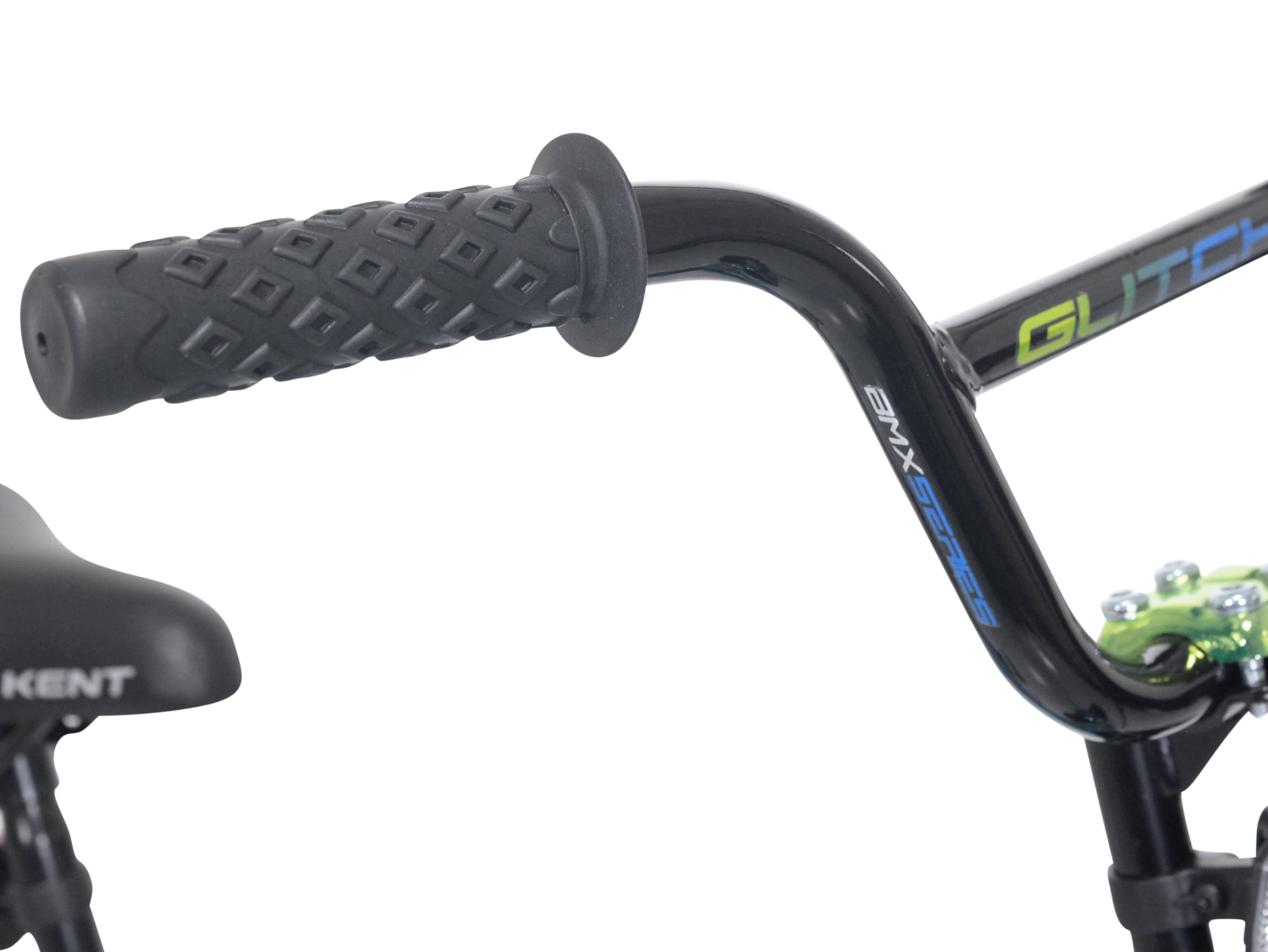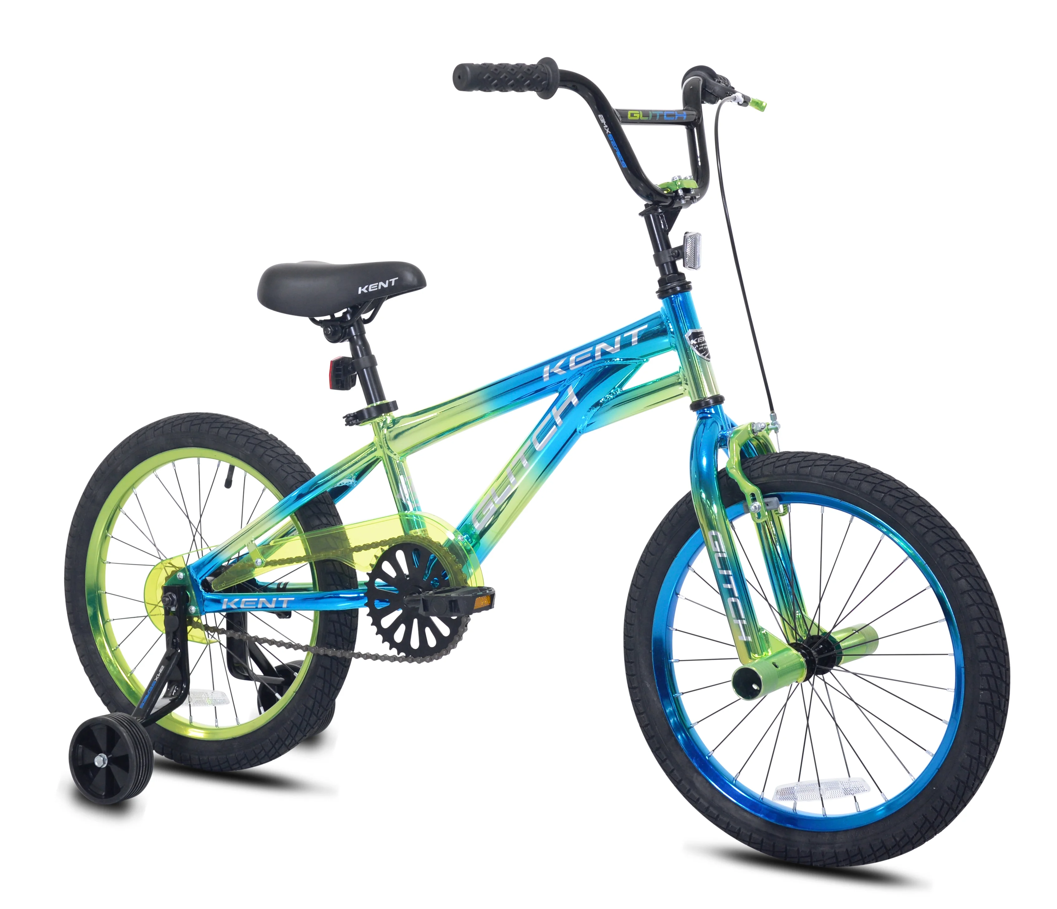 The Kent 18″ Glitch BMX Child Bicycle is a great bike for your young male rider! It is a single speed BMX style bike with a steel freestyle frame and heavy duty training wheels. This bike also has front pegs, textured hand-grips and a translucent green chain guard. The quick adjust seat lets the rider adjust as they grow. It has a four bolt stem, foot brakes and dual hand brakes for added convenience. This is a great bike for learning and beyond with a super cool paint job! It also comes with removable training wheels.