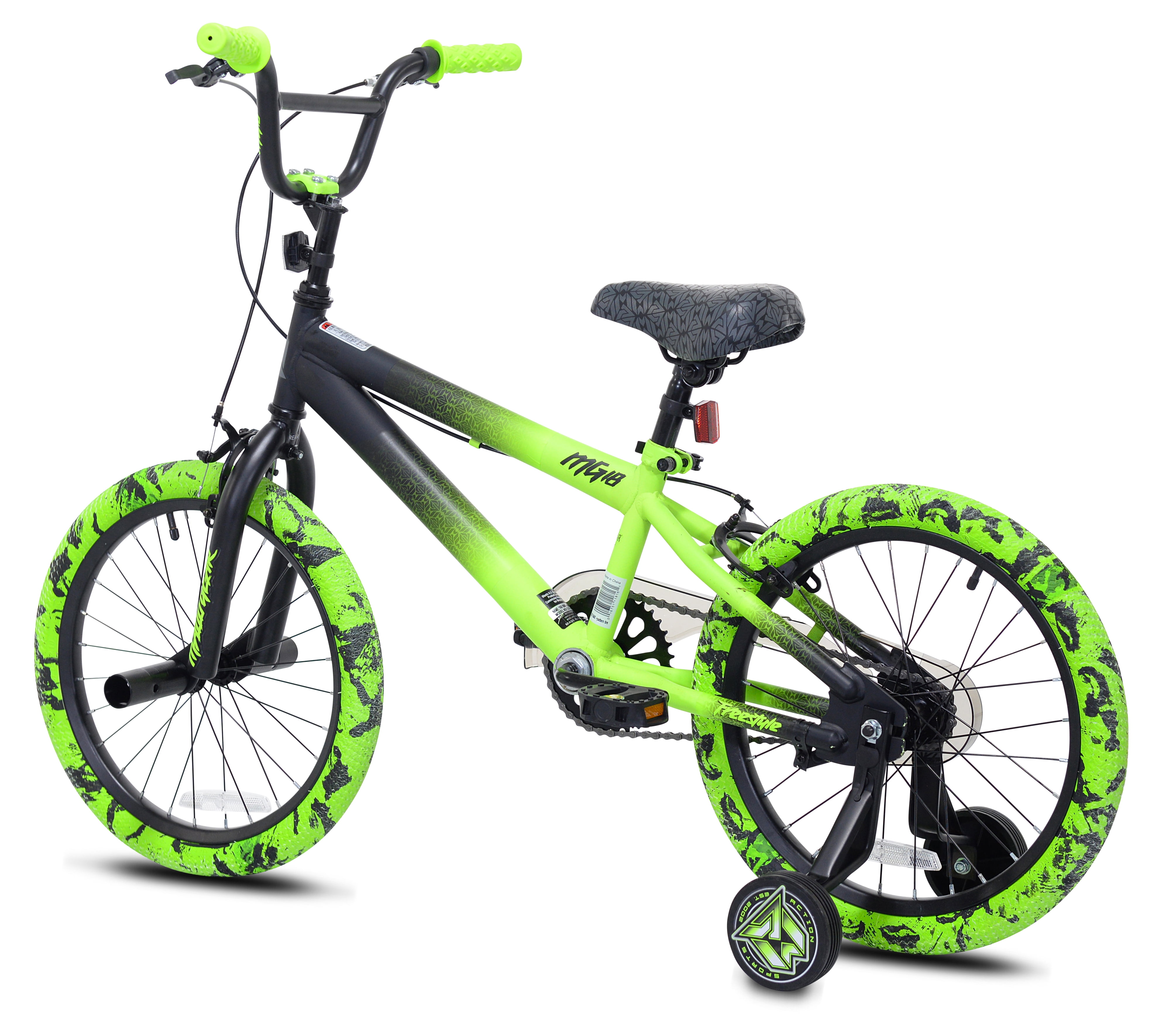 Durable steel frame in black and green Adjustable BMX handlebar male bike Adjustable quick-release saddle Front BMX Pegs Colorful BMX tires Removable and adjustable training wheels Front and rear side pull caliper brakes Age Group: Child Gender: Male