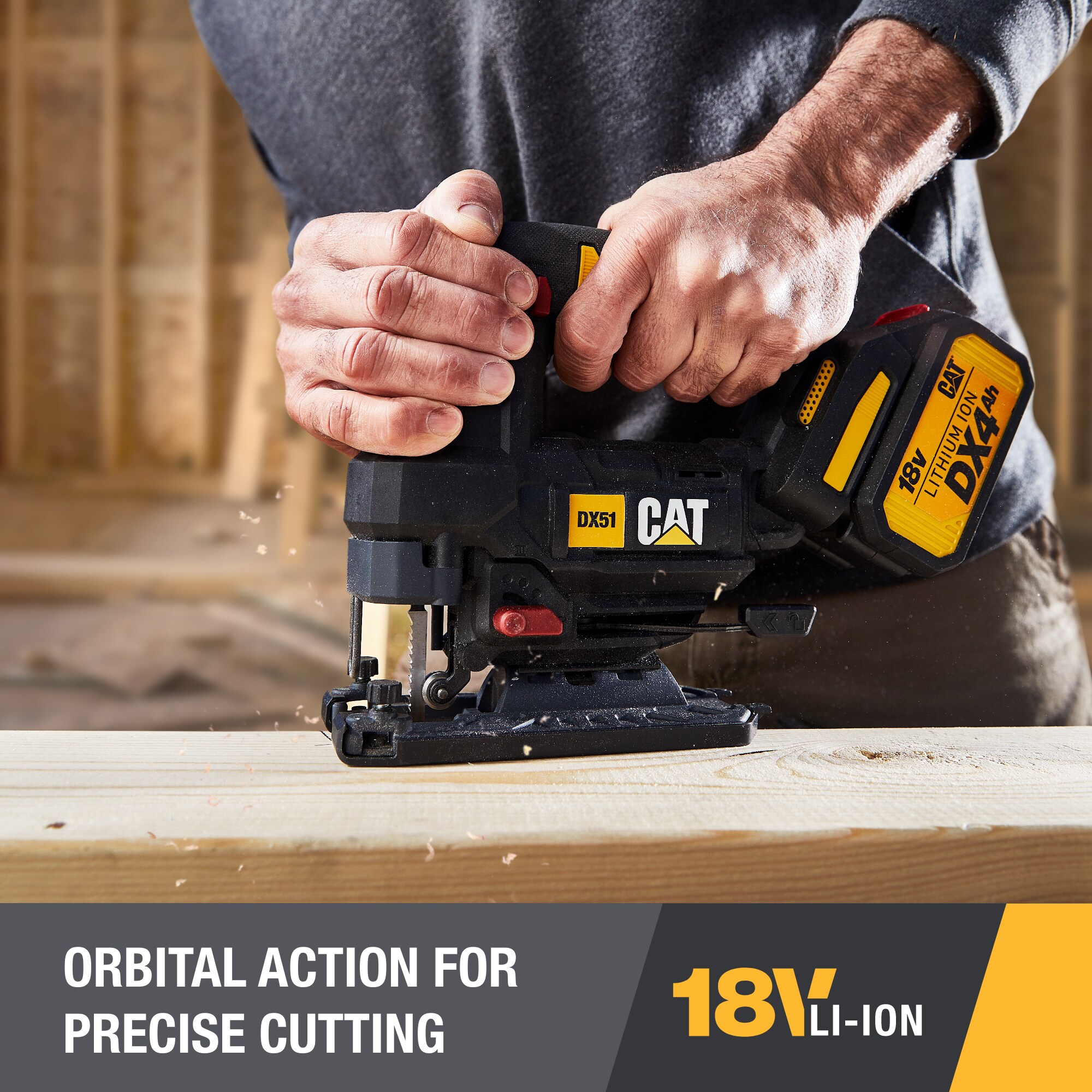 The Cat® DX51B 18V 1 FOR ALL Cordless Jig Saw with Brushless Motor was born from superior engineering and next-generation battery technology. The result is a cordless jig saw boasting outstanding performance that lives up to the legendary Cat® reputation for quality and durability. Made specifically to be the professional user’s jig saw, with the power and functionality to handle a wide range of jig saw applications, and the rugged construction to take on tougher jobs. The Cat® Cordless Jig Saw was built with a high-efficiency brushless motor that provides 25% more power, 50% more run time and 10% longer life than comparable jig saws with brushed motors. And it runs on the revolutionary 18V 1 FOR ALL battery platform which features cutting-edge advancements in battery tech for more performance and run time. This model doesn’t come with a battery, but that’s by design. It’s meant for existing Cat® 1 FOR ALL users that already have a battery or two to use with this jig saw. Every 18V 1 FOR ALL battery runs every tool on the platform, saving time and money in the long run. Innovative ergonomic design makes this jig saw easier on the user, too, even for extended periods during the toughest applications. Cat® Tools are made for the pros, with advanced features and capabilities that add up to higher productivity and extended run times, with less operator fatigue and reduced downtime. Let’s Do The Work.
