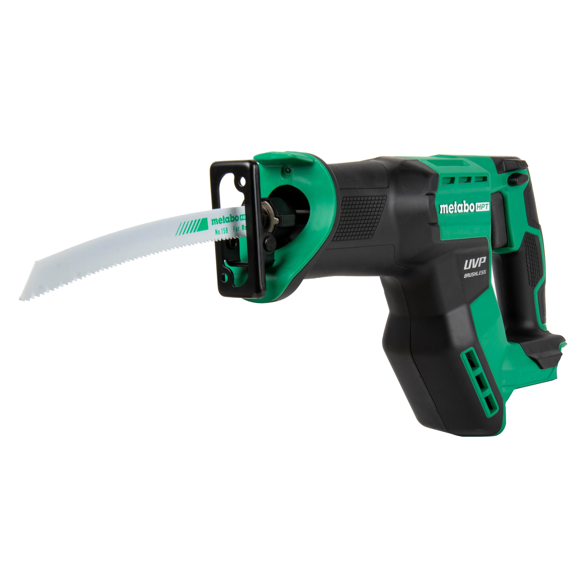 Metabo HPT introduces the 18V MultiVolt Cordless Brushless Compact Reciprocating Saw (model CR18DMAQ4M) perfect for the remodeler, plumber, electrician, framer, and DIYer working in confined spaces. This 18V compact style reciprocating saw delivers big time cutting power with its 1-1/8″ stroke and 3,000 max SPMs for top of class cutting speed through wood, PVC, and metal. Vibration is minimal with Metabo HPT’s exclusive User Vibration Protection (UVP) counterbalance technology. It features an adjustable and pivoting shoe, LED work light, and a variable speed dial. The CR18DMAQ4 18V Cordless Compact Reciprocating Saw is part of the ever expanding MultiVolt System of 18-Volt and 36-Volt power tools from Metabo HPT. GO lighter with 18V batteries or GO longer with the unique MultiVolt battery that works on both 18V and 36V tools to double your runtime for up to 8.0Ah of runtime per charge for more power on the GO.