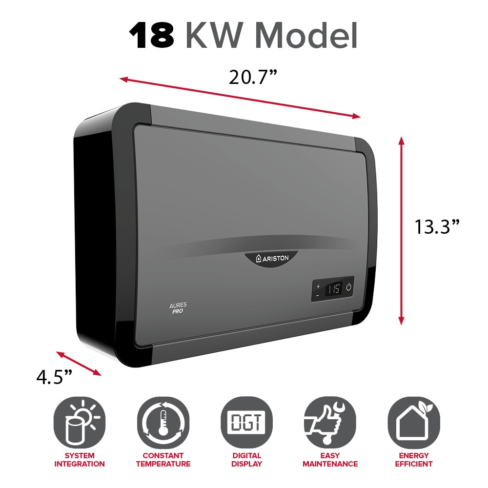 The Ariston Aures Pro 18k-Watt 240-Volt 3.51 GPM Stainless Steel Electric Tankless Water Heater is powerful enough for the whole home but small enough to go unnoticed. The compact size allows for easy installation wherever you need it while its sleek design can fit into any room decor. Temperature management has never been easier with the advanced hi-tech display and soft touch buttons. Maintenance is a breeze with frontal, easy access to all internal components. The Ariston Aures Pro comes backed by a 6-Year limited warranty 2-Year parts.