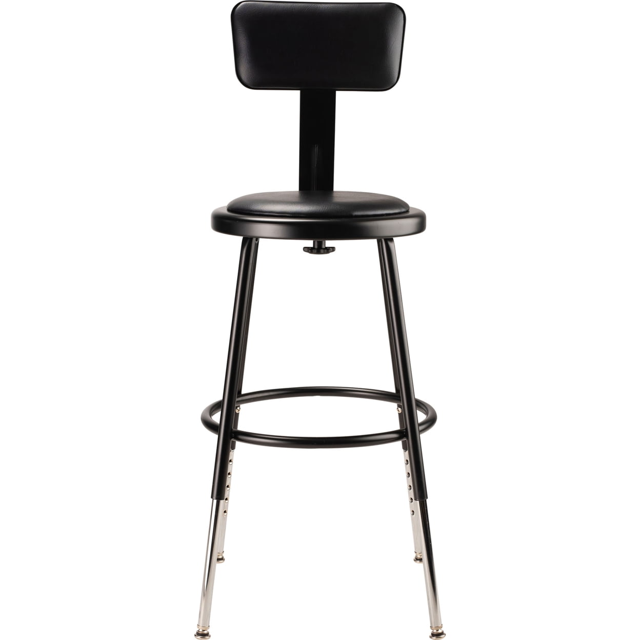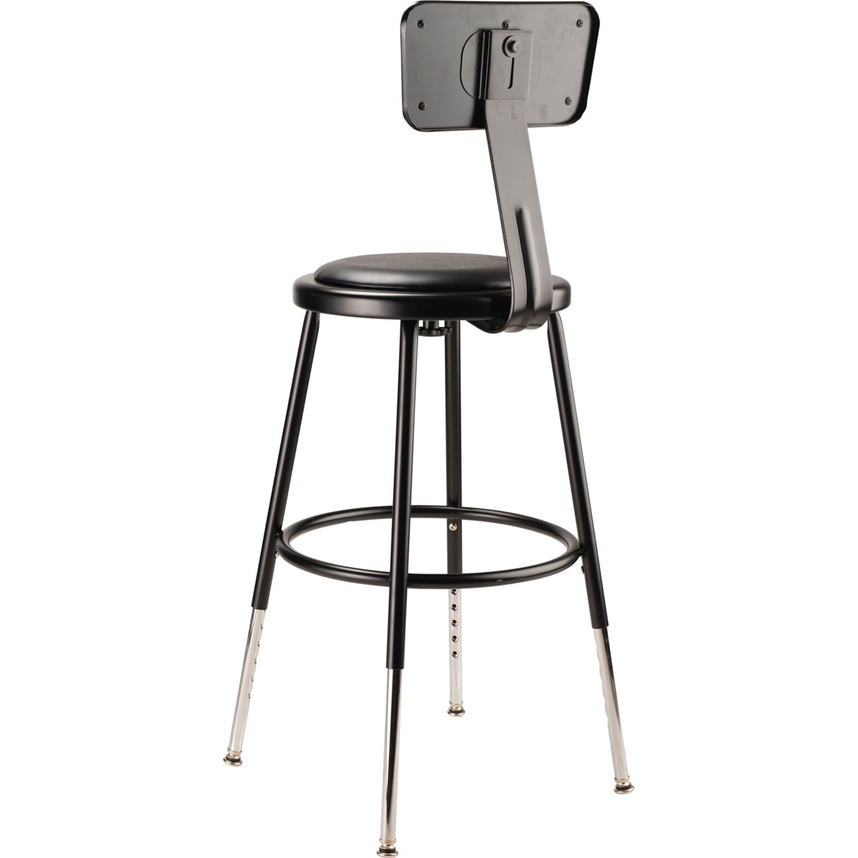 19″-27″ Height Adjustable Heavy Duty Vinyl Padded Steel Stool with Backrest – Black Description: The fortified construction and soft comfort of the 6400-10 Series heavy-duty padded stools with backrests are ideal for hands-on educational settings like art rooms, science labs, home economics or shop classrooms. These reliable stools feature a sturdy frame of 18-gauge steel tubing securely welded to a 14 inch diameter seat pan. Riveted through the steel pan are . 5 inch -thick black vinyl cushioning that will provide years of dependable use. Footrest ring is securely bonded to each leg with four spotwell contact points. Height-adjustable legs extend from 18.5 inches to 26.5 inches in 1-inch increments and adjustable padded backrests can be moved 2 inches up/down and forward/back. Seat Is 14 -in Diameter With An 11 1/2″ Diameter 1/2″ Vinyl Padding Riveted Through The Steel Seat Pan. Black Color Frame And Legs. Features Vinyl Padded Backrest Is 6″H And 12″W And Adjusts Up/Down And Forward/Back. Features Height Adjustable Legs; Adjust In 1″ Increments Up To Eight Additional Inches. 4.75mm MDF board, with rivet heads fully embedded. 300 lb Weight Capacity. Features: 7/8″ O.D. 18-Gauge Steel Tubing With Adjustable Legs Surface Color: Black. Frame Color: Black Product Dimensions: 14″W x 32-41.5″H, Weight: 18 lbs Foot Rings, 5/8″ O.D. Are Welded To Each Leg By 4 Contact Points For Added Rigidity 10 Year Warranty Brand Name: National Public Seating Model No: 1048-6418HB-10