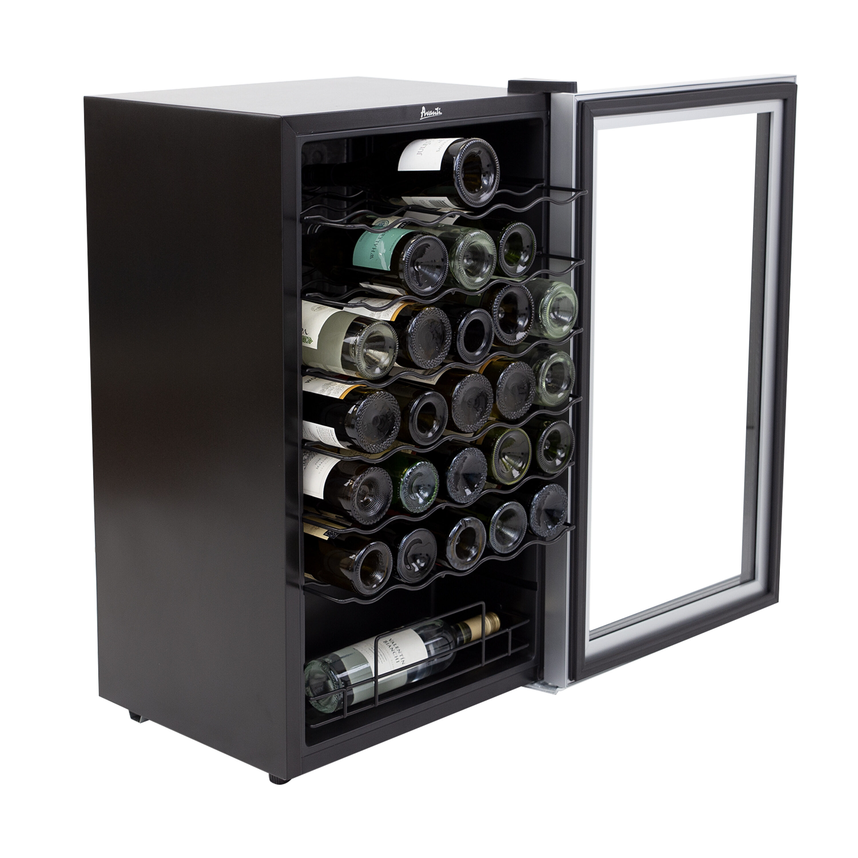 Keep wine perfectly chilled in the 34-bottle capacity wine chiller from Avanti. This wine fridge is ideal for the living room, office, man cave, she-shed, bar, basement or anywhere you want to beautifully store your wine collection. Easily view your wine choices through the glass door. This compact wine cooler features automatic defrost so your wine stays perfectly chilled. Select the right settings at the touch of a button and monitor the temperature (°C/°F) with the temperature monitor display.