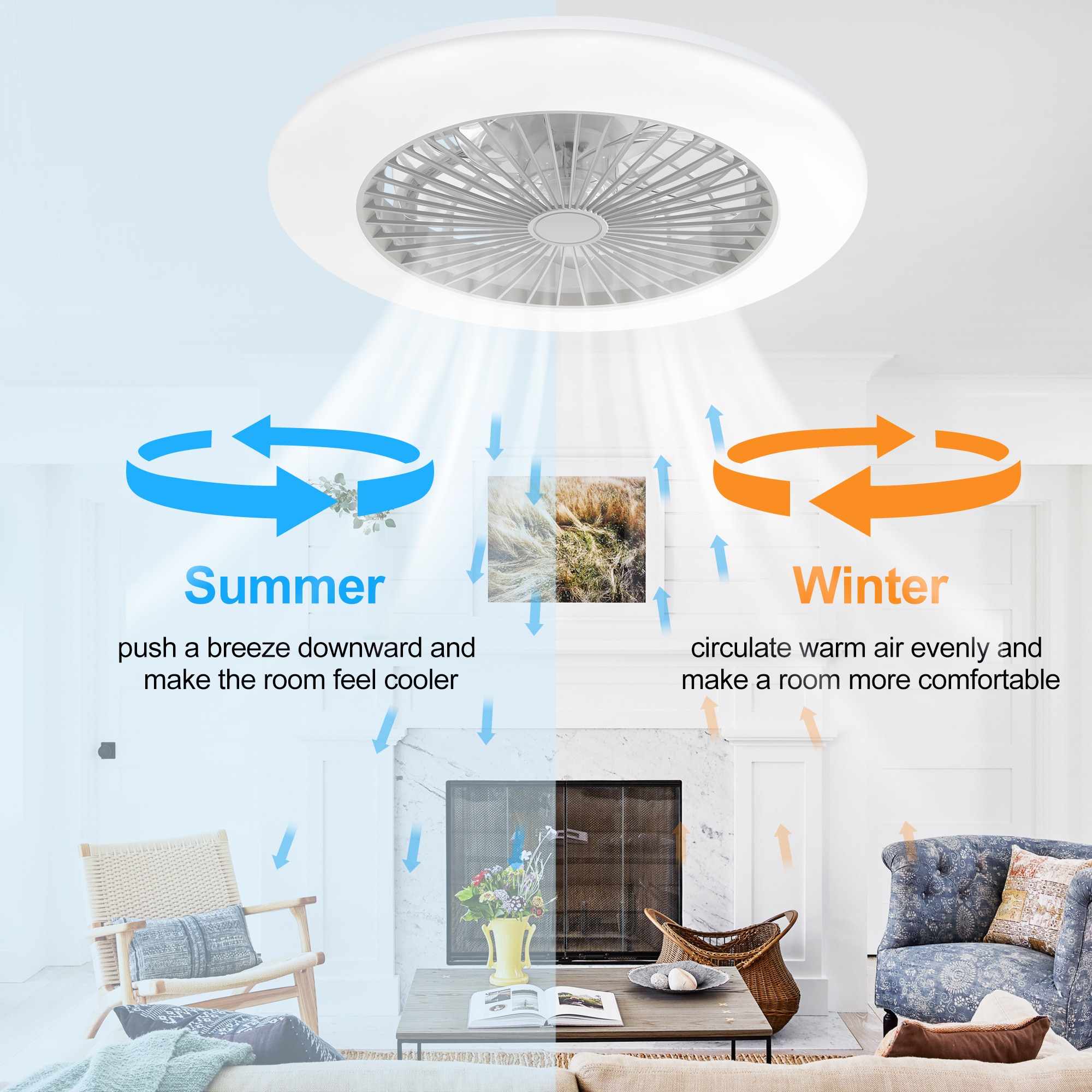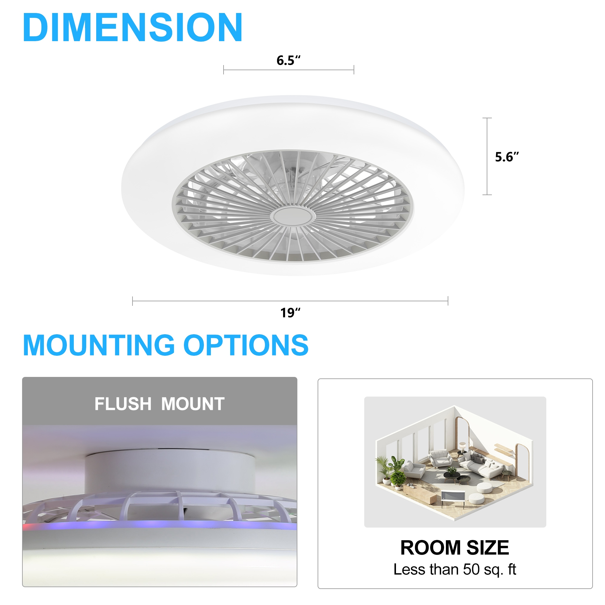 This 19” modern ceiling fan has a powerful motor, which brings powerful wind but is smooth. RGB LED can display according to the rhythm of the music played by the device. Flush mount ceiling fans are equipped with low-noise wind motors, which can keep you and your family away from any noise interference, create a comfortable and quiet living environment, and improve sleep quality, LED lights are energy-saving and environmentally friendly, with low power consumption, and can save large electricity bills. Plus, it can be compatible with a remote control and a mobile APP to control the chandelier ceiling fan from anywhere in the room. Applicable space: Living room dining room kitchen study bedroom small bedroom meeting room small living room others. Please allow 1-3cm to differ due to manual measurement. Due to the different displays and different lights, the picture may not reflect the actual color of the item.