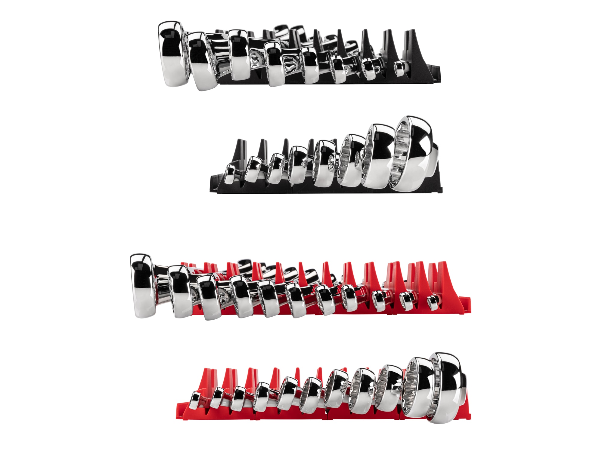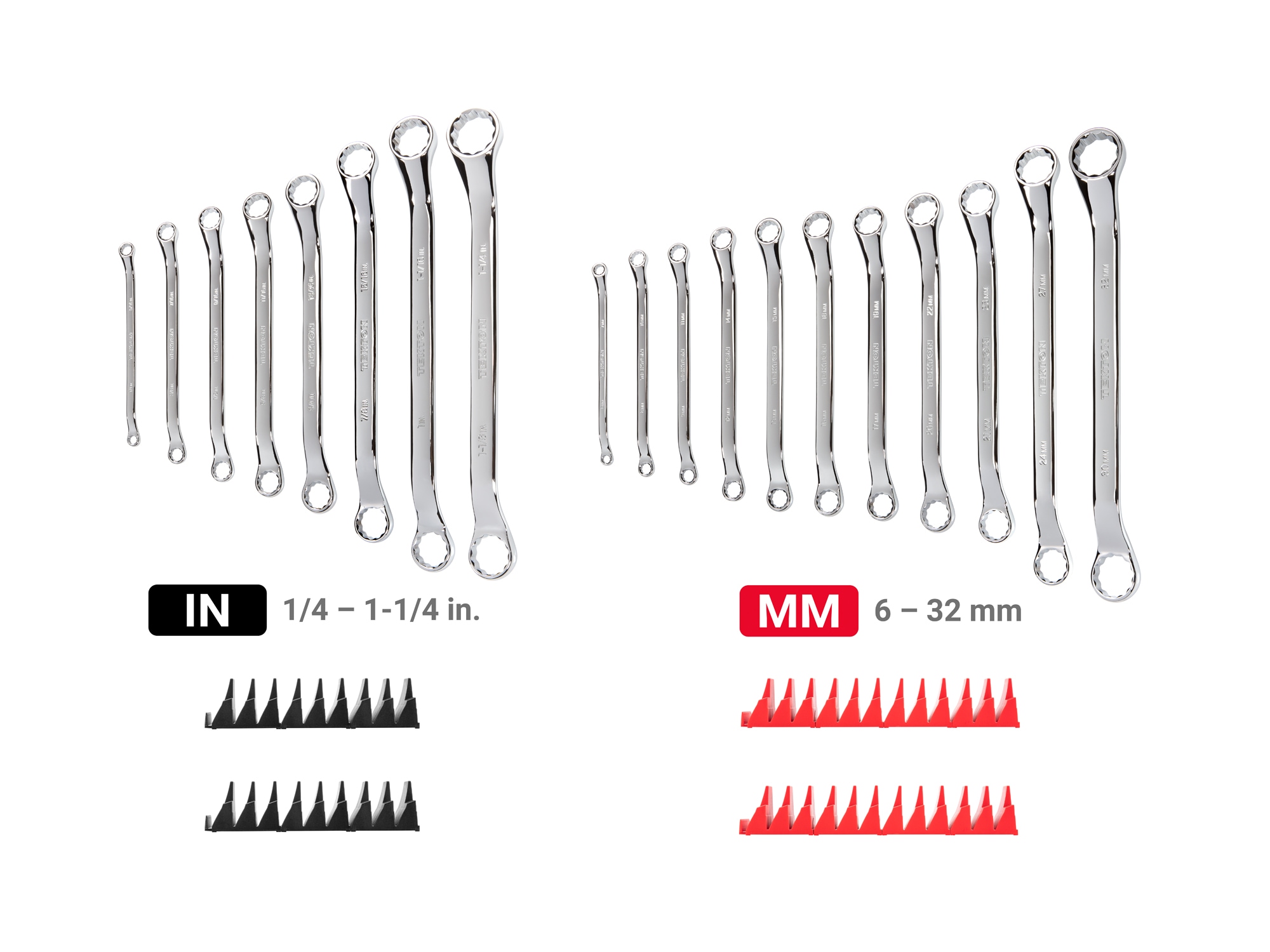 Tekton offset box end wrenches have 45 degree offset box ends, creating clearance for your fingers and making it easier to reach around obstructions. The 12-point box ends fit multiple types of fasteners including 6-point, 12-point, and square. Radiused corners in the box ends apply force to a fastener’s flat sides, rather than its corners, preventing fastener round-off. Each wrench is permanently marked with a stamped marking for easy size identification. The wrenches are made from 6140 chromium-vanadium steel and are heat-treated to 42–48 HRC. Chrome plating on the wrenches provide resistance to corrosion. This set includes a modular wrench organizer that fits most toolbox drawers, keeping your wrenches neatly arranged with consistent spacing.