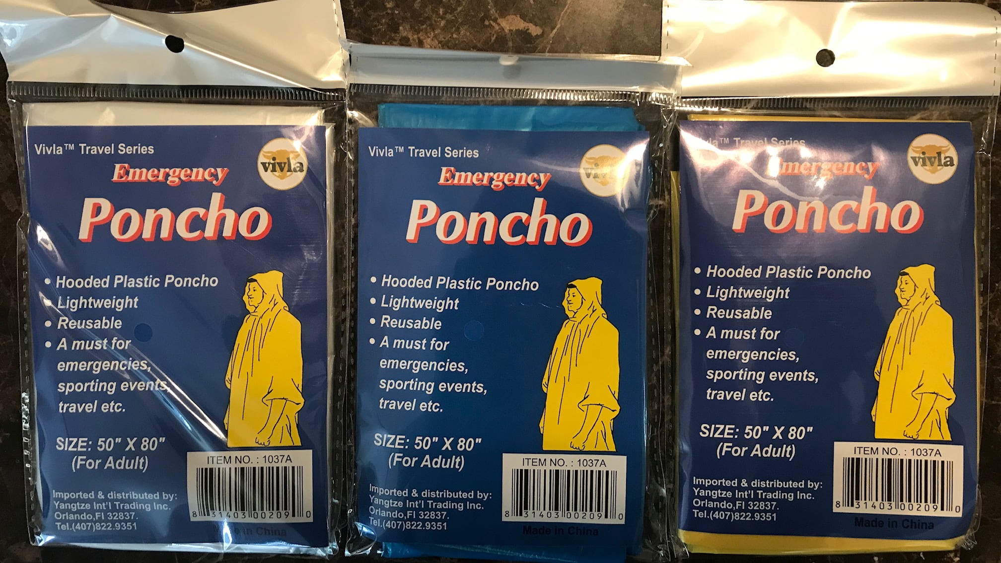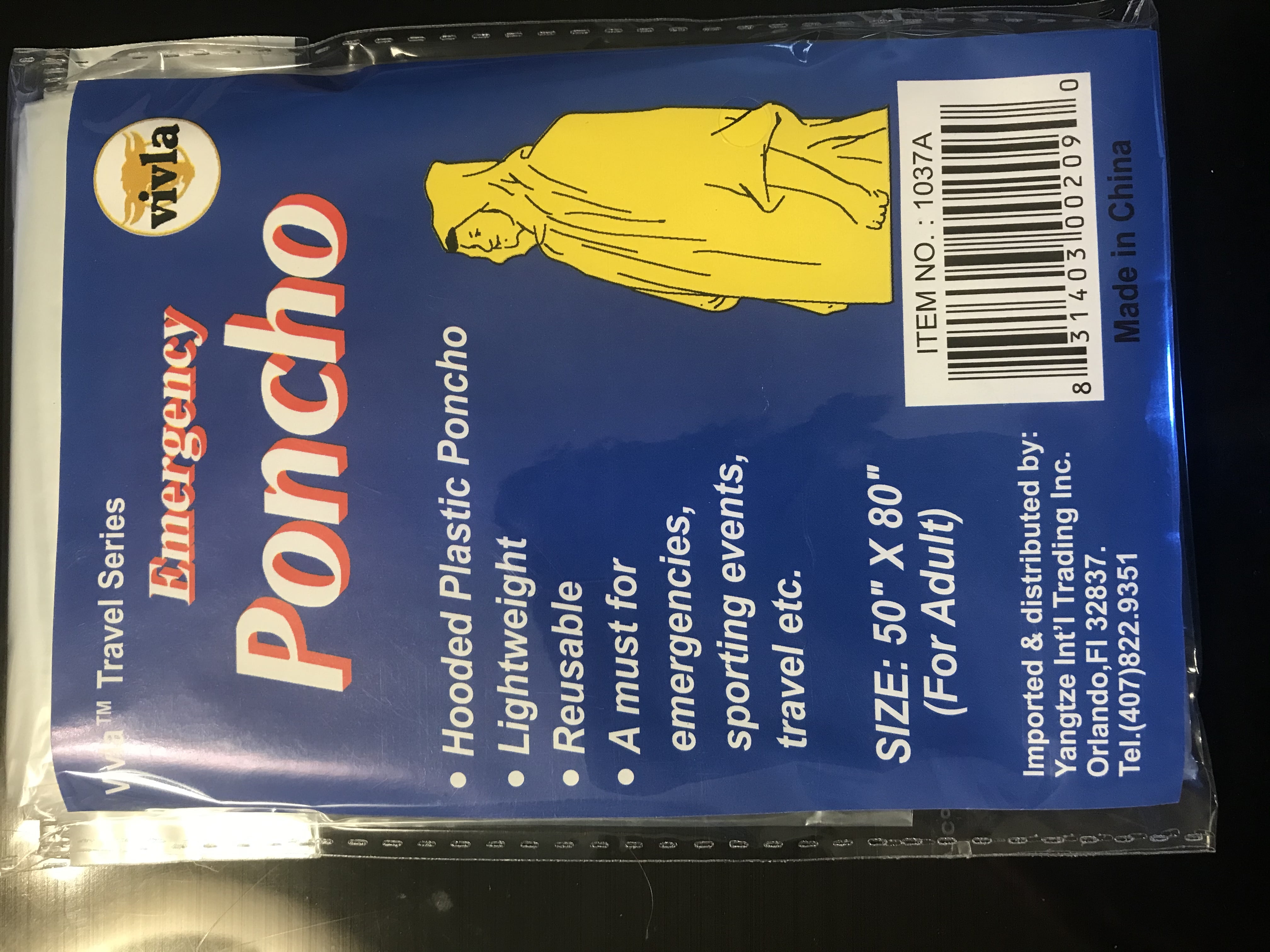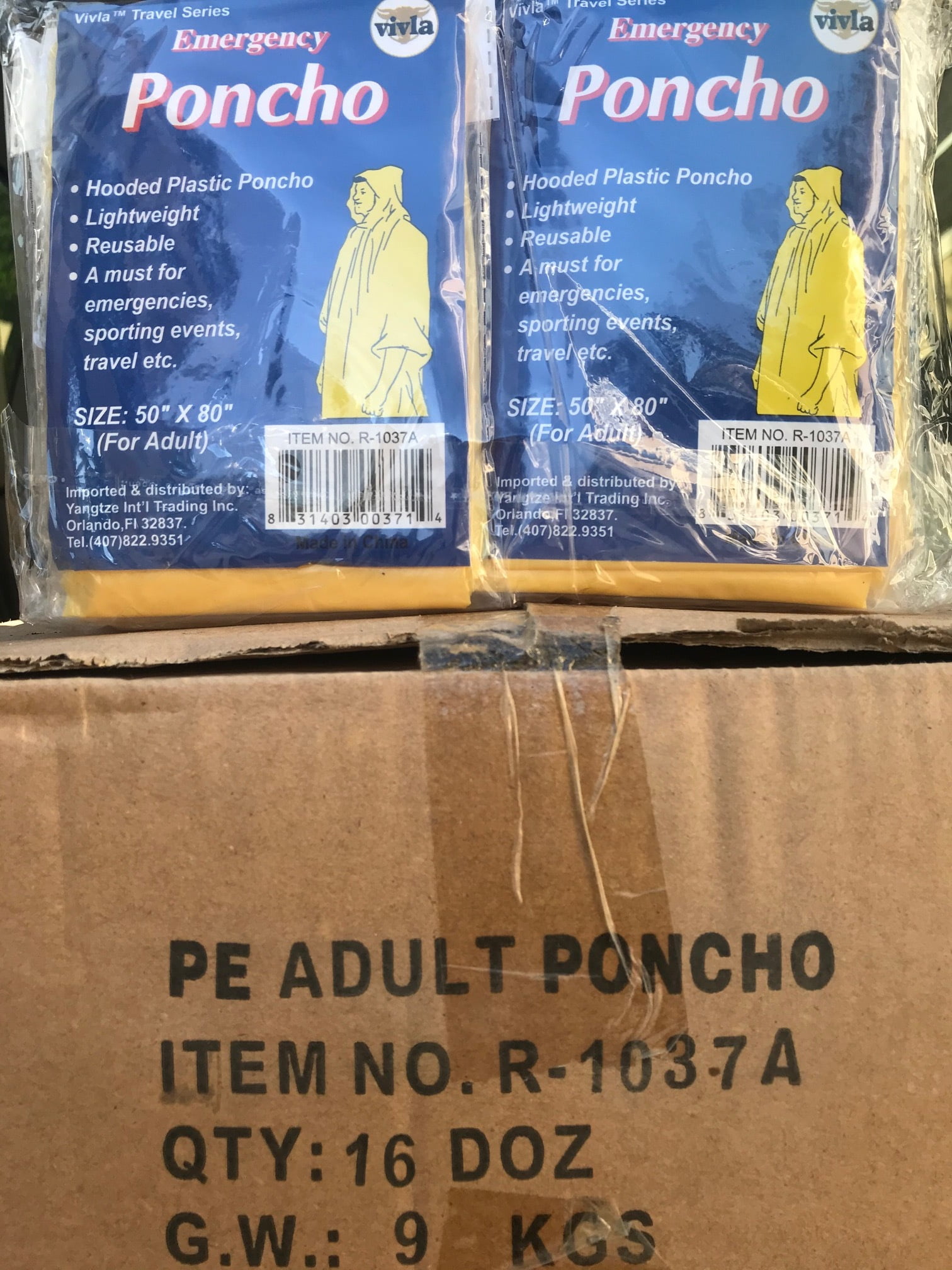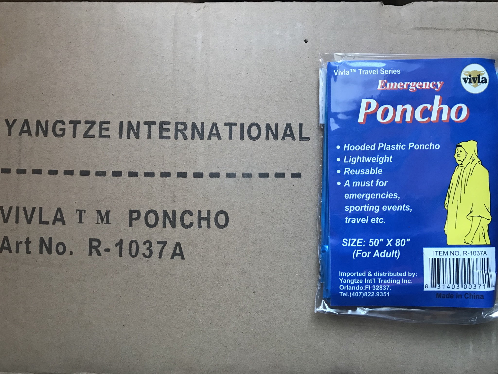 192 PCS POCKET-SIZE EMERGENCY ADULT RAIN PONCHO, SIZE 50″X80″, ONE SIZE FITS ALL. Color : clear, blue, yellow. Packing: individual bag, 12 pcs per dz plastic bag (4 pcs each color); 16 dzs per carton.