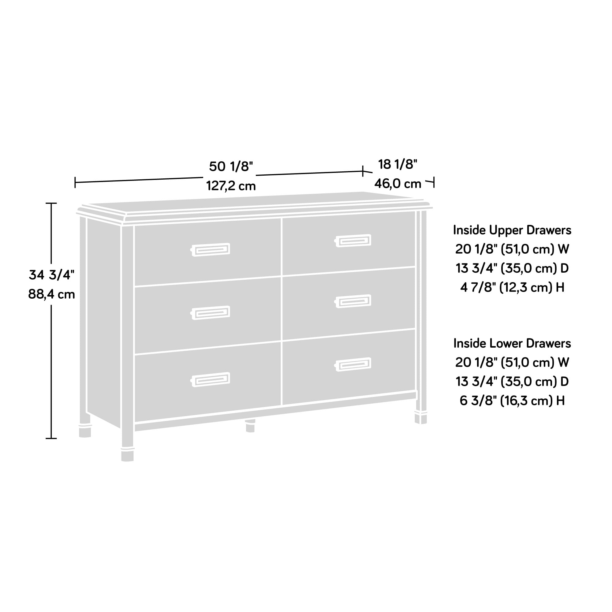 MULTI-ROOM STORAGE – This functional dresser can meet your storage needs in a variety of rooms – bedroom, living room, kitchen, or entryway SPACIOUS DRAWERS – Six spacious drawers feature metal runners and safety stops STYLISH DESIGN – Decorative metal leg caps add a touch of vintage style DIMENSIONS – 50-1/8”W x 18-1/8”D x 34-3/4”H SAFETY FIRST – Tip-over prevention system includes a tip restraint safety strap and interlocking mechanism which allows only one drawer open at a time on each side. This dresser complies with ASTM F2057-23 Standard Safety Specifications for Clothing Storage Units as required by the STURDY Act CLEAR INSTRUCTIONS – With illustrated instructions and labeled parts, you’ll set it up quickly and easily TRUSTED SERVICE – For questions about product or assembly, we are here to help Model #: 436779 For additional questions or any issues, please contact the manufacturer at 1-800-523-3987. Be sure to check out the 1934 Collection, by Sauder collection for more great items!