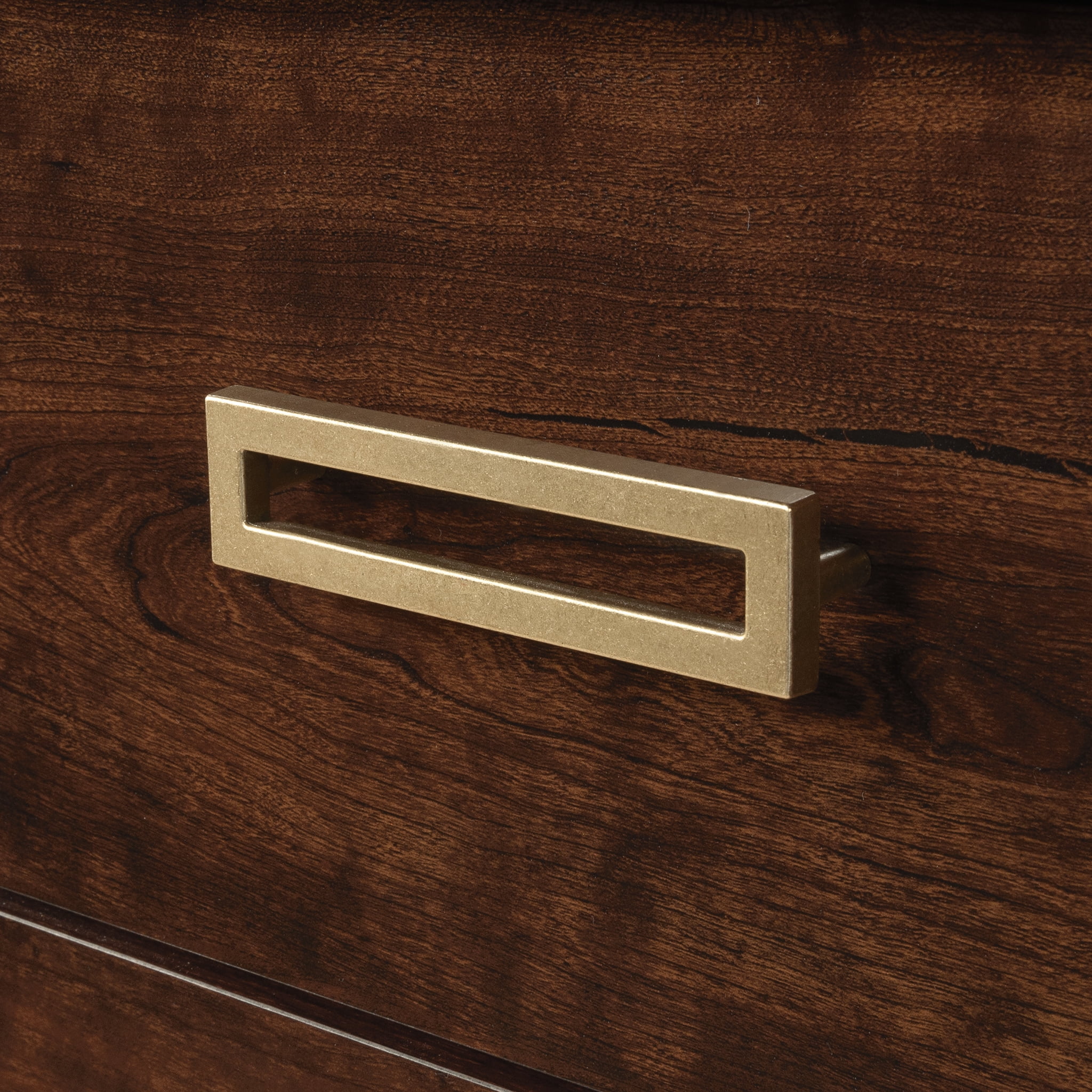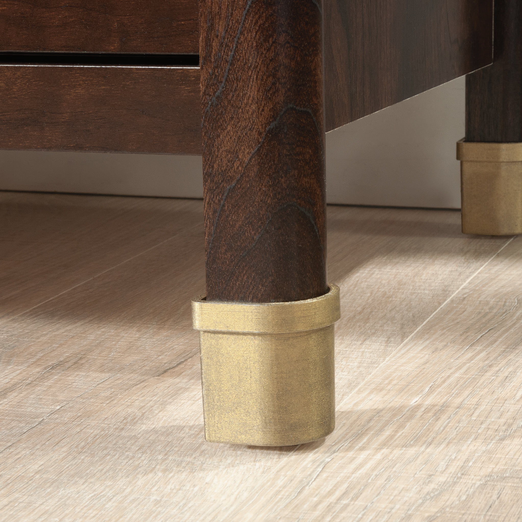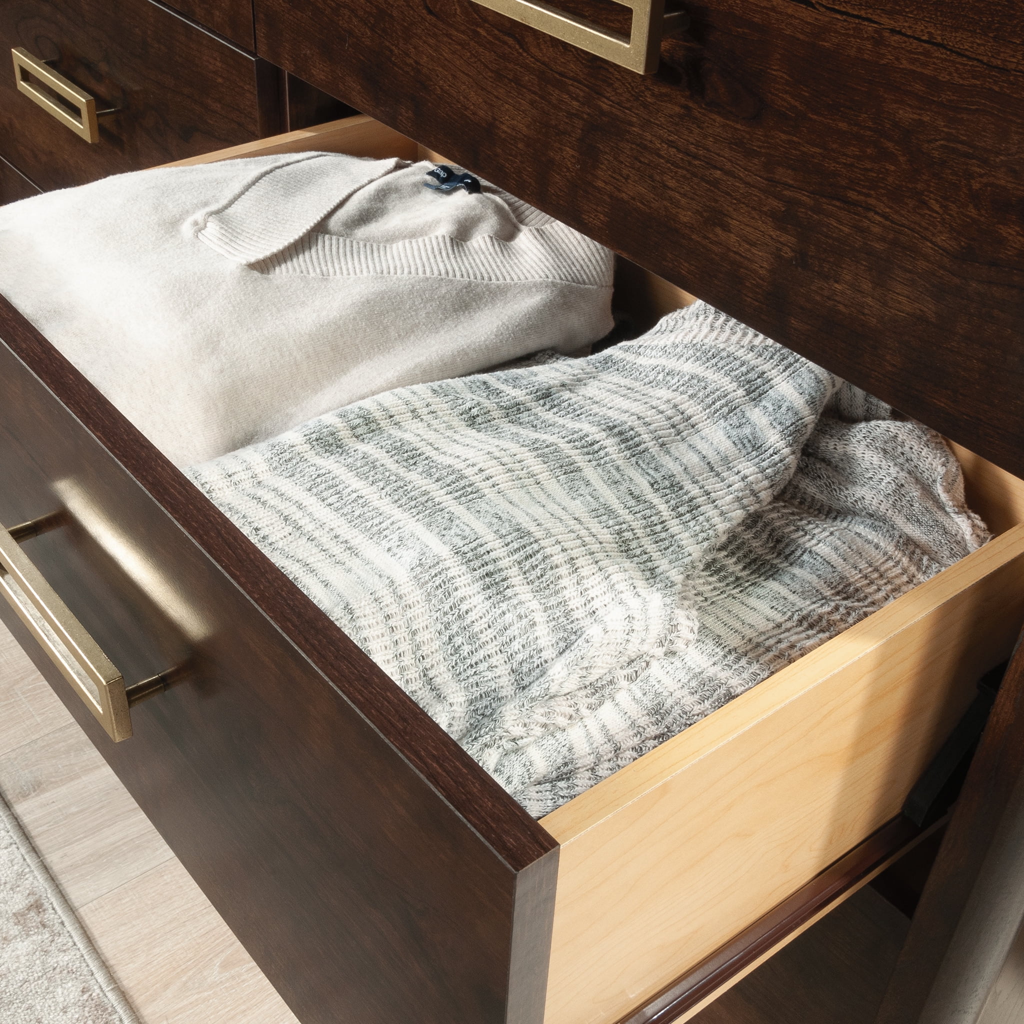 The 1934 collection by Sauder depicts the beauty and grace of a bygone era as it commemorates the founding year of the Sauder furniture company. This modern bedroom dresser radiates classic style with enduring art deco-inspired elegance. The double dresser boasts six spacious drawers for ample storage space with the convenience and benefit of metal runners and safety stops. The four lower drawers are extra deep, making them perfect for storing bulkier items. An interlocking safety mechanism on this 6-drawer dresser ensures that only one drawer can be open at a time on each side, providing an added level of safety. This dresser with drawers includes a tip restraint safety strap for added security. Quick and easy assembly is enhanced thanks to the slide-on molding and T-lock drawer system. The retro metal leg caps coordinate with the bold, geometric hardware, integrating vintage glamour with the dark, Deco Cherry finish. Add a touch of early 20th-century elegance to any bedroom with a contemporary dresser from the 1934 collection by Sauder.