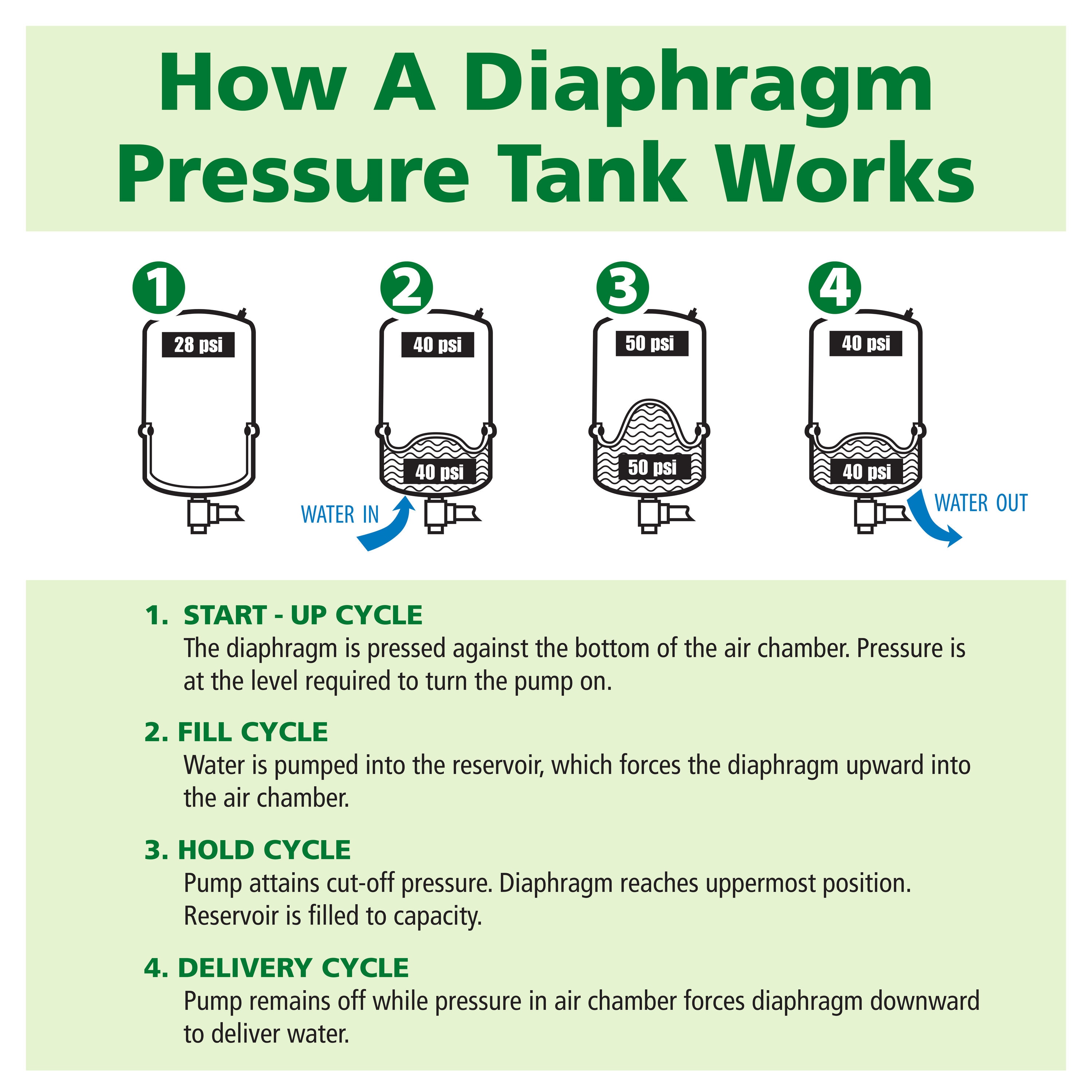 The A. O. Smith line of Pump and Pressure tanks feature an assortment of size ranges to fit the specific needs of your home. A Pump tank is an essential part of any well system, delivering the benefits of ensuring your pump will run for at least one minute each time it cycles, as required by pump manufacturers. Our Pump tanks store a supplemental water supply between pump cycles, to reduce the number of cycles throughout the day, and help prolong the pump lifeline of your water systems. A pump tank also maintains the water pressure within your system, ensuring proper operation of your dishwasher and washing machine, and robust flow for showering and bathing. A properly sized pump and well tank will work as a team to meet your needs and deliver many years of dependable service—all A. O. Smith pump tanks are compatible with our line of A. O. Smith water heaters.