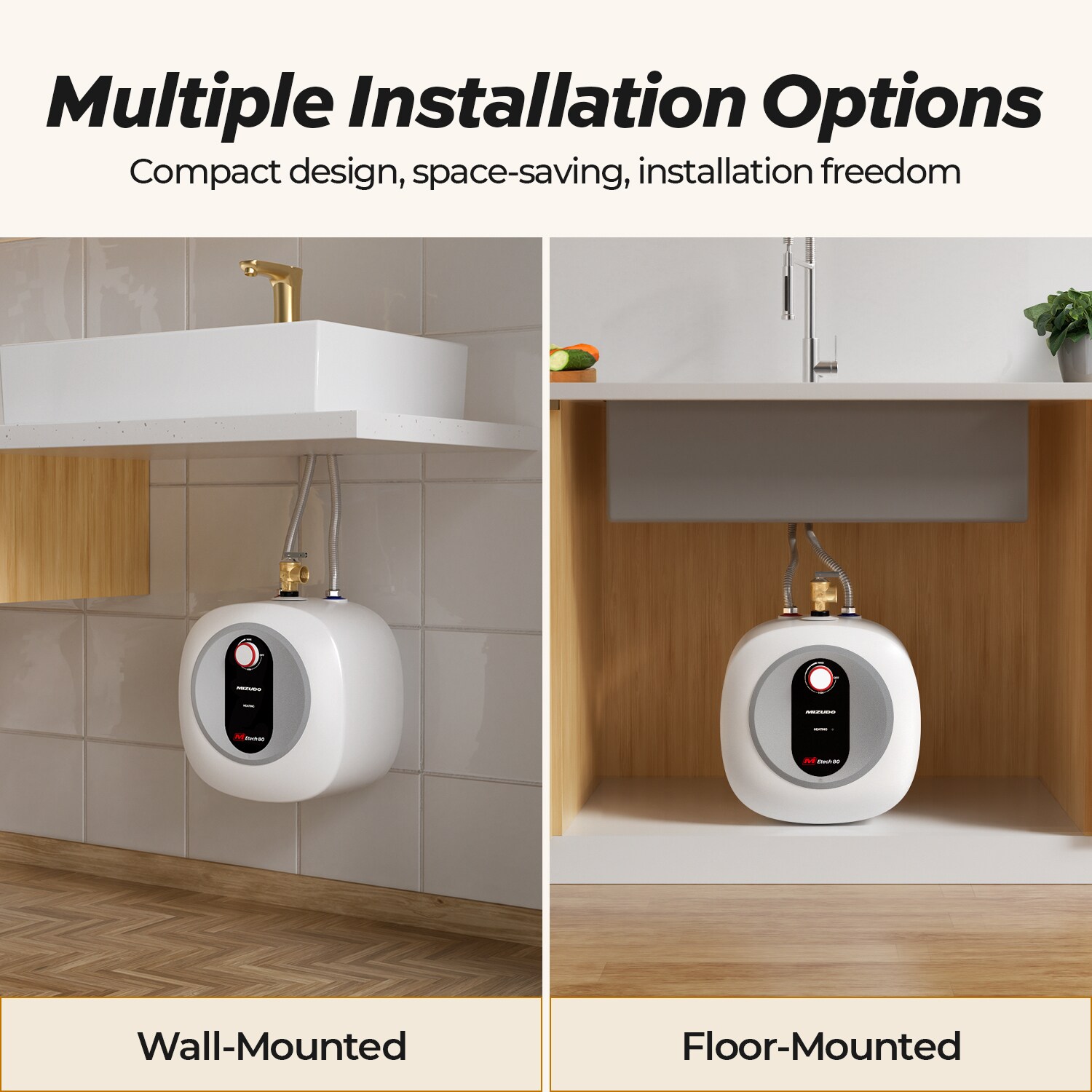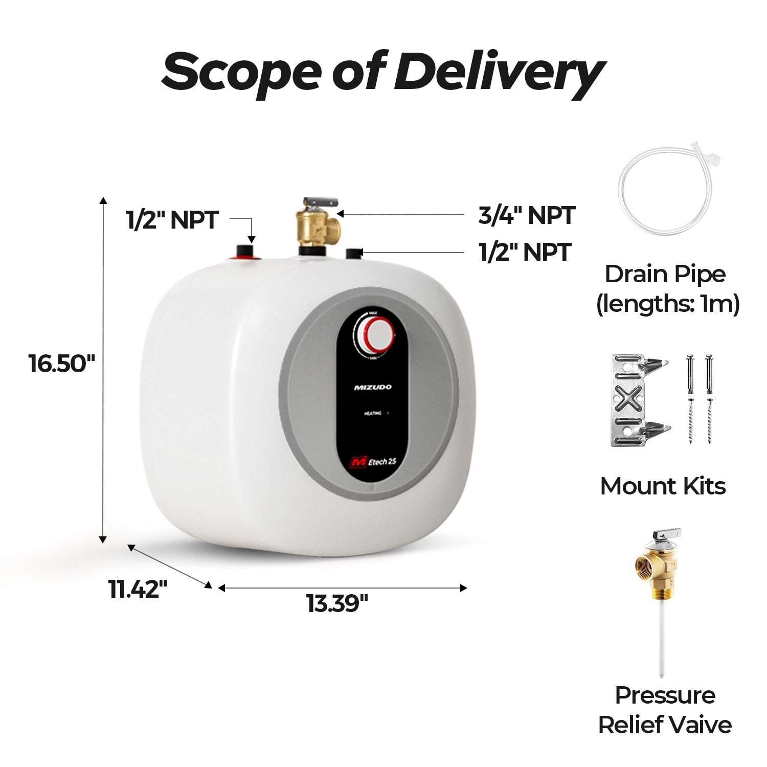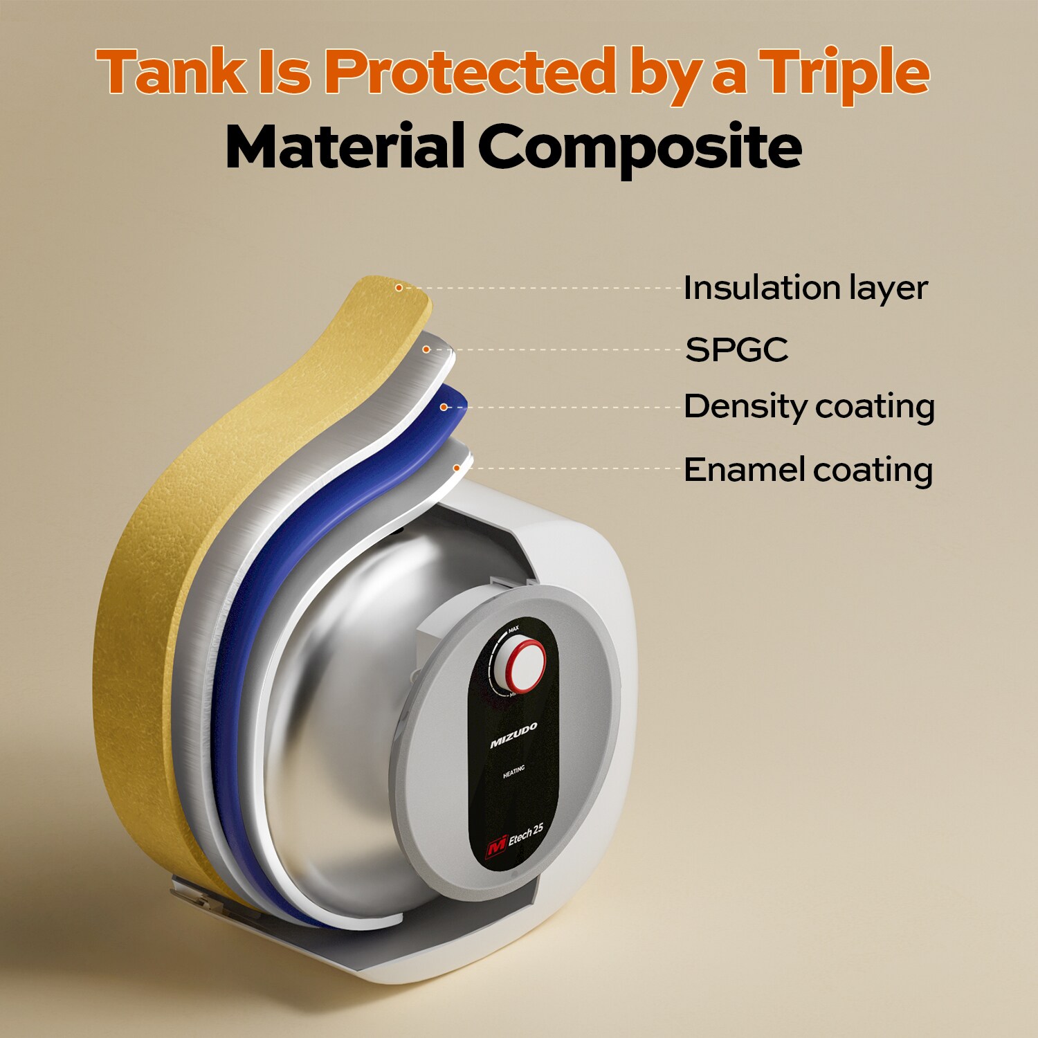 MIZUDO Electric mini-tank water heater is perfect for garages, workshops, RVs, and food trucks. Ideal for cupboards, bathroom cabinets and washing machine cabinets. Coated with enamel make it durable and long-lasting. When it reaches 167 F, the high temperature limiting device will shut off the heat and provide protection.
