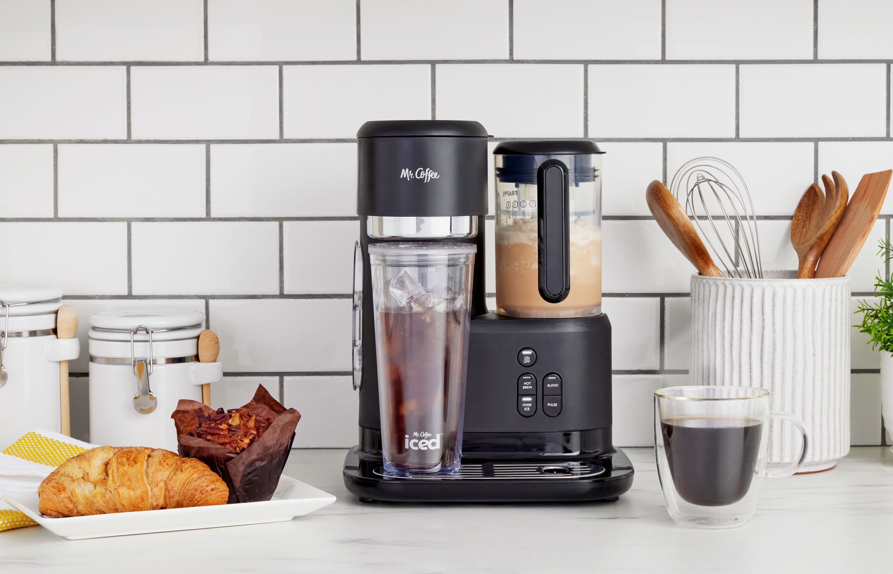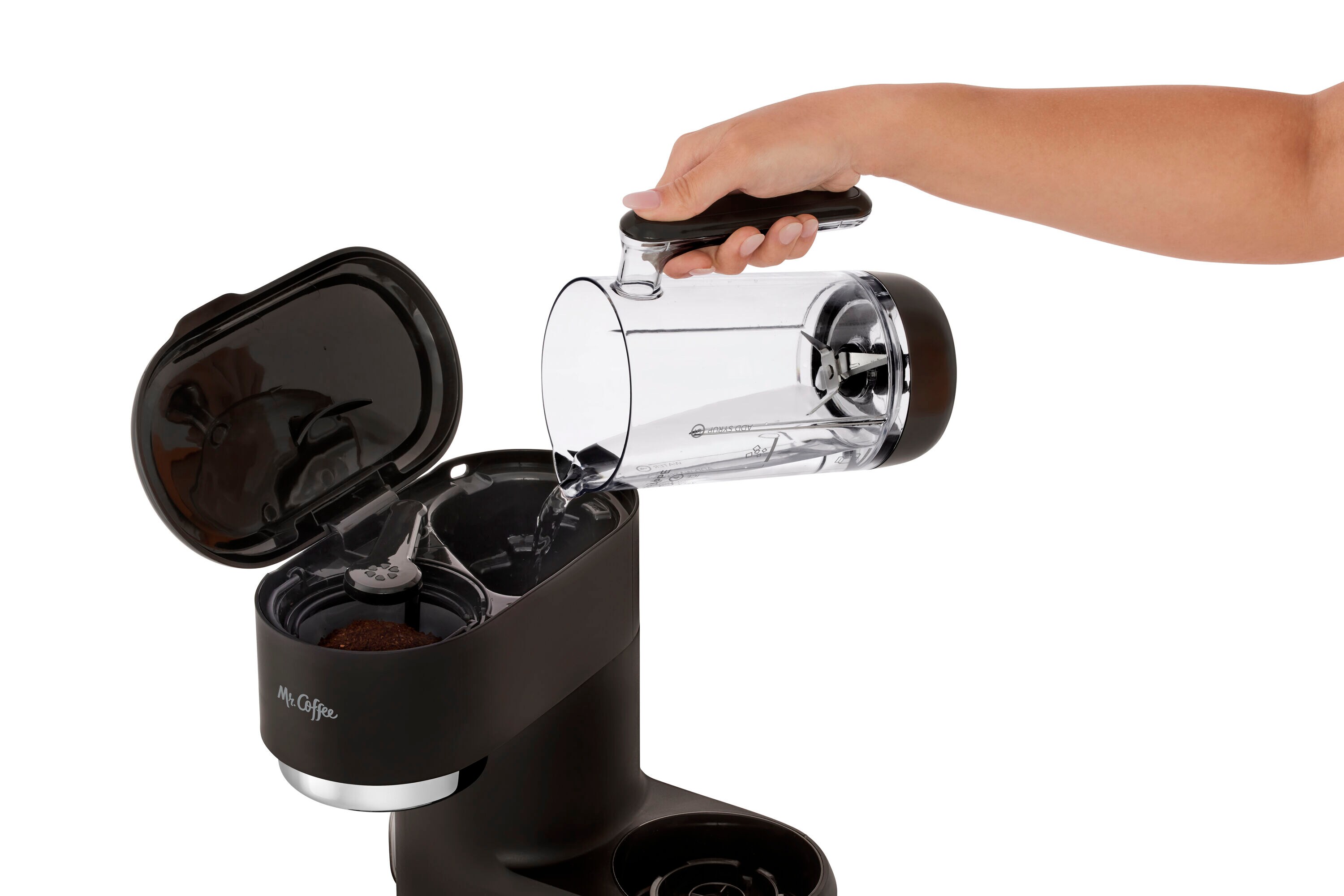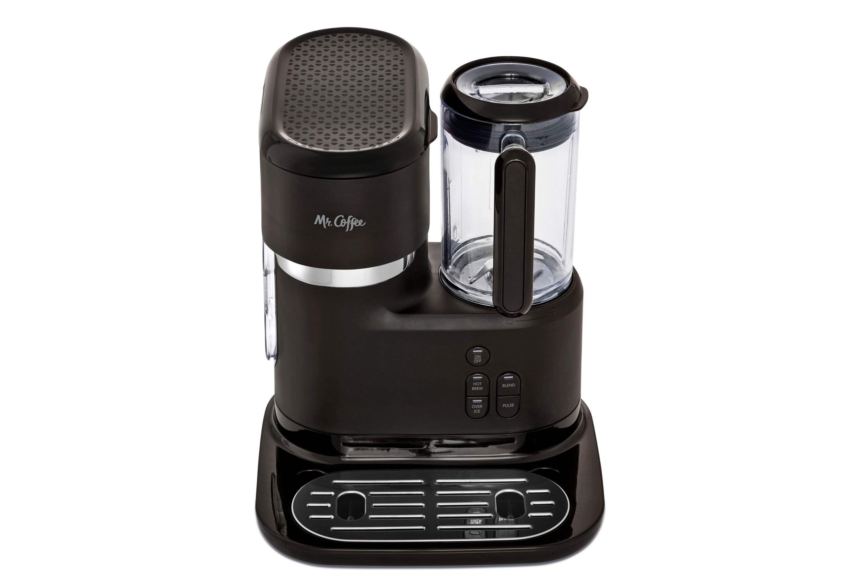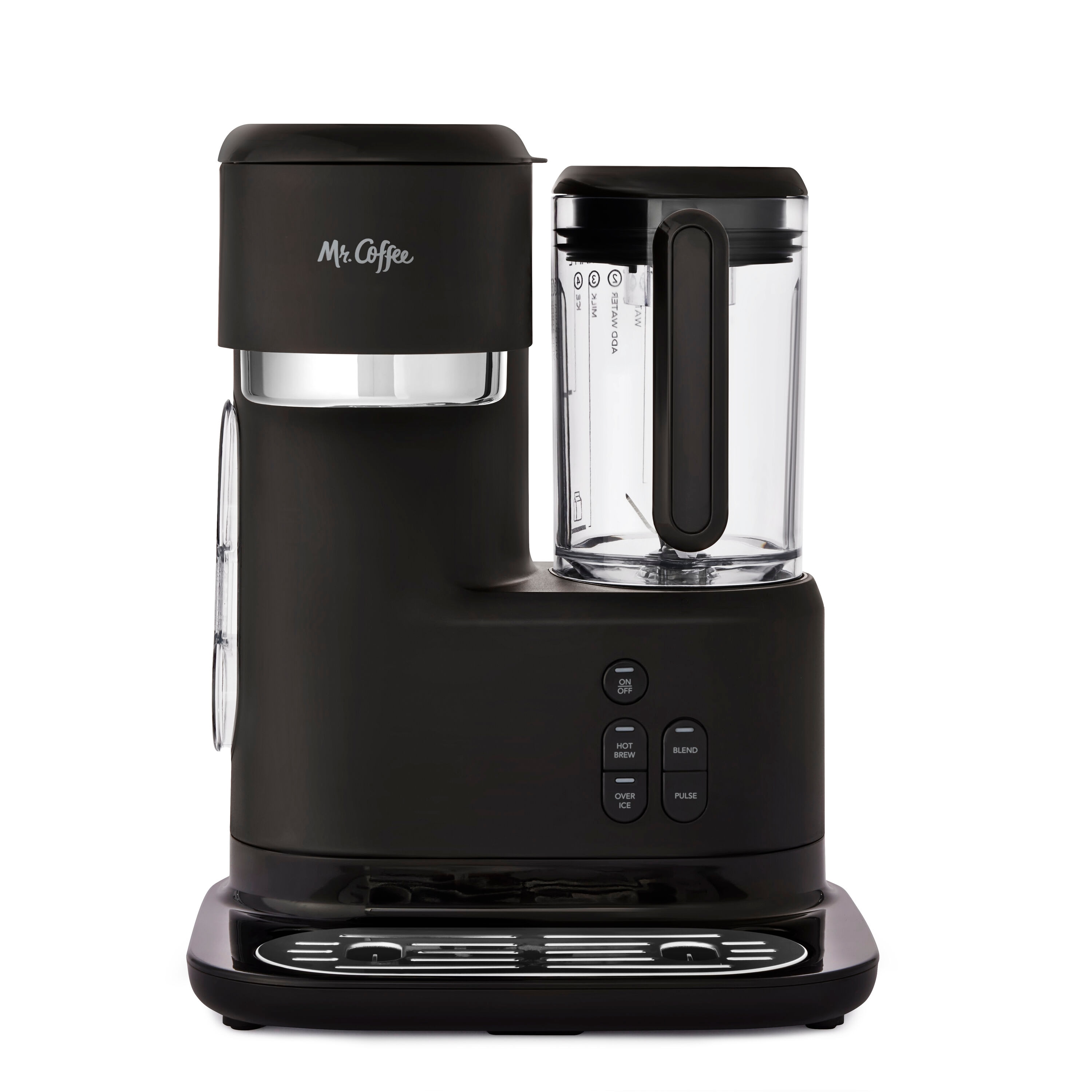 Skip the coffee shop and brew your favorite drinks at home! With its 3-in-1 functionality—frozen, iced, and hot coffee—the Mr. Coffee Single-Serve Frappe, Iced, and Hot Coffee Maker and Blender makes it easy. With the built-in blender and automatic blending cycle, frappes turn out perfectly frosty every time. For consistently great tasting drinks—frozen, iced, or hot—the magic is in the measurements! The easy-to-use measuring system and dual-sided scoop make brewing simple. They give you the perfect ratio of water + coffee + ice, for frappes and coffee drinks that are always bold and flavorful. When that coffee craving hits, there’s no need to wait. The machine brews in under 4 minutes. Brew 6, 8, 12, or 16 oz. of bold, hot coffee and 22 oz. of refreshing iced coffee, with the single-serve reusable filter. Get all the taste, and avoid the waste. Enjoy your iced coffee and frappe at home, or take them on the go with the reusable tumbler. Also includes recipe book with inspiration for creating frappes, iced coffees, and more.