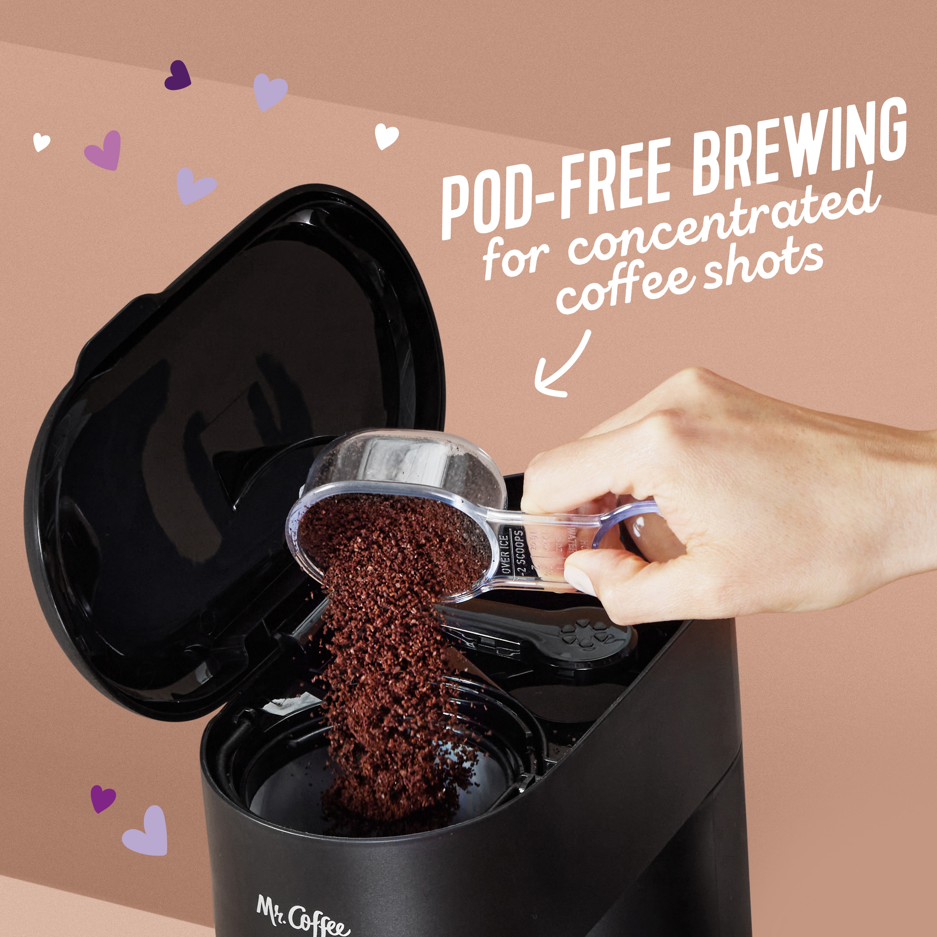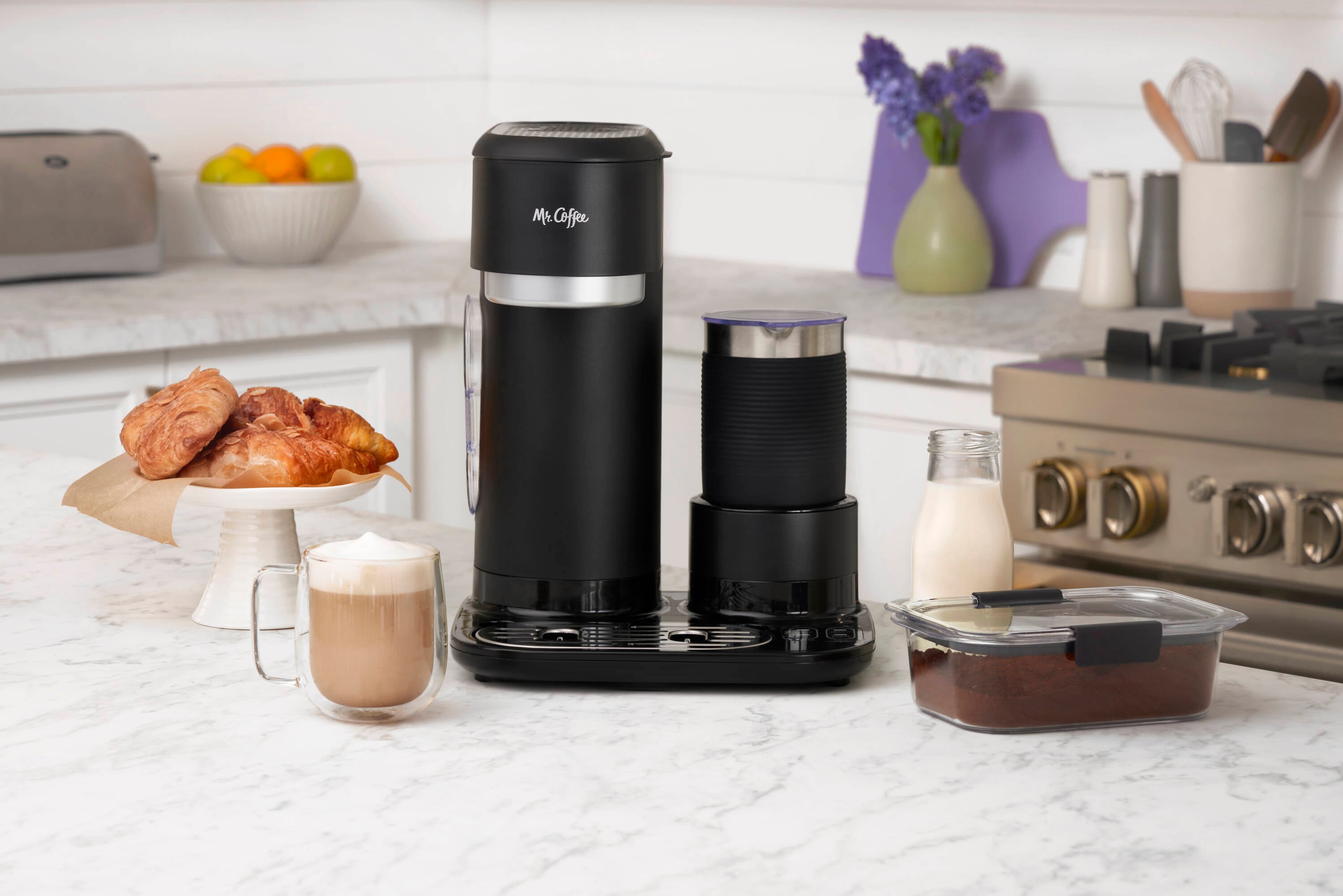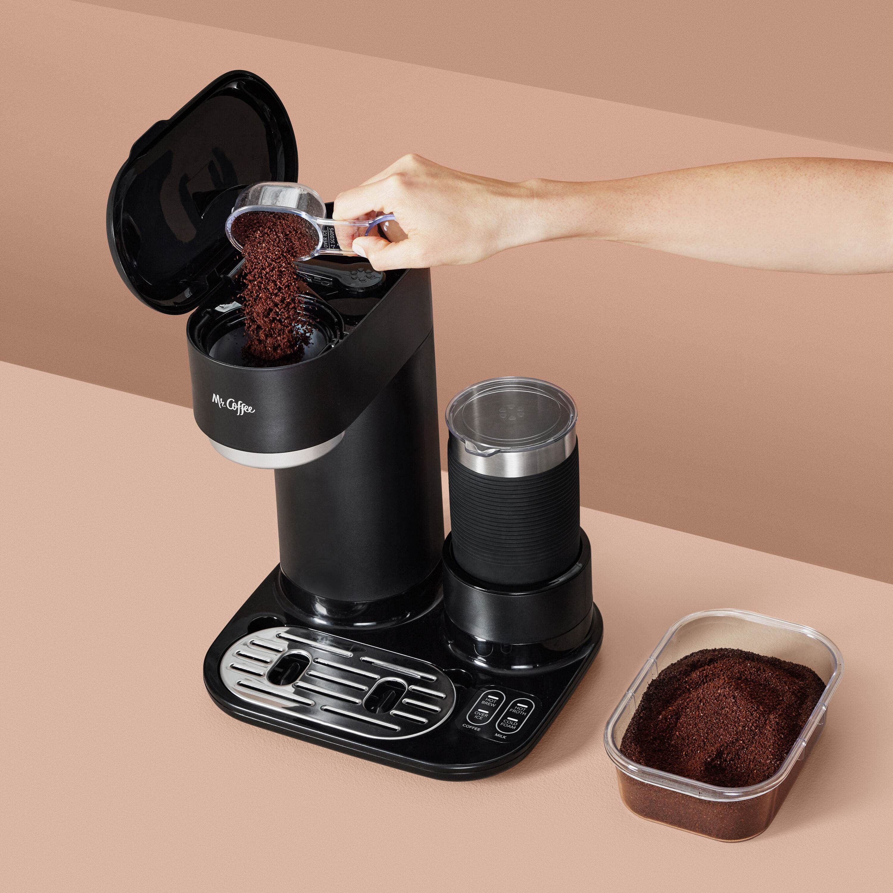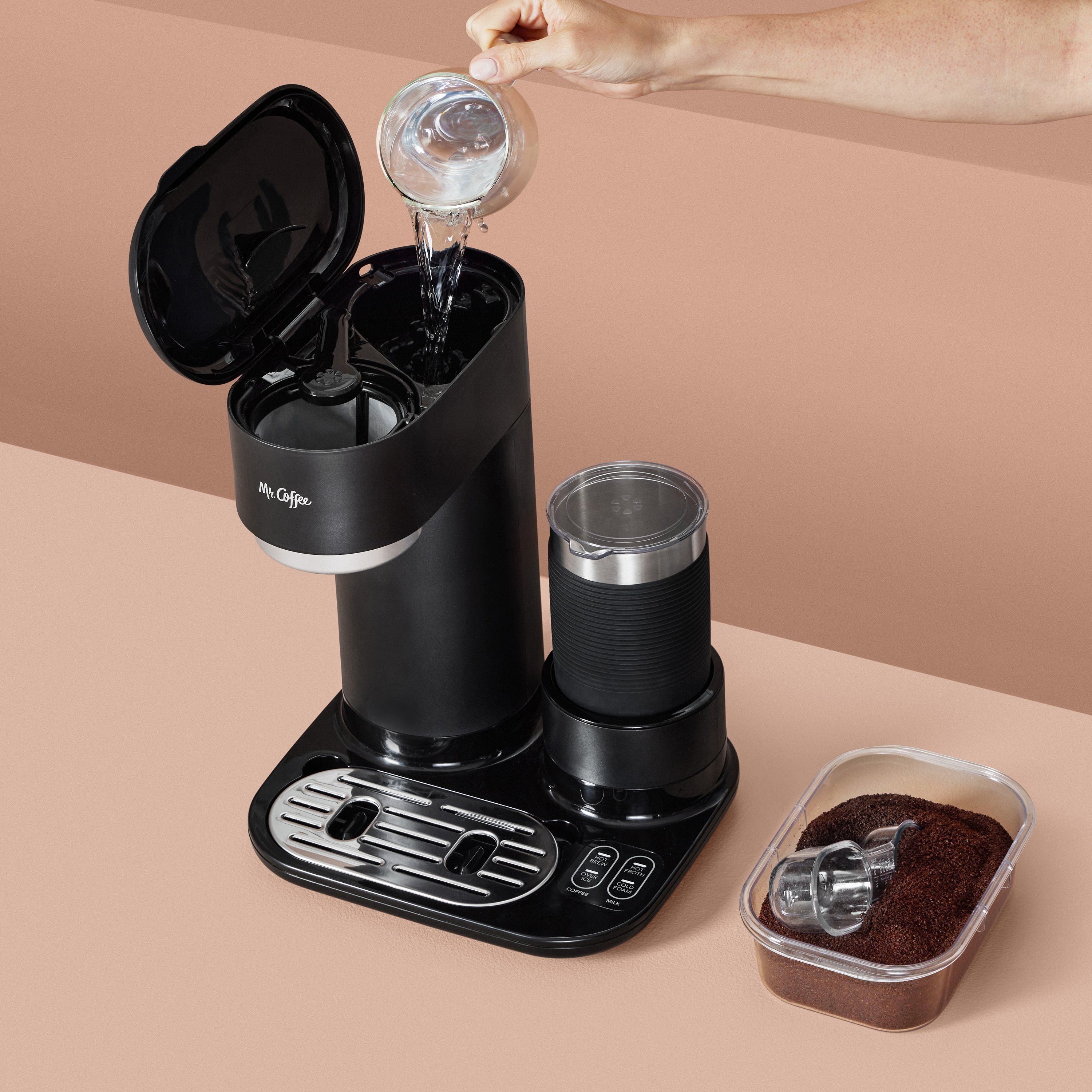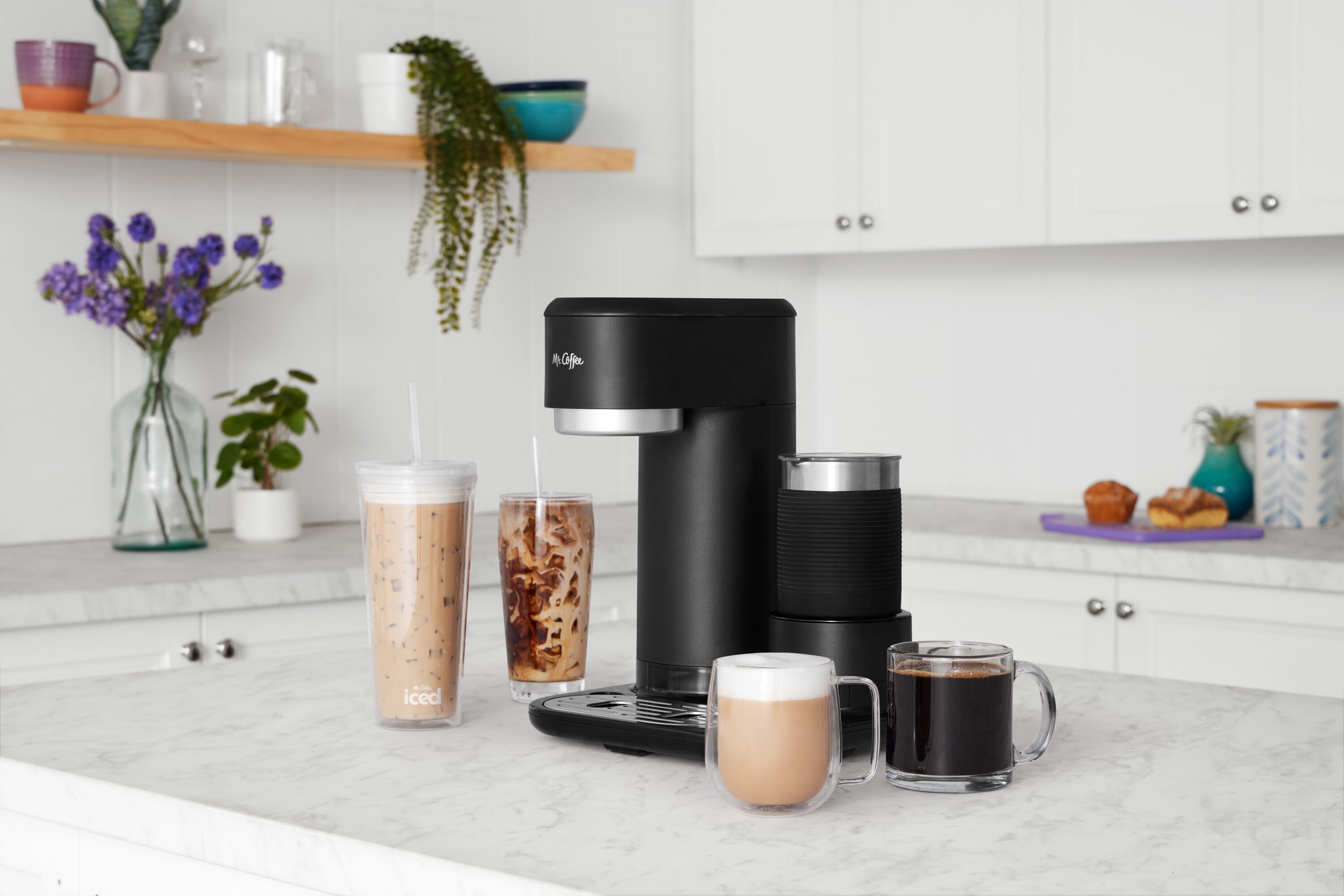 Skip the coffee shop and brew your favorite coffeehouse drinks at home! With its convenient 4-in-1 functionality—latte, cappuccino, iced, and hot coffee—the Mr. Coffee® Single-Serve Latte™, Iced, and Hot Coffee Maker, with milk frother, makes it easy. With its built-in frother and preset hot and cold froth buttons, your lattes and cappuccinos turn out perfectly every time. The easy-to-use pod-free measuring system includes a dual-sided scoop for consistently flavorful coffee that’s never watered down, and ensures ideal coffee-to-milk ratios for creating perfect froth for lattes and cappuccinos. Also includes a recipe book and 22-oz. reusable tumbler for taking drinks on the go. Brew a concentrated shot of coffee for lattes and cappuccinos, as well as 8, 12, or 16 oz. of bold, hot coffee and a single serve of iced coffee. The single-serve reusable filter delivers all the taste without the waste. Enjoy your favorite coffeehouse drinks at home with your Mr. Coffee Latte Coffee Maker.