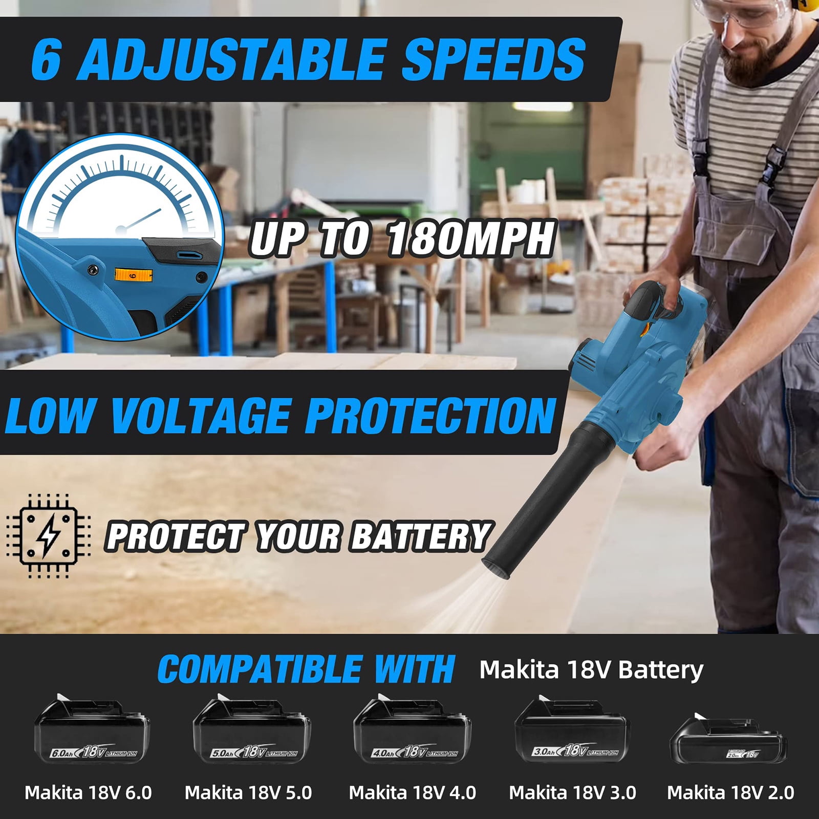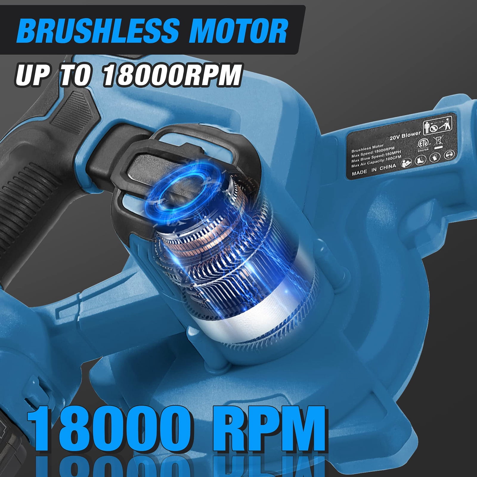 【2-in-1 Blower & Vacuum】 2 in 1 design makes electric leaf blower & vacuum can be switched at will, just enjoy the flexibility and versatility of this cordless leaf blower. It’s not only a leaf sweeper, but also a multifunctional dust & pet hair cleaner, car blower, inflator for camping,boating or floating, also awesome for getting all the air out. 【High Preformance Brushless Motor】Our leaf blower equipped with high-efficiency brushless motor up to 18000RPM which has higher performance and longer motor life. Has been optimized with a stronger plus brushless motor and AAA quality batteries for longer life and quieter compared to other electric leaf blowers. 【6 Adjustable Speeds】Cordless leaf blower can provide you with 6 adjustable speeds, up to 180MPH and down to 70MPH, which can help you easily switch from outdoor to indoor work for all scenarios. 3 adjustable tubes can help different statural people with a comfortable experience, and the extended tubes can easily help you deal with difficult to clean crevices. 【Low-voltage Protection】 Built-in low-voltage protection and over-current protection, which can well protect your precious batteries from damage. You can use our machines to your heart’s content. When your battery voltage is too low, the machine will automatically power off. 【2Pcs 20V High-Capacity Battery】Battery leaf blower with 2Pcs 20V 4000mah lithium batteries. 1h fast seat charge is double the charging speed of the line charge, more efficient to help you save time. (Note: The battery needs to wait for about 2 minutes after use to cool down before charging, with overheating protection inside to better protect the battery life)