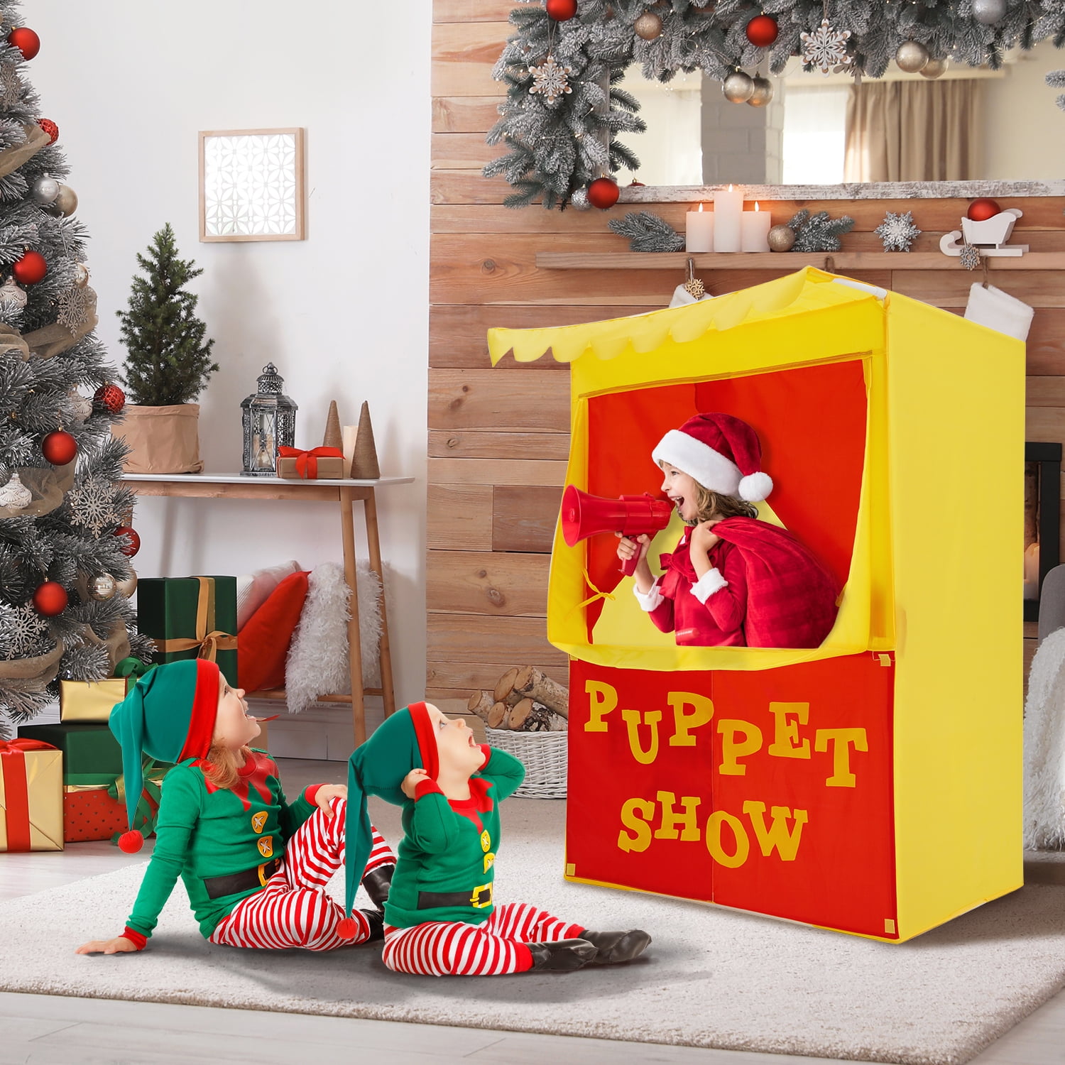 MULTI-FUNCTIONAL ACTIVITY CENTER :Kids canenjoy some dramatic play using hand puppets and this kids theater tent. On theside, it transforms into a t kids lemonade stand ! This play set has somethingfor all boys and girls. DOOR: Back side door for easy acess. Tools for Learning? The best toys are those that encourage interaction. Our puppet show is designed to inspire engagement and connection with your child. Because kids who can imagine the possibilities become grown-ups who can make their dreams a reality! LOADED WITH EXCITING FEATURES. On the front of the colorful playhouse is a padded front stage, made of fabric and foam(just like a real lemonade stand). GREAT RESOURCE FOR HELPING WITH SKILL DEVELOPMENT! This toddler toy encourages imaginative play while assisting in your child?s early development too. It will improve hand-eye coordination, fine motor skills, critical thinking, problem solving, and much more.