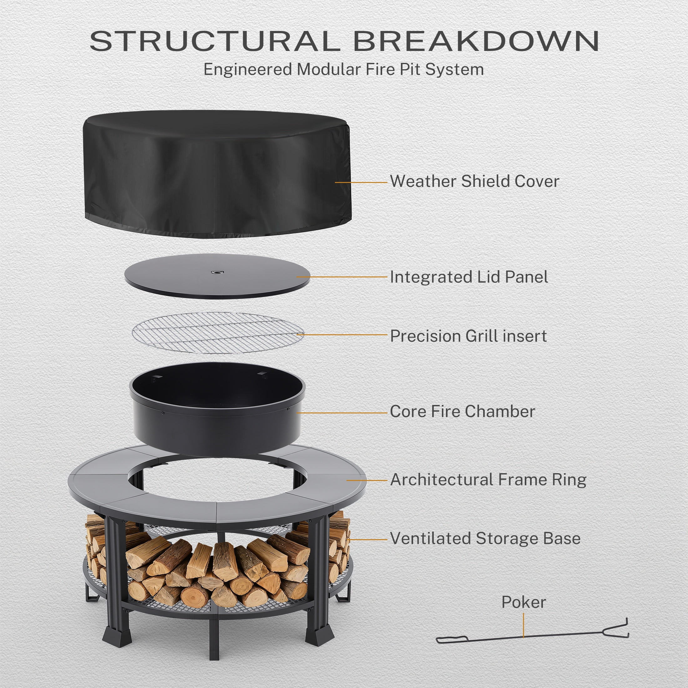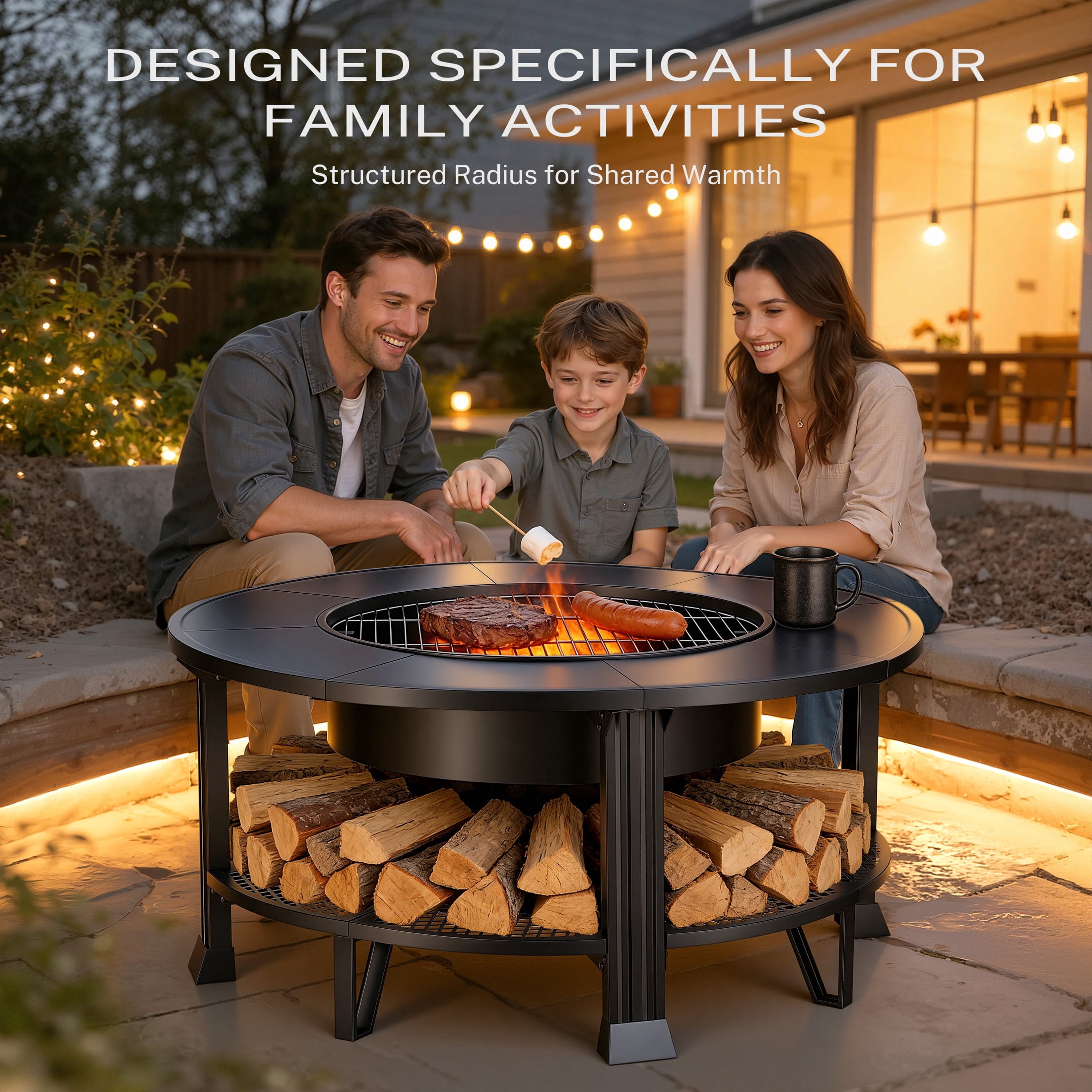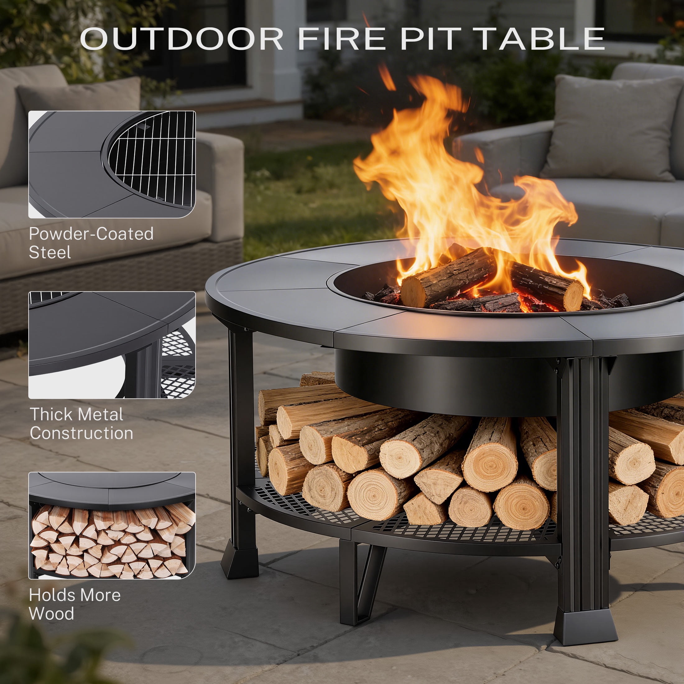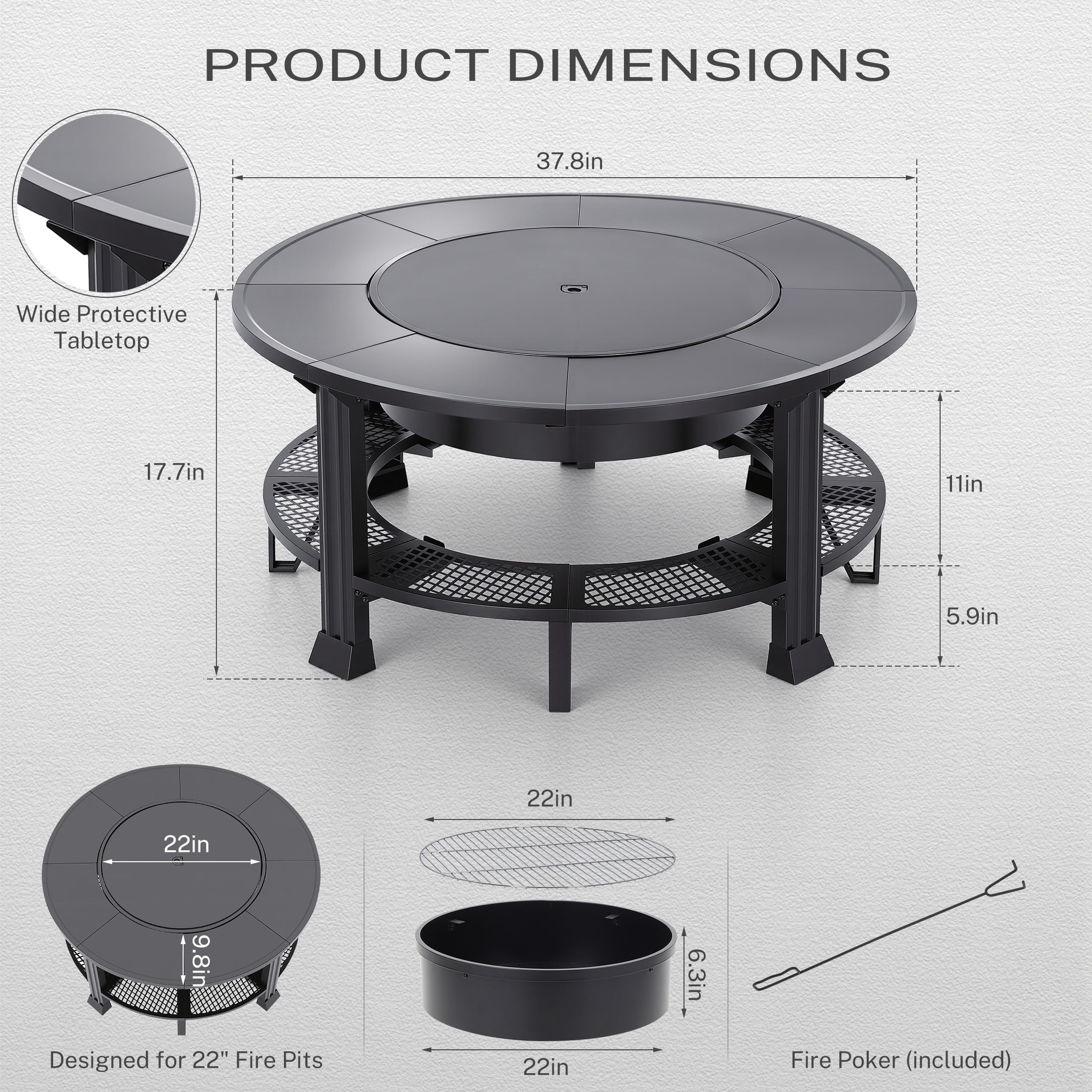 Fire Pits for Outside, 38” Wood Burning Fire Pit Table with Poker, BBQ Net Grill, Cover & Firewood Rack, Round Outdoor Fire Pit for Patio, Backyard & Garden, Round Fire Pit/BBQ Fire Pit, Black