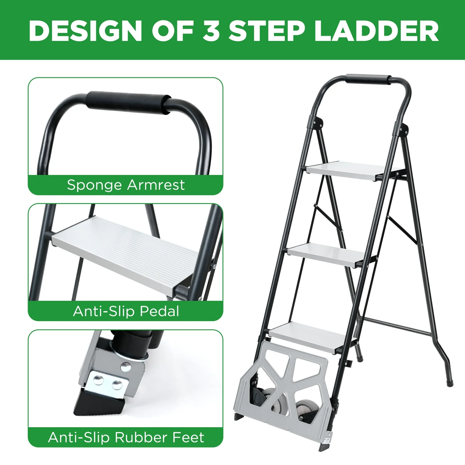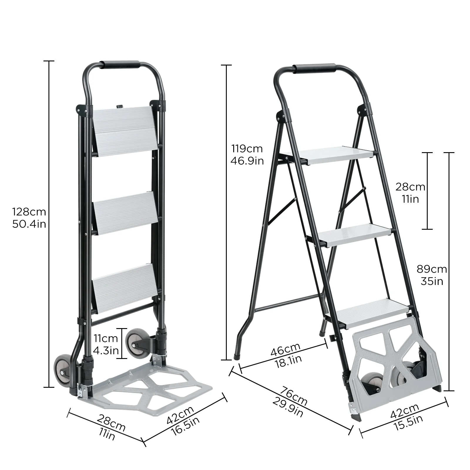 Super Load-bearing Capacity: The adult step stool is made of a sturdy aluminum frame, and the surface is treated with powder coating technology, which is rust proof and durable. The dolly cart can hold up to 220 pounds and the step ladder can hold up to 550 pounds. Duo to the ladder’s sturdy triangular structure and wide pedals, you can stand firmly on the pedals and remain stable. Ladder Designs: The thickened pedals on the step stool have deepened anti-slip lines to increase friction and prevent slipping; The lateral bracing structure strengthens the basic support and can bear more weight; The aluminum 3 step ladder base is equipped with PVC material protective pads to protect the floor from scratches. Hand Truck Designs: You just need to step on the loading platform and the two wheels will open accordingly. The loading plate can accommodate heavy luggage, and the foldable dolly can be moved by tilting it backward. Two large rubber wheels can also help transport goods to the stairs. Easy to Store: The compact ladder weighs only 15.3 pounds for easy lifting and use to help you with overhead tasks. The home ladder folds up and can be stored in tight spaces when not in use,optimizing space management and making it a must-have for the home.