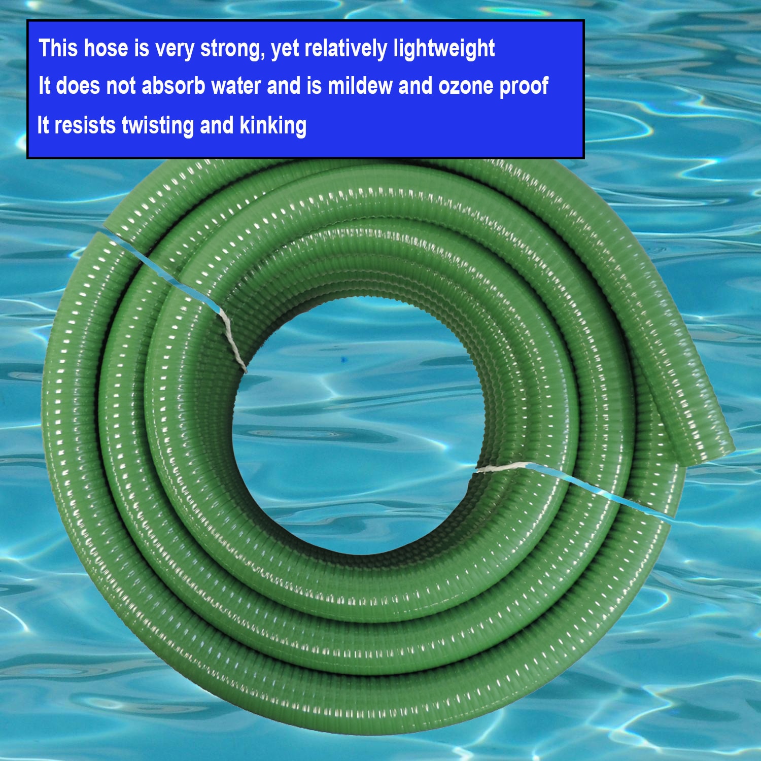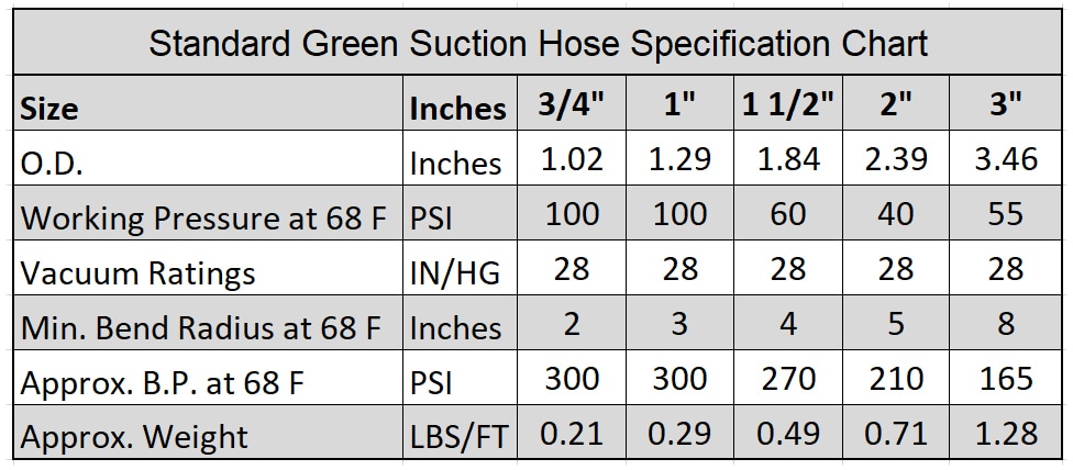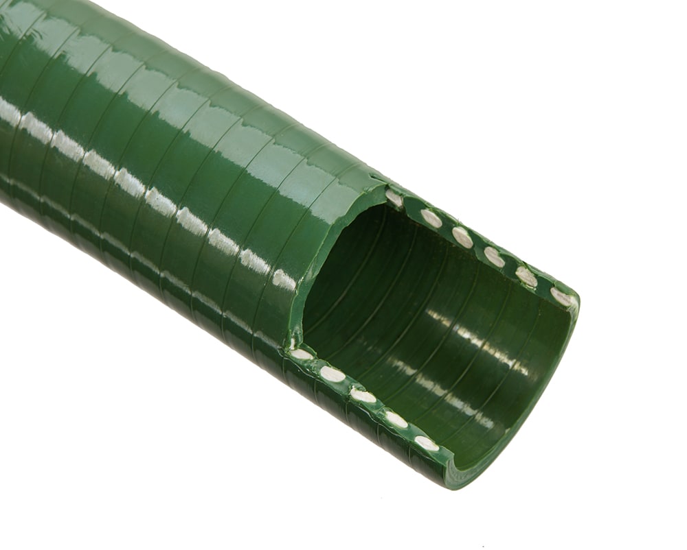 Our standard green suction hose is for use in general operations for the transfer of water, wash down, jetting, watering and irrigation. It is lightweight and flexible with a smooth, no-restricting PVC tube that provides durability and is abrasion resistant. The PVC cover is also weather, ozone and UV resistant. The hose is smooth both on the inside and the outside and works well for large volume transfer operations.. This hose is very strong, yet relatively lightweight; it resists twisting and kinking; it does not absorb water and is mildew and ozone proof. It can be coupled with aluminum, malleable or gator lock shank connectors or quick connects through a variety of methods, including standard hose clamps or crimp on connectors. Use it for suction, discharge or gravity flow of water, salt water and mild diluted acids in construction, agriculture, mining, rock dusting, well point systems, septic systems or equipment rental.