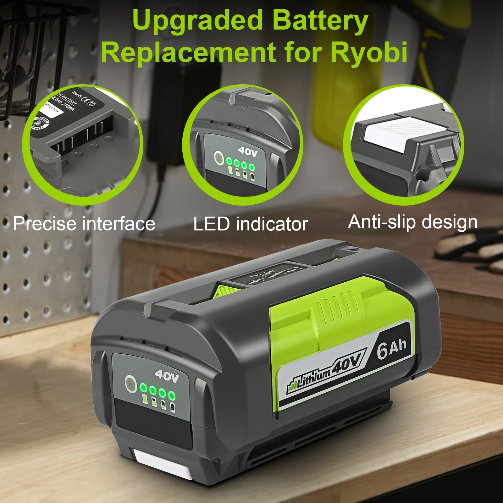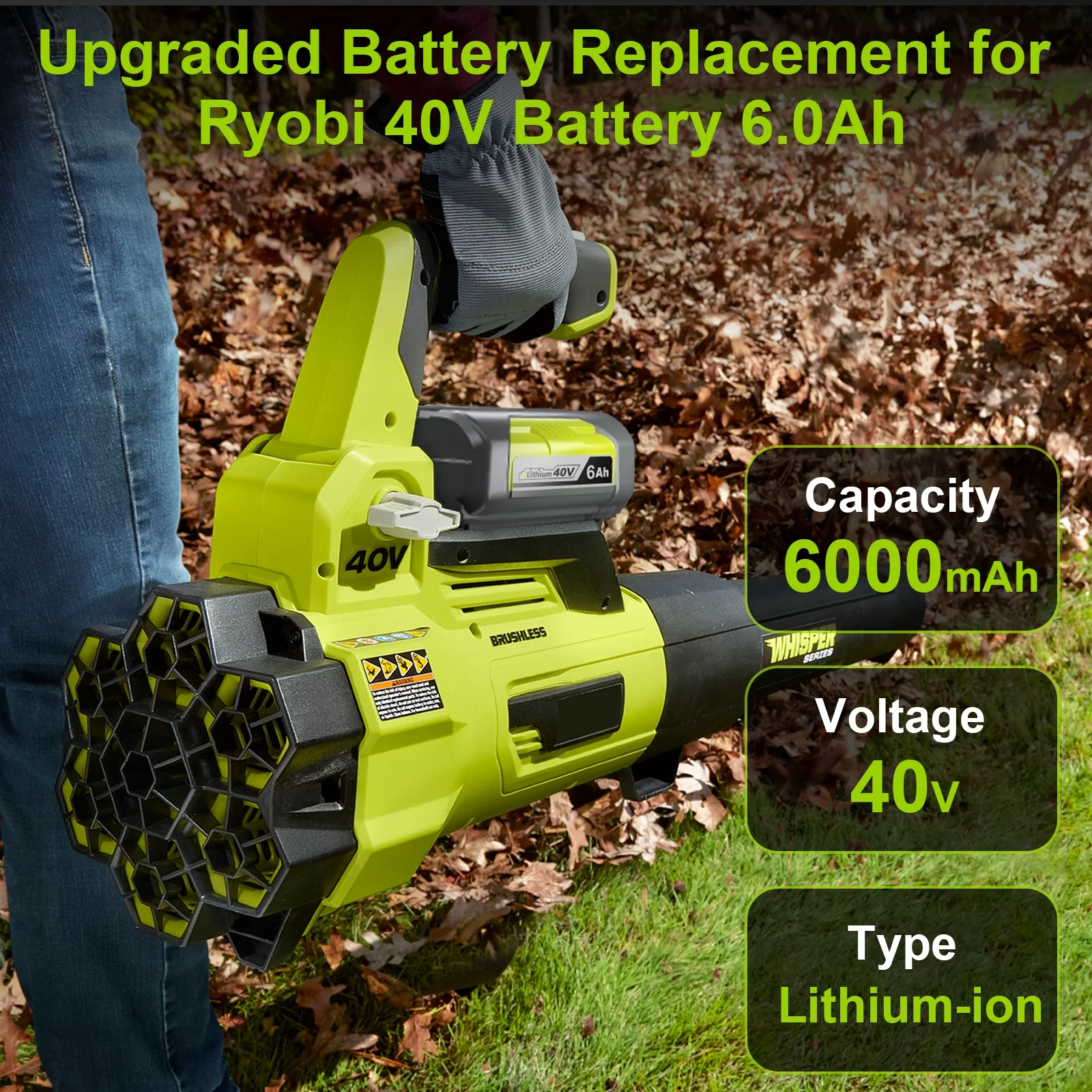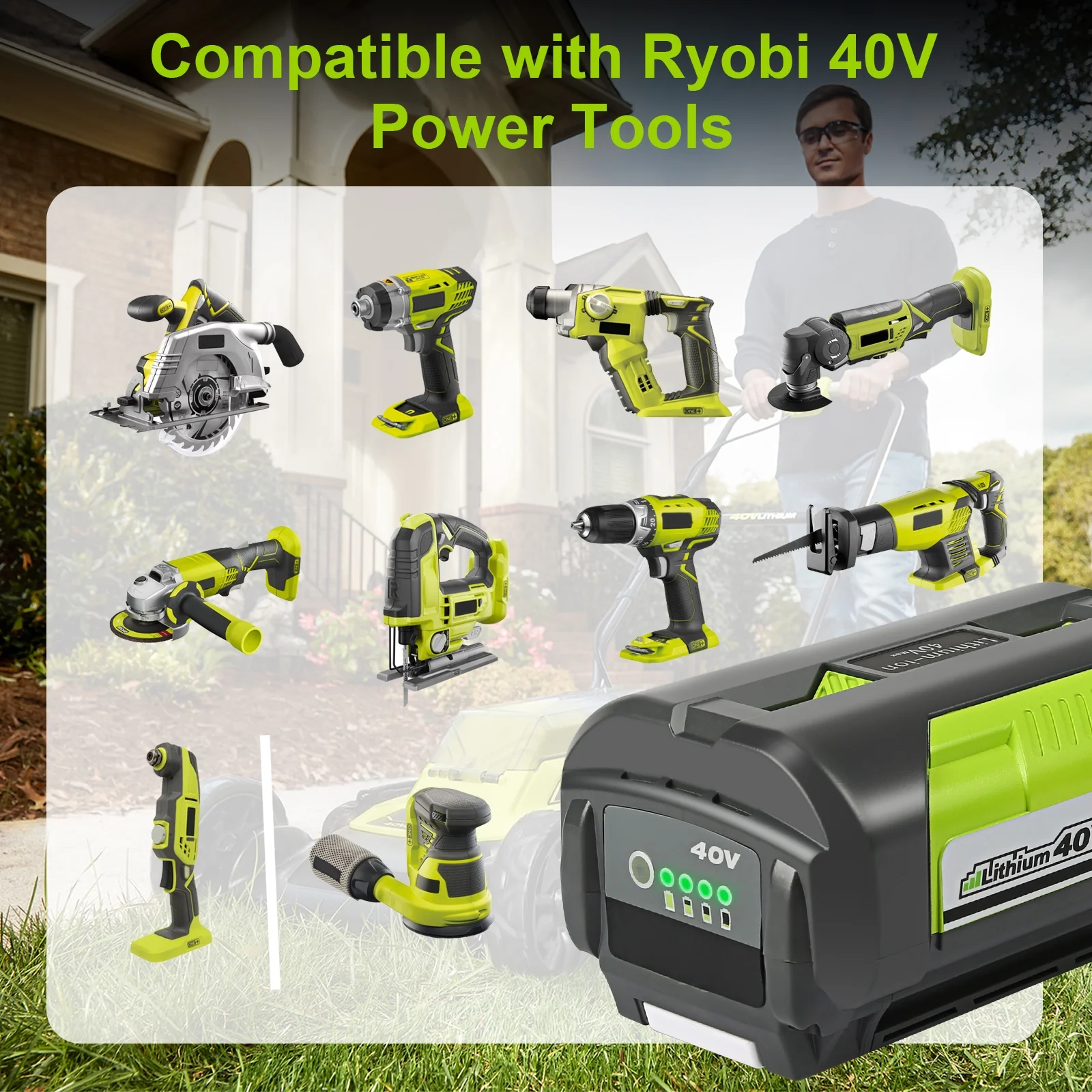 【Upgraded Battery】: Ryobi battery 40v type: Lithium ion ||Capacity: 6000mAh ||Voltage: 40V ||Model: OP4060A ||Removable and rechargeable ||High-power 40 volt ryobi battery can extend the running time. 【LED Indicator Light】: With LED indicator light, the ryobi 40 volt battery can help you track the remaining power of the battery, get rid of frequent charging and annoying waiting caused by the power off of the battery, and make your work more efficient. You will easily know the charging status and ryobi 40v battery op4026 status. 【Extensive Compatibility】: The 40v lithium battery ryobi are suitable for Ryobi 40V lithium battery charger OP403A OP401A OP406A P137A OP404A ZROP401A OP400A RY40440 and ryobi 40v lithium battery 4ah are compatible with all Ryobi 40V lithium ion tools such as ryobi chainsaw 40v,ryobi 40v blower,ryobi leaf blower 40v,ryobi 40v mower. 【Safety Certification】: Ryobi lithium battery 40v has passed CE, FCC, ROHS certification, built-in overcharge, overdischarge, overvoltage, overcurrent, and overheat protection to protect the ryobi op40401 battery and your RYOBI 40 volt series. 【Warranty】: No reason for a free return within 30 days, Product quality defects for free return within 60 days, Warranty within 1 year, any question, please feel free to contact us, 24 hours customer service for your interest protection!!!