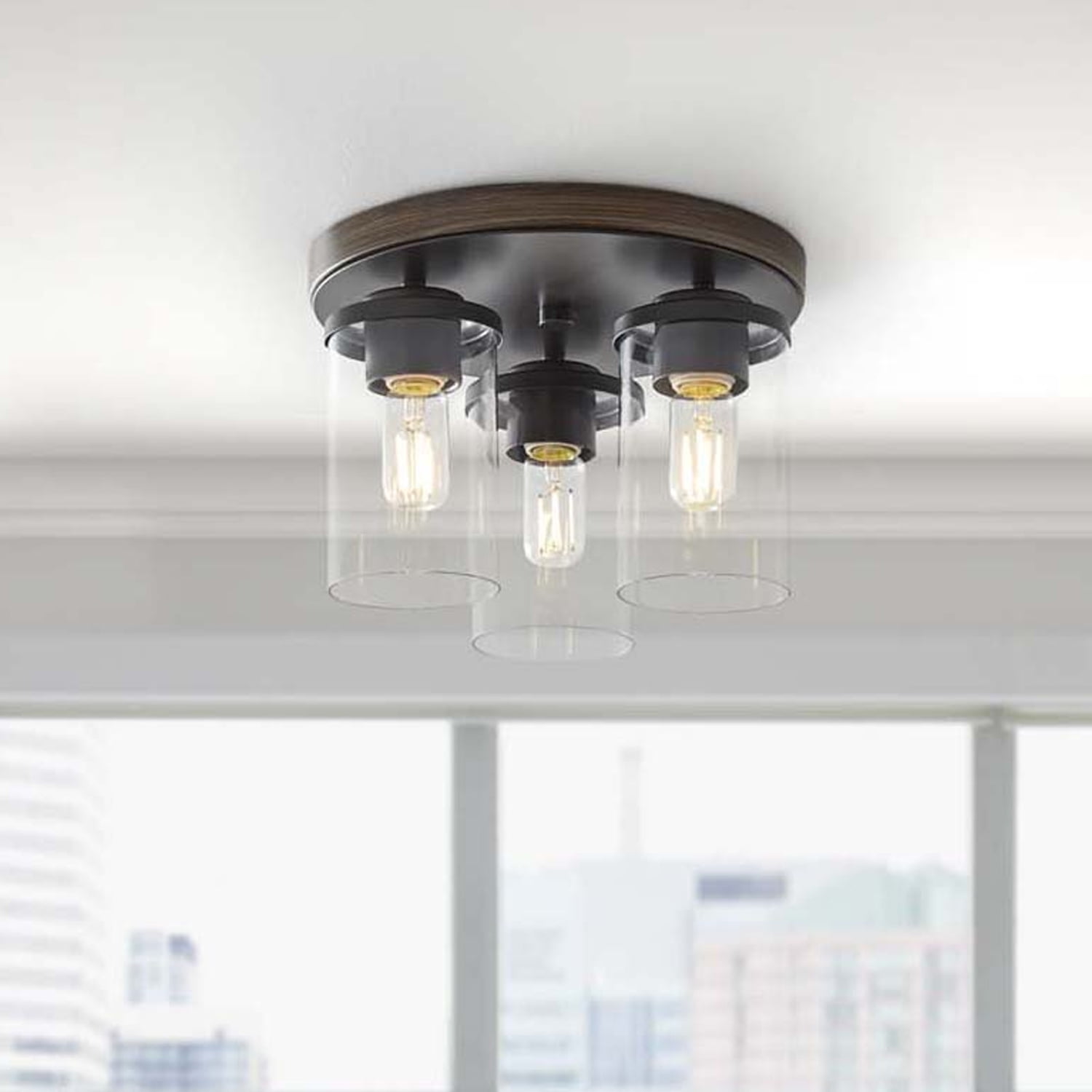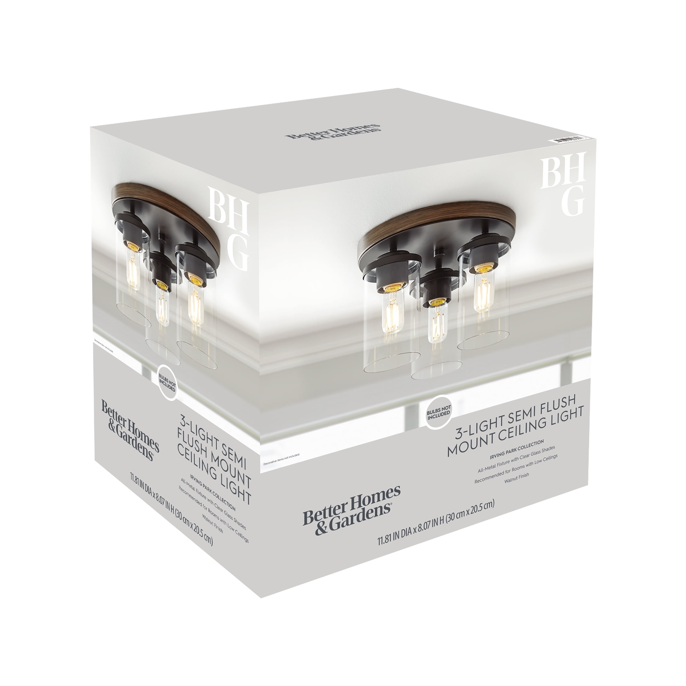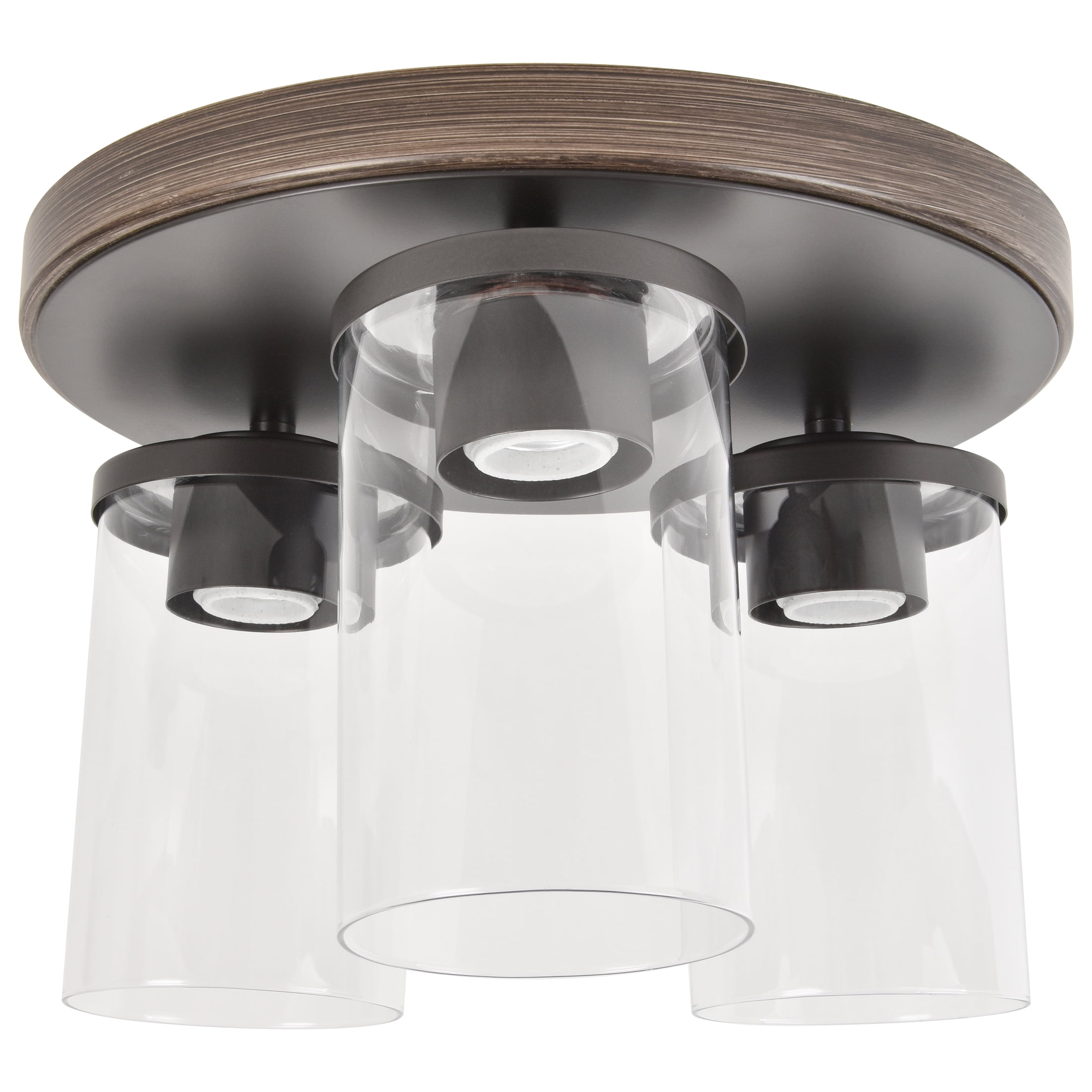 Better Homes & Gardens Flush mount ceiling Light Farmhouse style Walnut finish 120V hardwire Made durable with metal base and 3 clear glass shades (3) T12 LED light bulbs are recommended to complete look (sold separately, not included) Damp rated