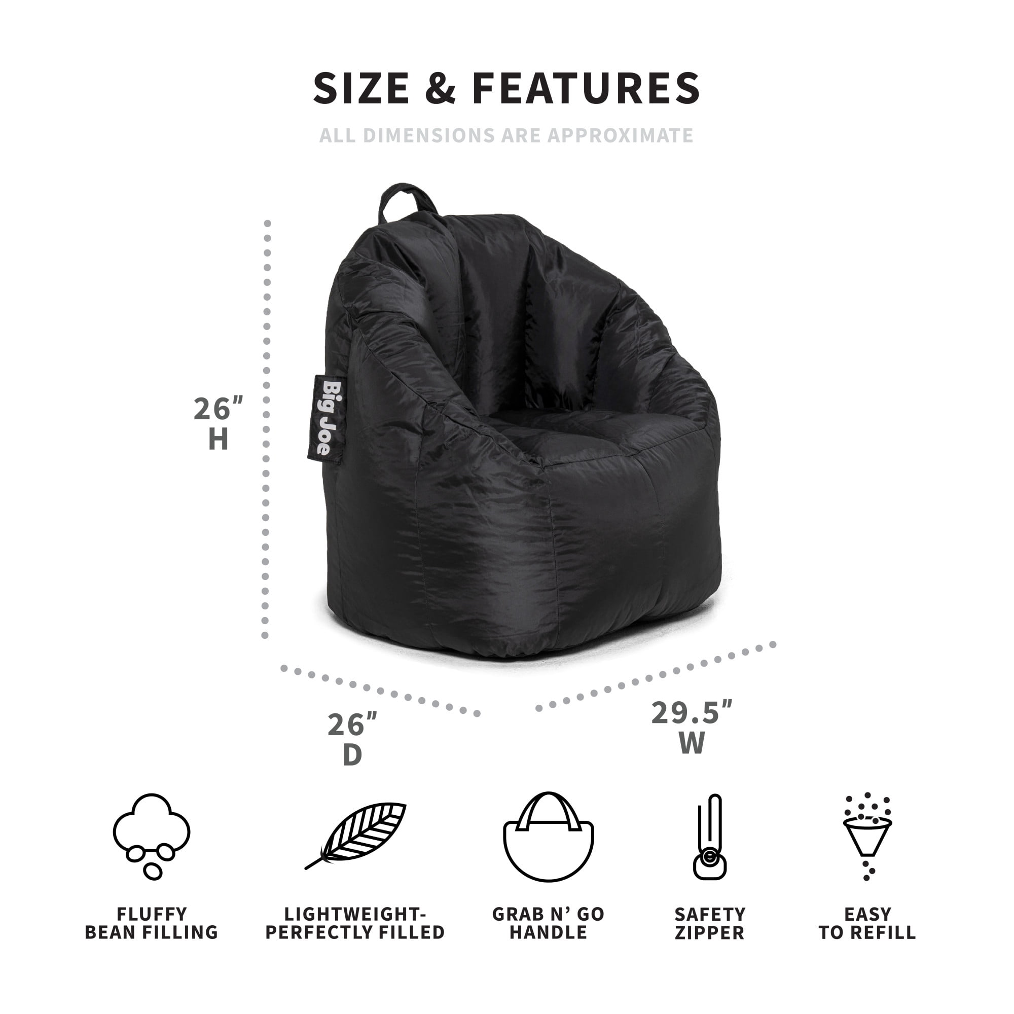 This chair measures approximately 29.5″ W x 26″ D x 26″ H and weighs about 5 lb. Covered in our durable, easy-to-clean, double topstitch SmartMax fabric. The cover is not removable or weatherproof but may be spot cleaned as needed. We purposely fill your bean bag with the perfect amount of beans, because we know an over-filled bean bag is not comfy! Double-stitched with dual zippers for extra safety and durability. Includes an on-the-go handle to easily move your Big Joe from room to room. Every well-loved bean bag compresses over time; refill beans are sold separately so you can give your Big Joe a pick-me-up when needed.