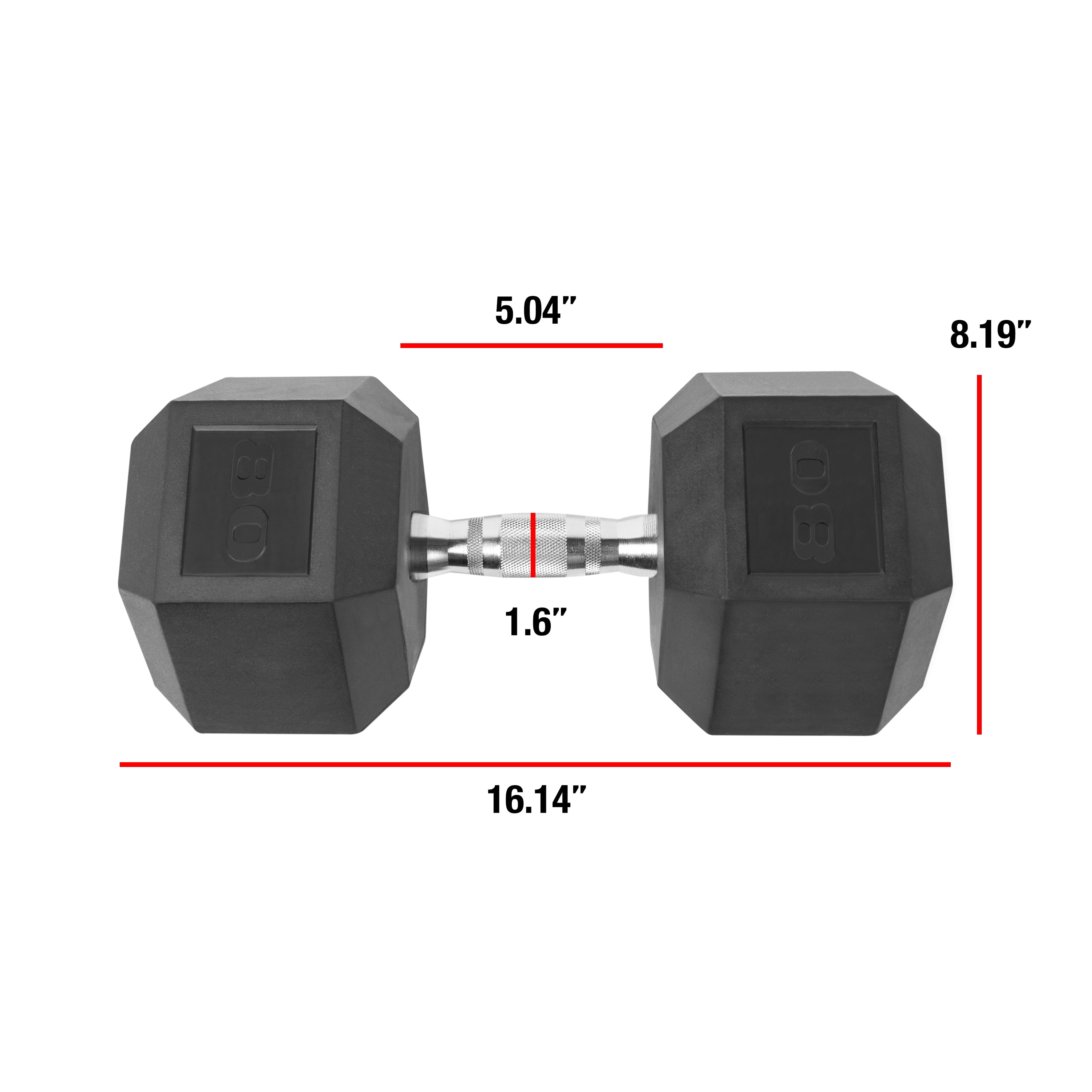 CAP Barbell Coated Hex Dumbbell, Single 80 lb: Sold individually; Available in sizes from 3, 5, 8, 10, 12, 15 – 120 lbs in 5 lb increments Premium quality weights that are built to last and withstand any workout environment Contoured, easy-grip chrome steel handles The medium depth knurling on the ergo handle provides essential grip and security during use Hexagon shaped heads are designed to prevent rolling and provide easier storage Protective coating on the heads prevent damage to floors Perfect for isolations, full body, functional and HIIT workouts 30-day limited manufacturer warranty